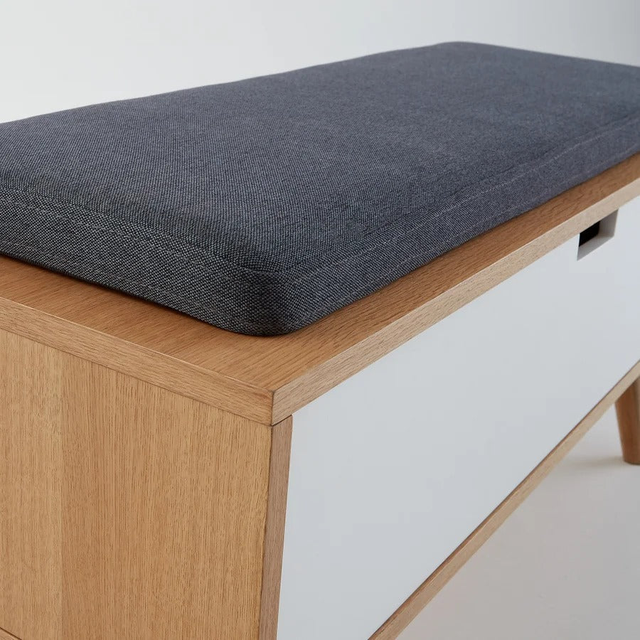 This shoe bench features a minimalist wooden structure with two spacious compartments that help keep everyday footwear arranged and accessible. The front panel opens smoothly to reveal the storage space, making it easy to place or remove shoes. A soft cushioned seat on top provides a comfortable spot for sitting while getting ready. Supported by angled wooden legs, the bench adds a simple and modern touch to interior spaces, blending well with contemporary home décor.