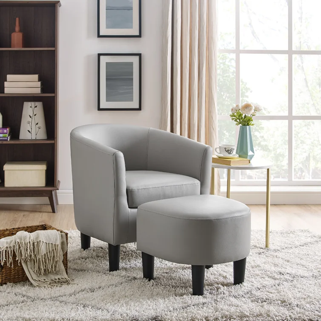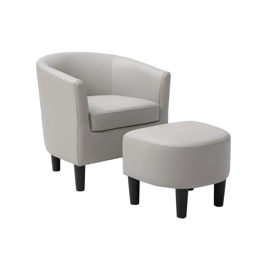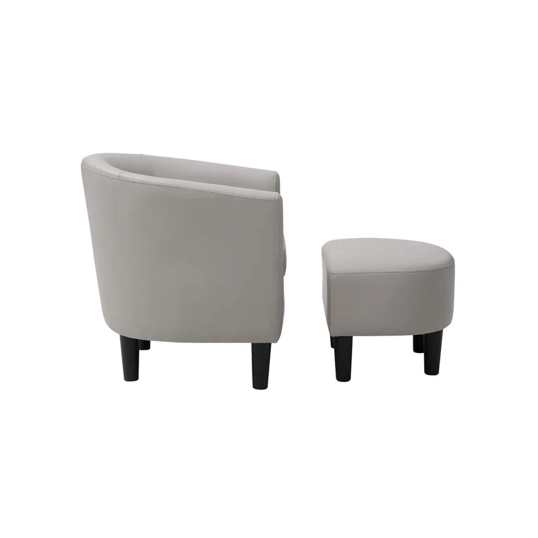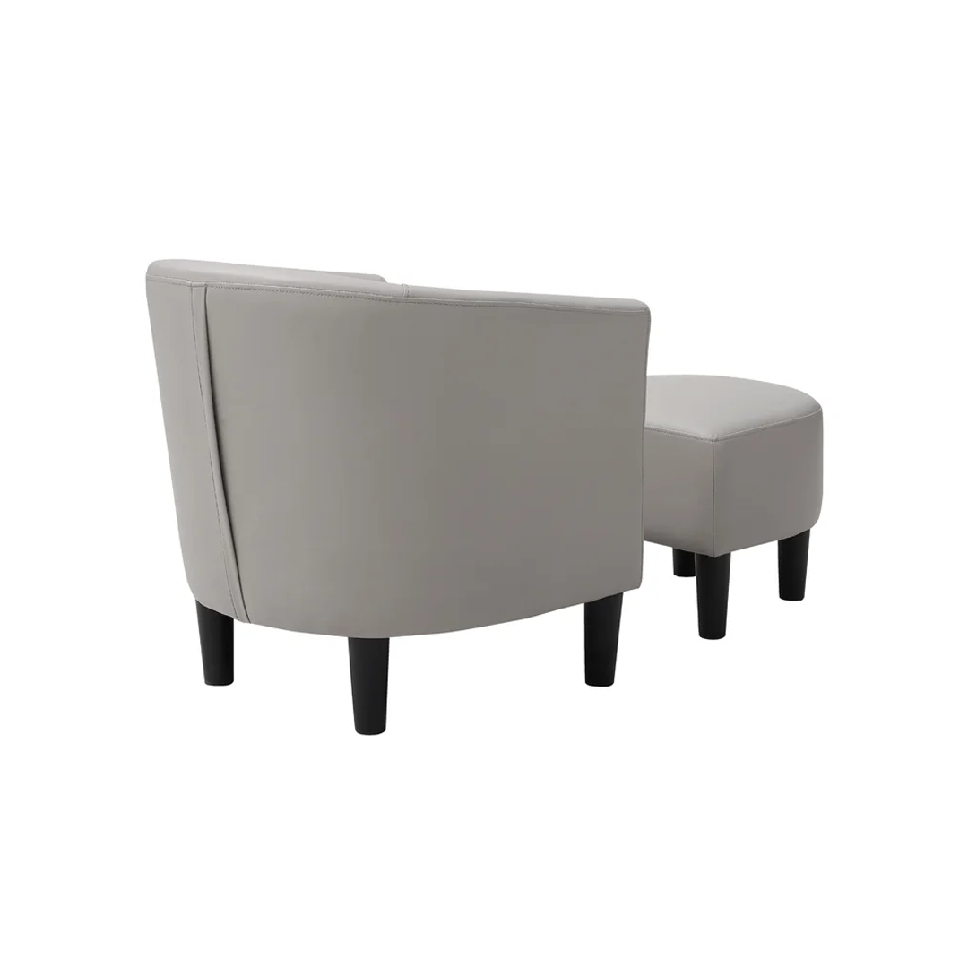 This armchair and ottoman set creates an ideal reading nook with a sleek, modern look. The chair is crafted with a kiln-dried engineered wood frame that sits on resin cylindrical legs with a dark finish. It features square arms and a tight back.