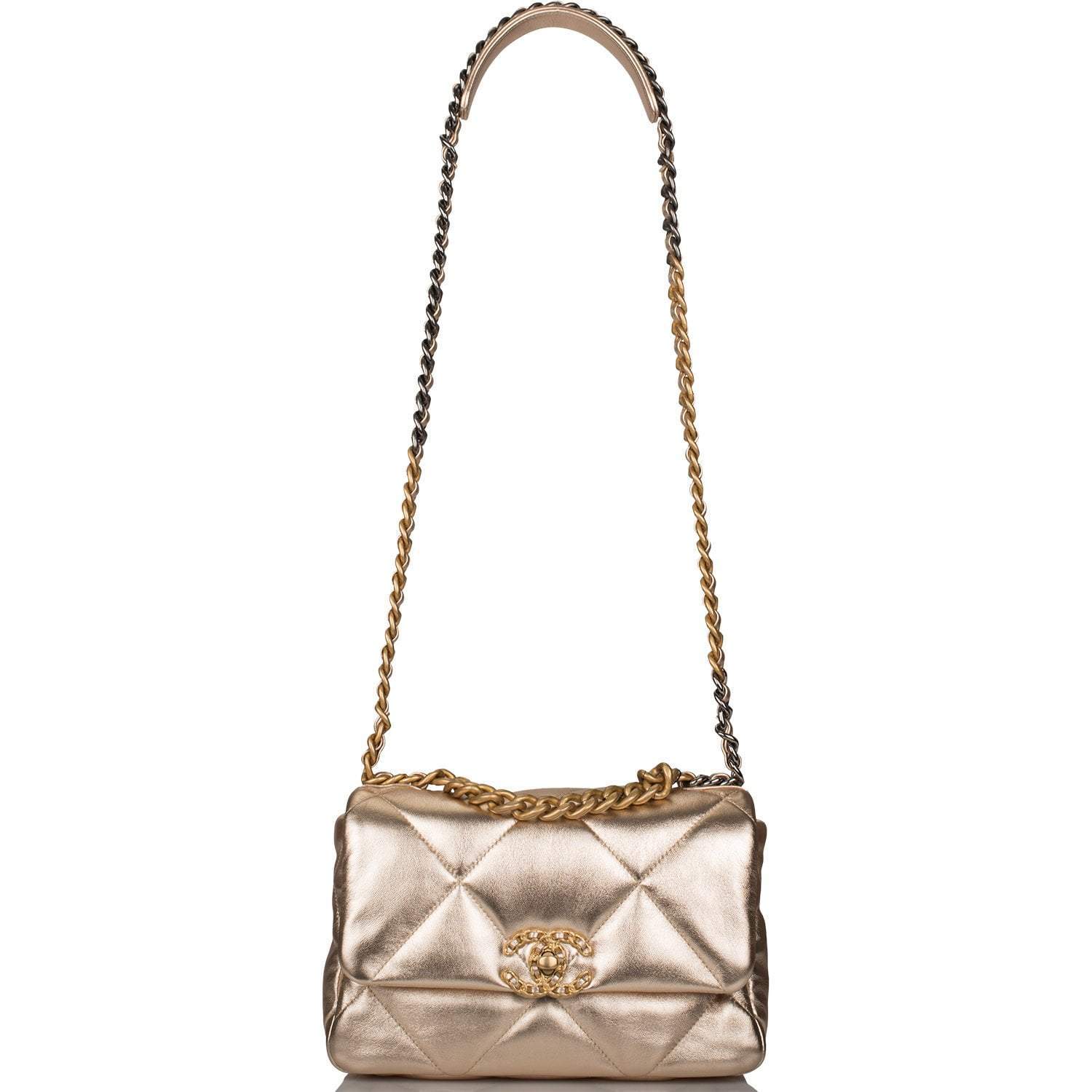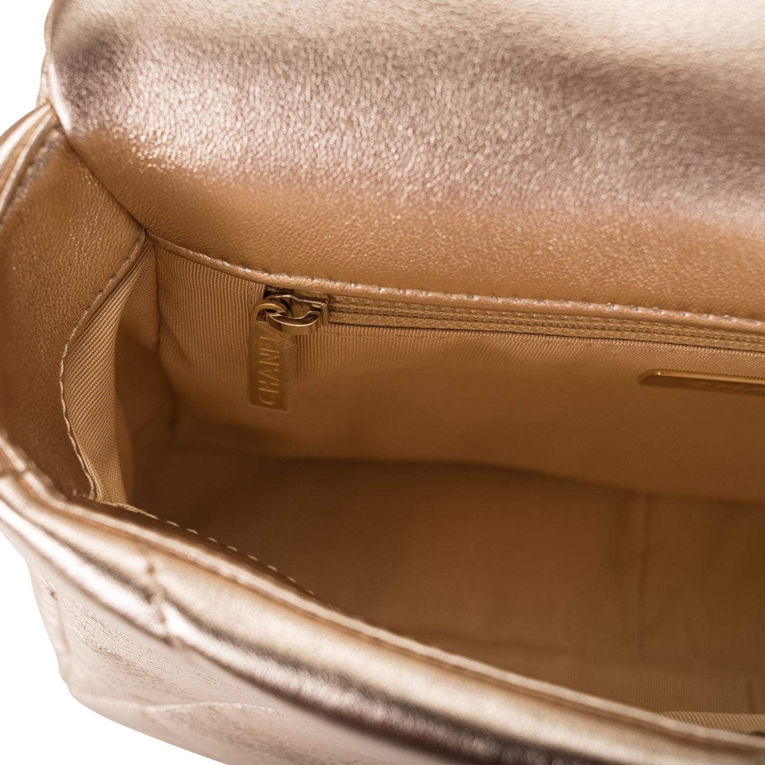 This Medium 19 Flap bag is of gold metallic lambskin with mixed metal hardware and has the signature diamond quilting, signature CC interlocking closure, exterior back pocket, chain top handle, and long mixed metal and gold metallic leather chain.
