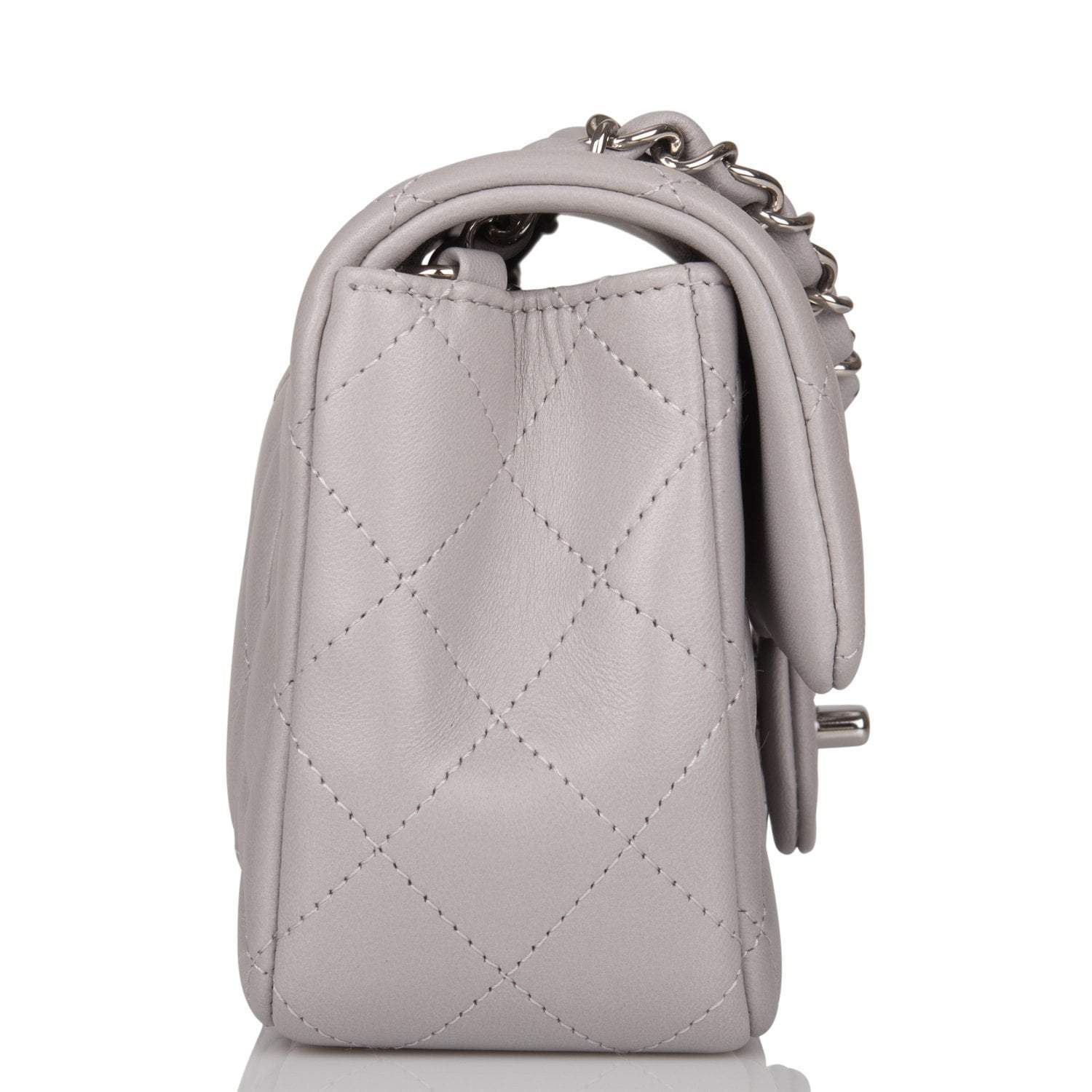 This Mini Rectangular flap bag is of light grey lambskin leather with silver tone hardware and has a front flap with signature CC turnlock closure, rear half moon pocket, single interwoven light grey leather and silver tone chain link shoulder/crossbody strap.