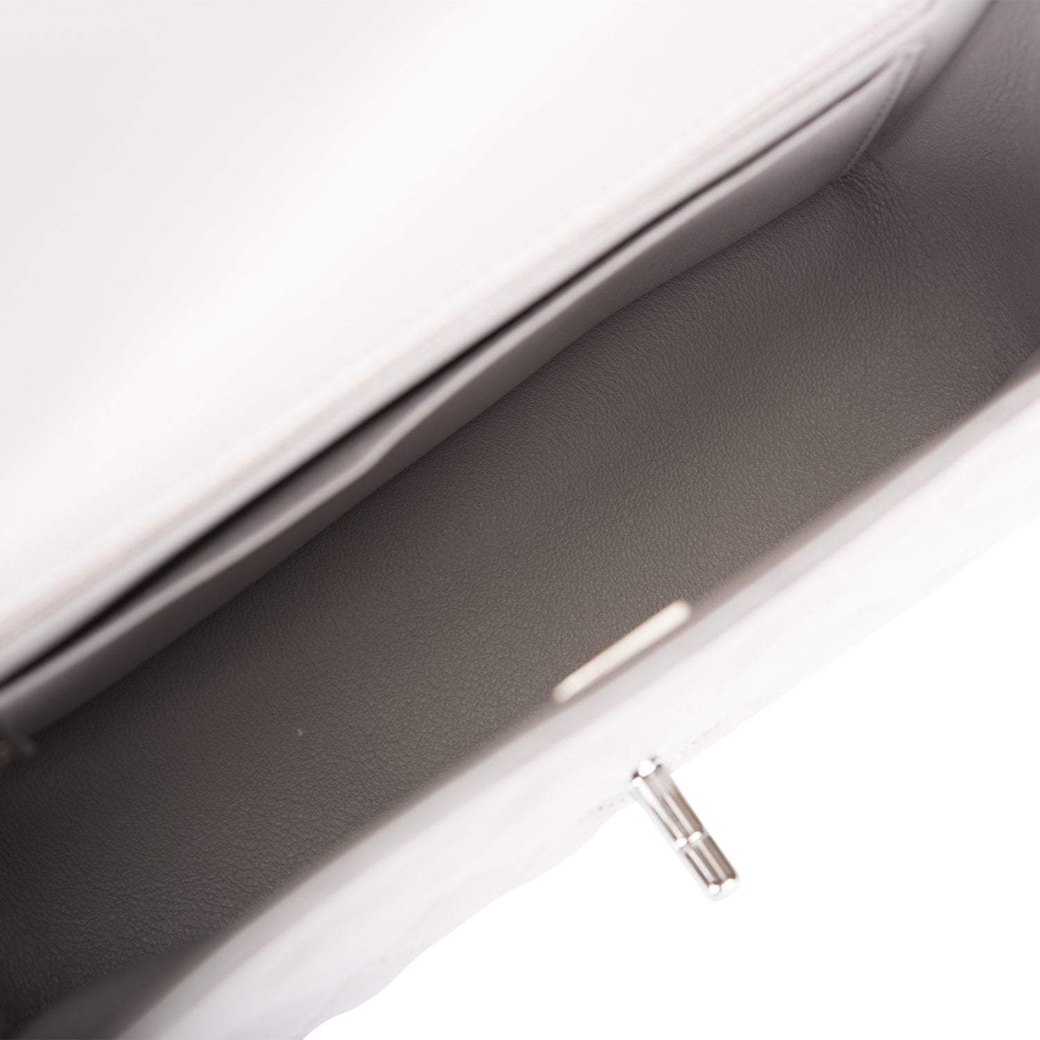 The interior is lined in light grey leather and features a zipper pocket with Chanel pull and an open pocket below.