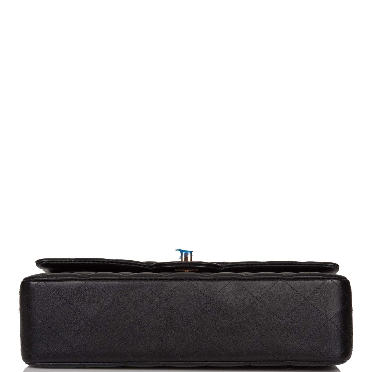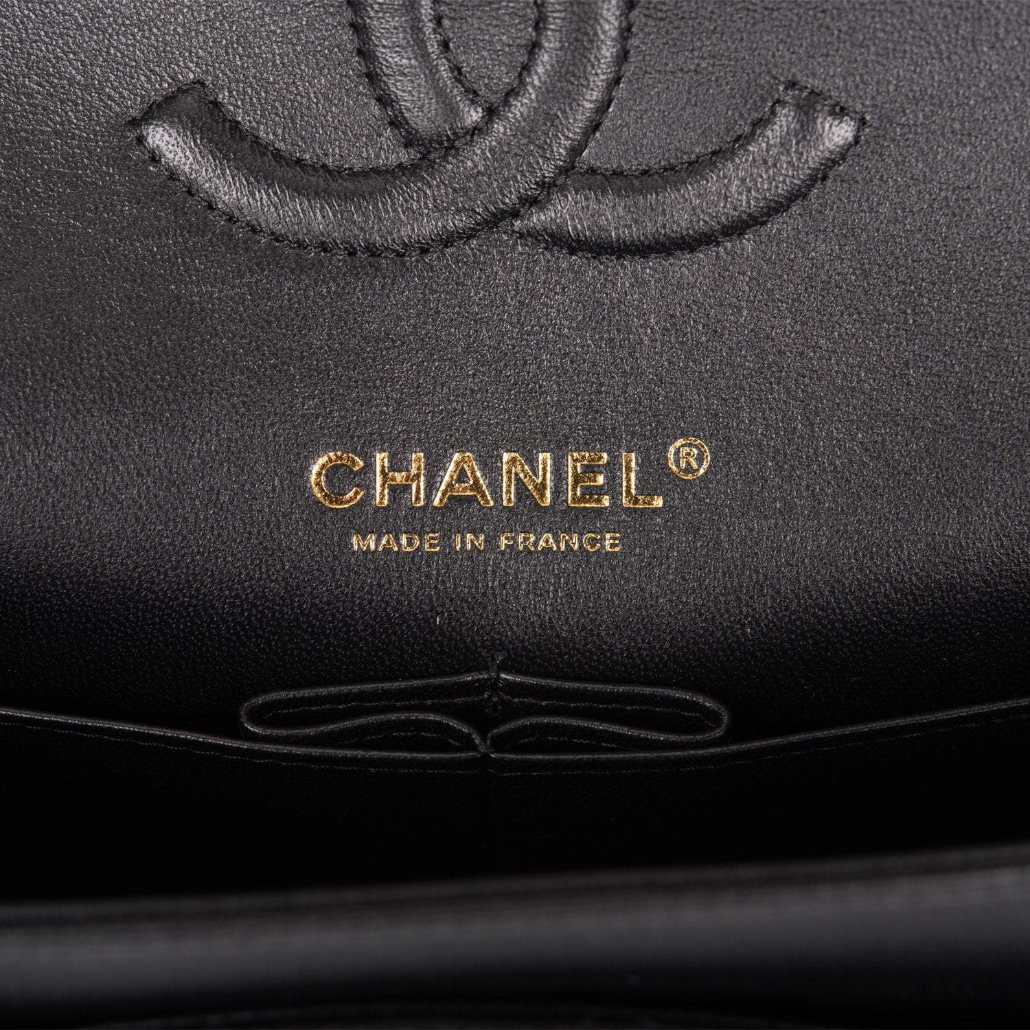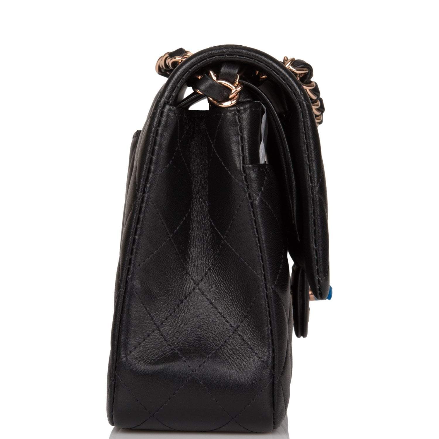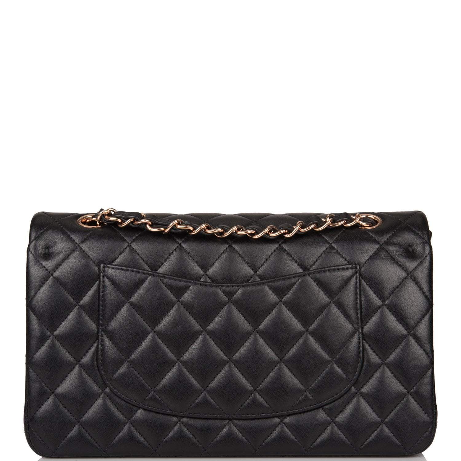 This Medium Classic Double Flap bag is in black lambskin leather with rose gold tone hardware and features a front flap with signature CC turnlock closure, half moon back pocket, and adjustable interwoven rose gold tone chain link and black leather shoulder strap.
