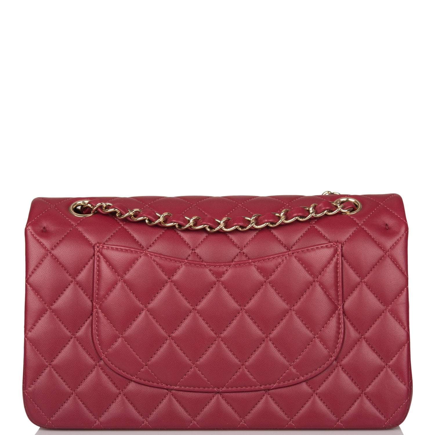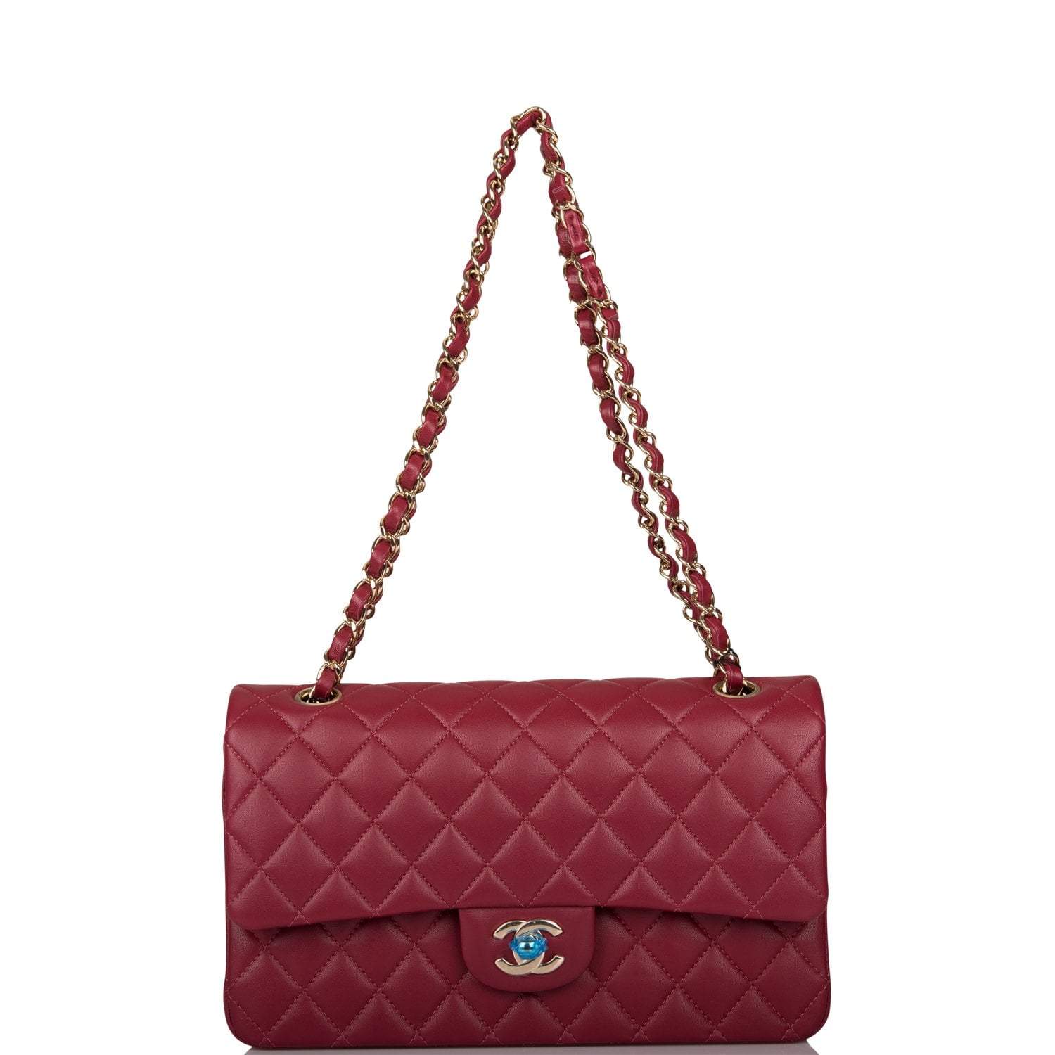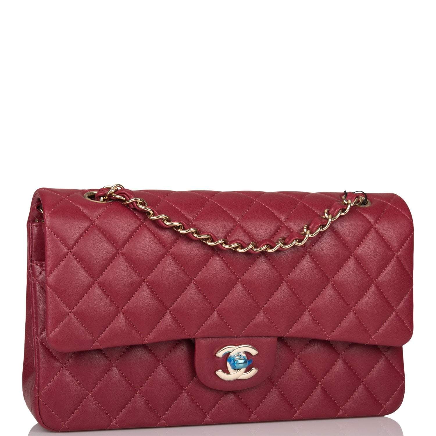 This Medium Classic Double Flap bag is in burgundy lambskin leather with light gold tone hardware and features a front flap with signature CC turnlock closure, half moon back pocket, and adjustable interwoven light gold tone chain link and burgundy leather shoulder strap.