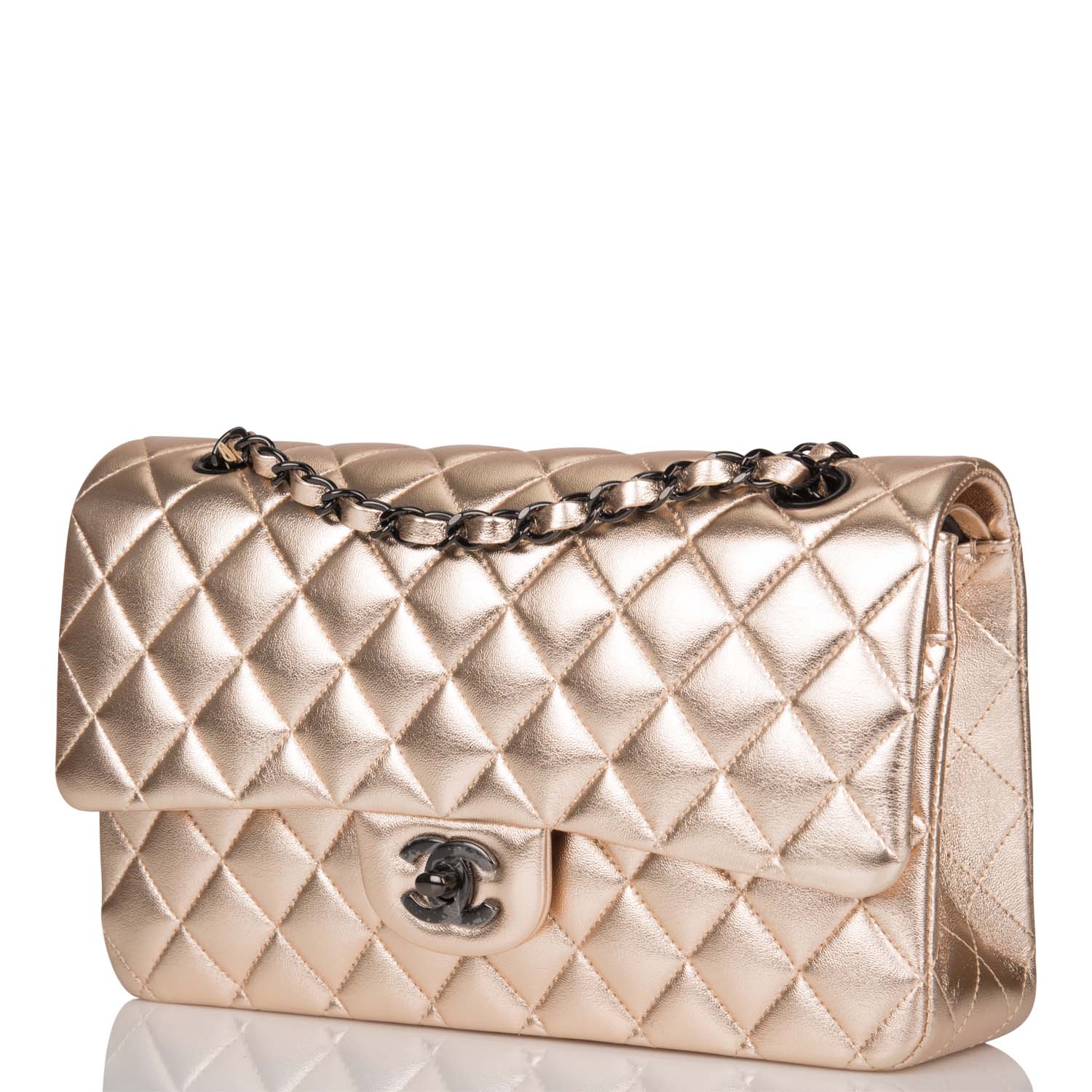 This Medium Classic Double Flap bag is in metallic gold lambskin leather with black tone hardware and features a front flap with signature CC turnlock closure, half moon back pocket, and adjustable interwoven black tone chain link and metallic gold leather shoulder strap.