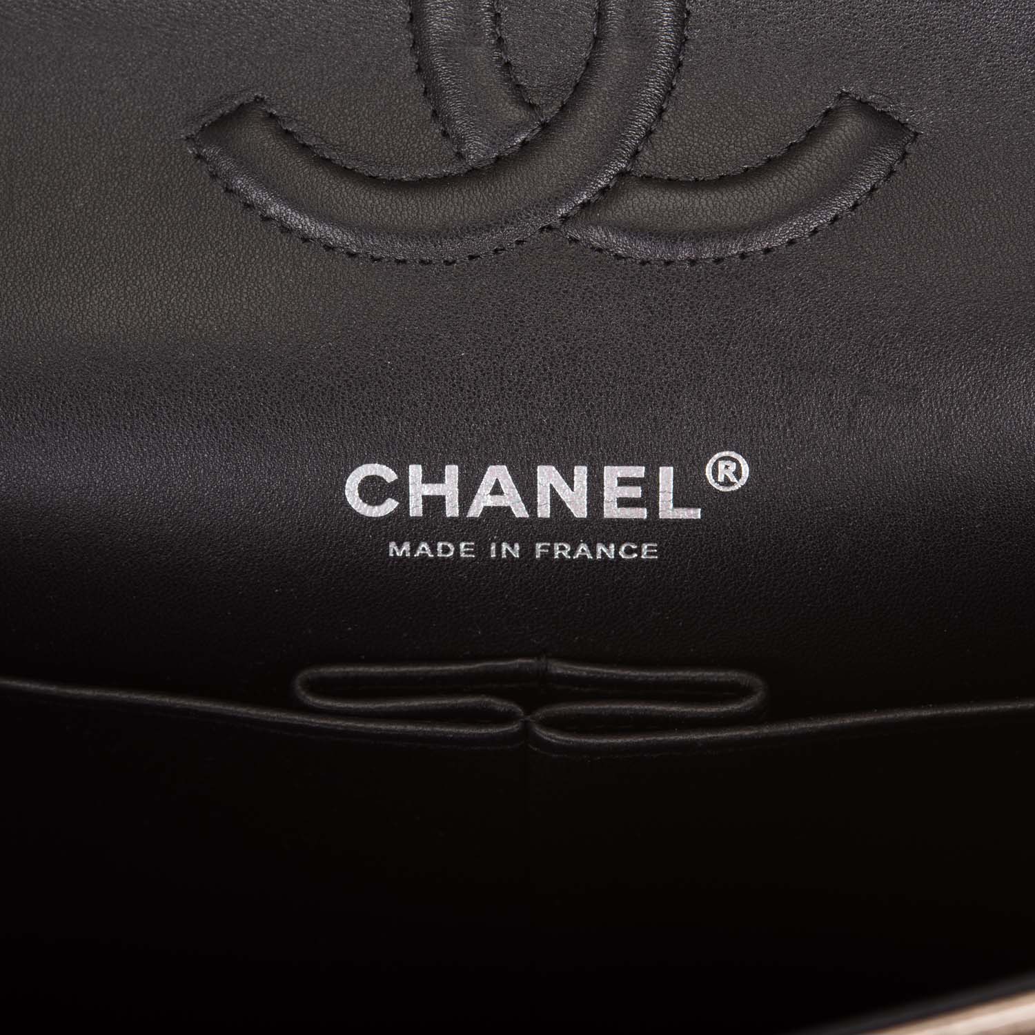 The interior is lined in black leather with the “love letter” zipper compartment under the first flap, an “outer” slit pocket is under the second flap, and an interior compartment with two open pockets separated by a “lipstick” compartment.