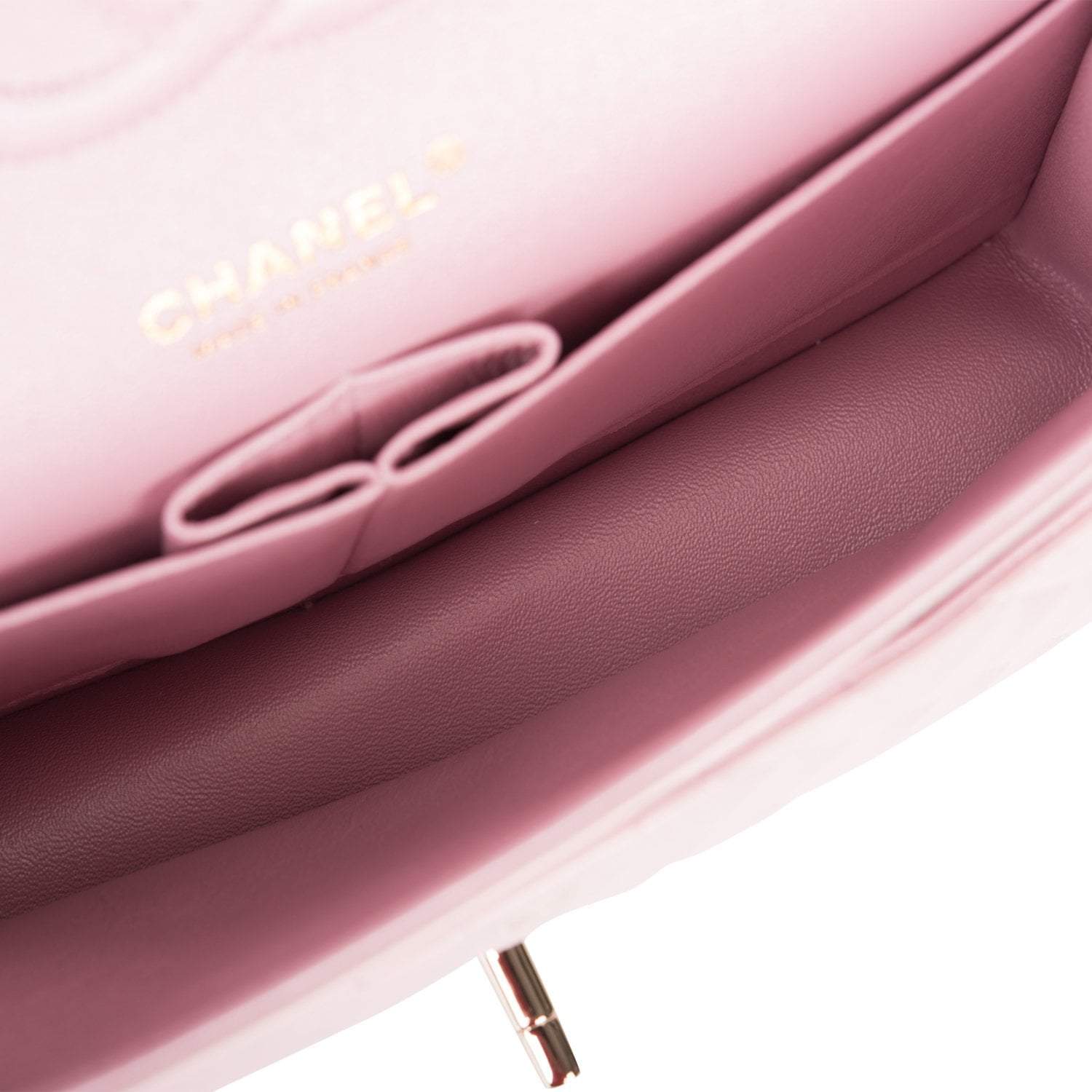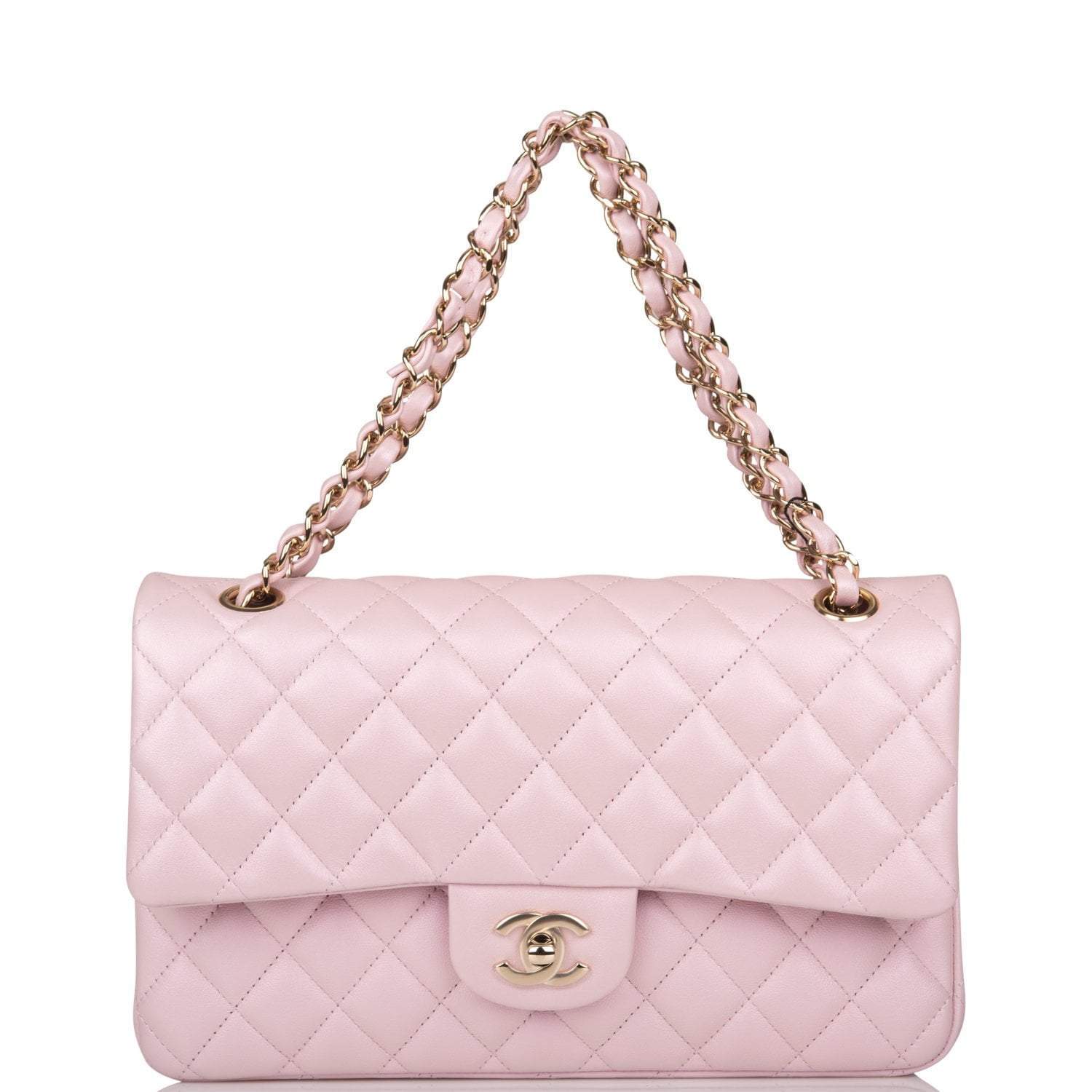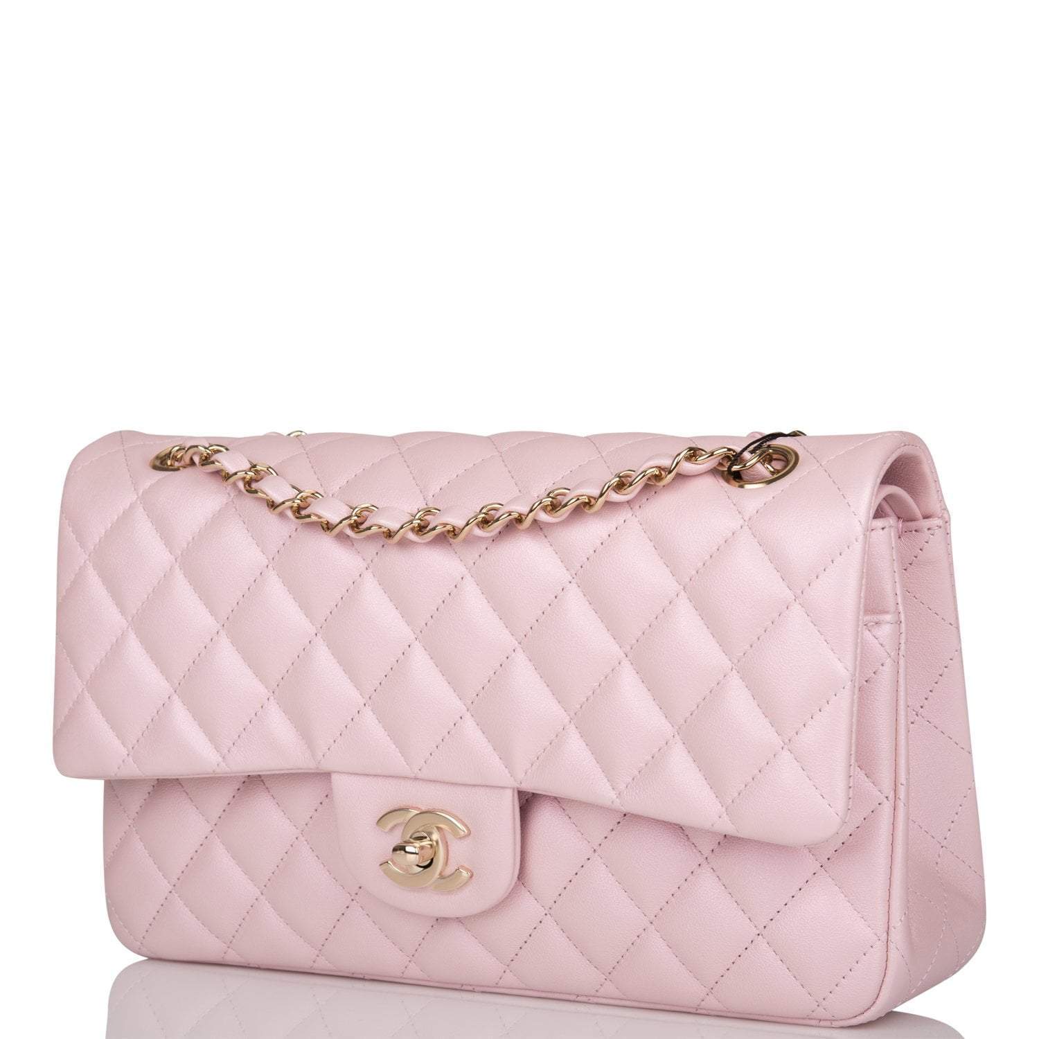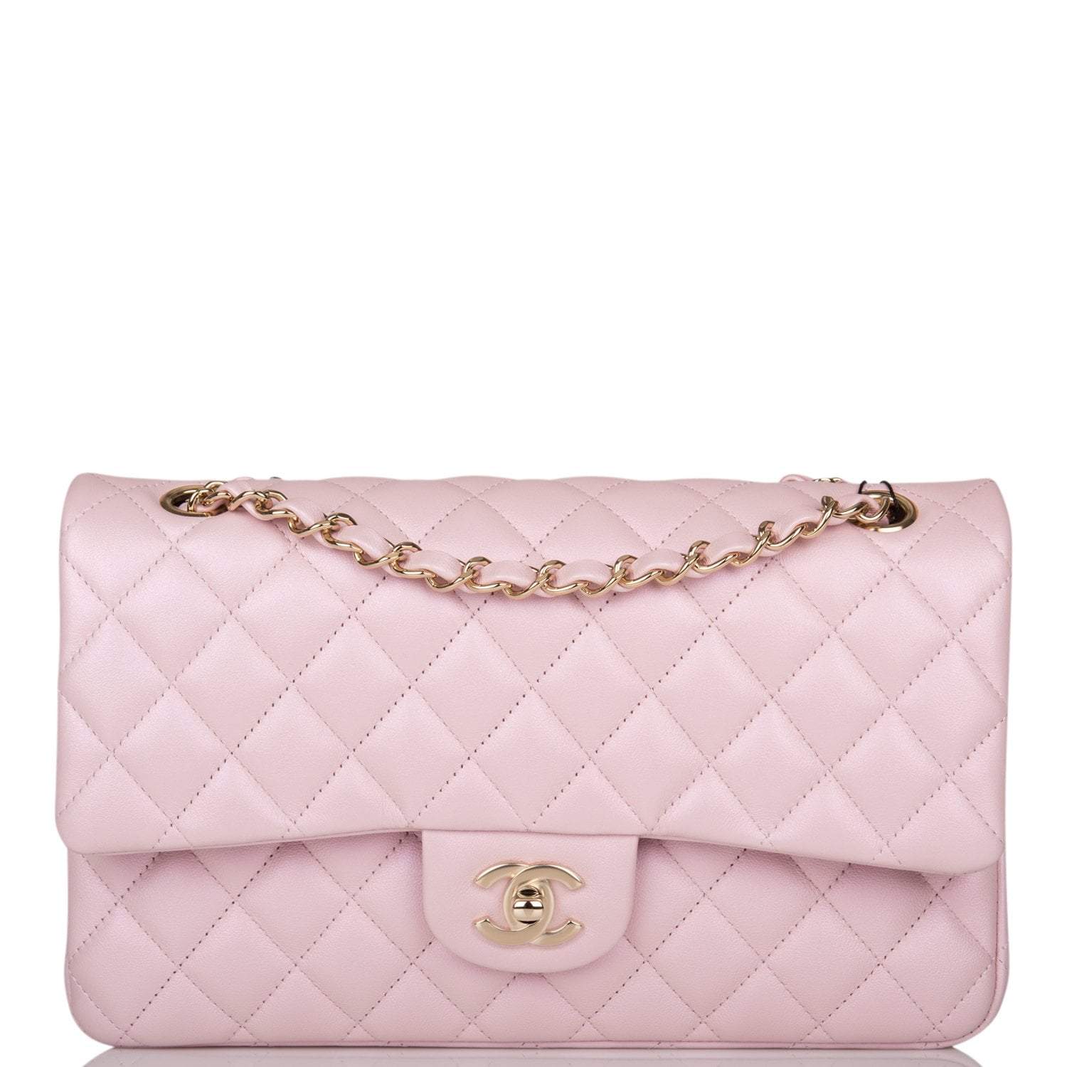 This Medium Classic Double Flap bag is in pink iridescent lambskin leather with light gold tone hardware and features a front flap with signature CC turnlock closure, half moon back pocket, and adjustable interwoven light gold tone chain link and pink leather shoulder strap.