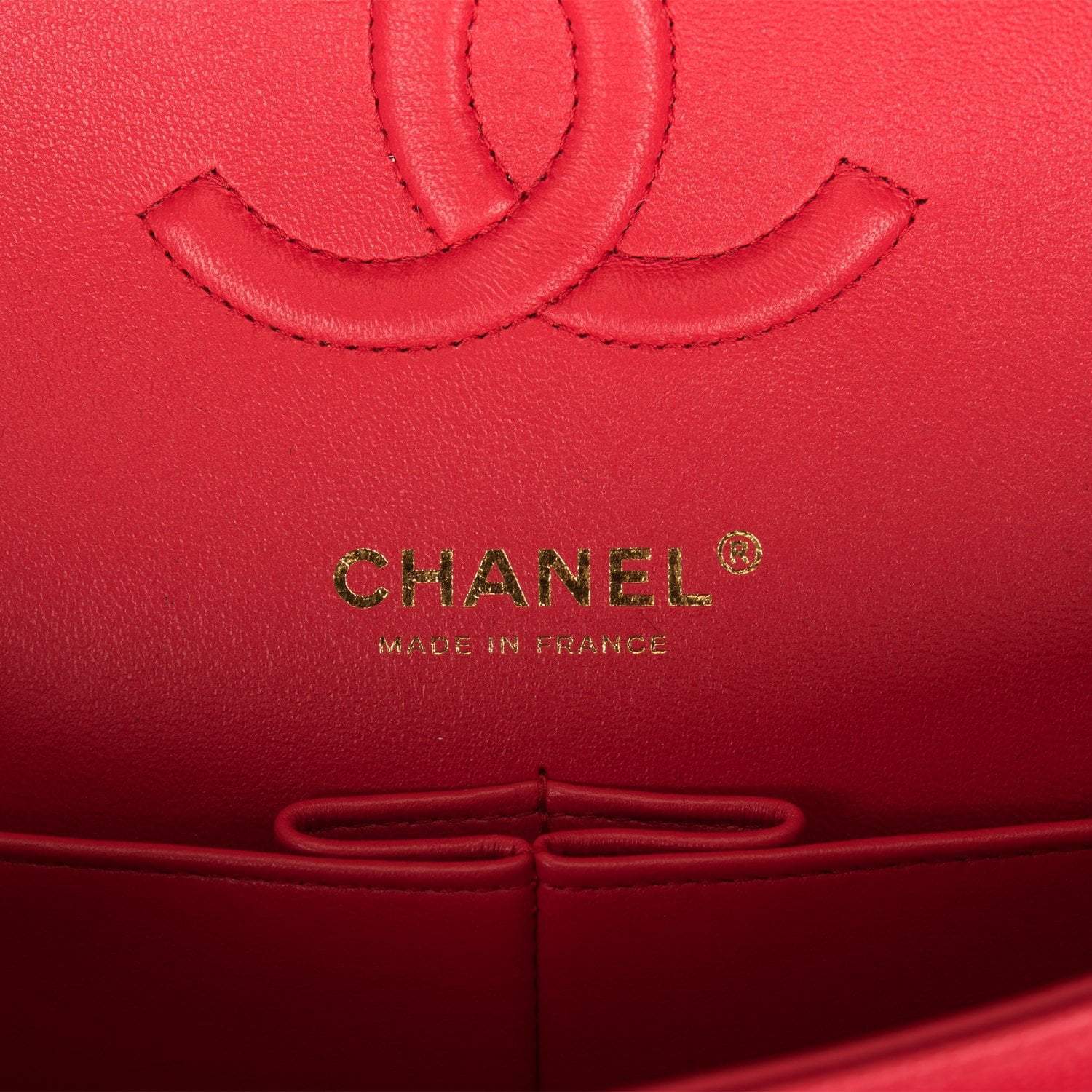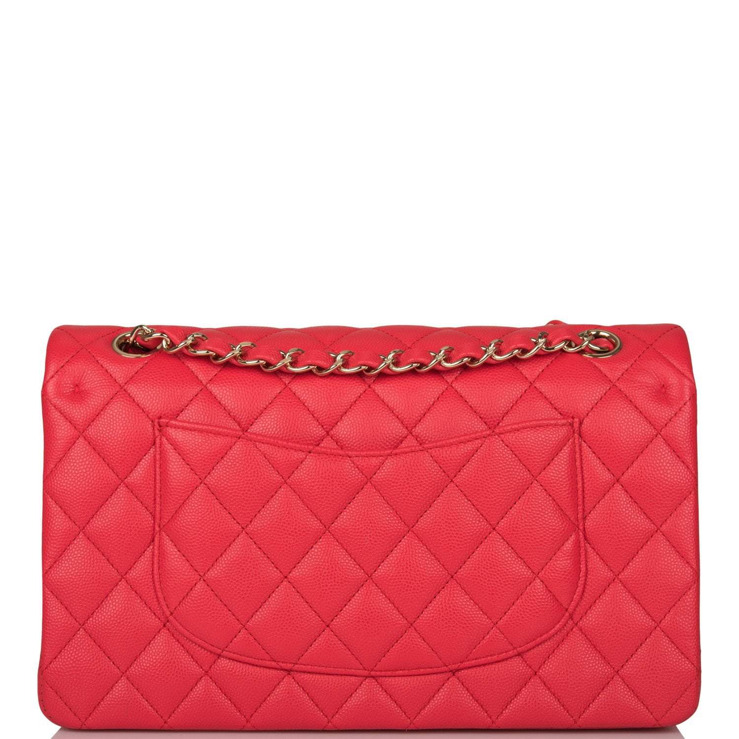 This Medium Classic Double Flap bag is in red caviar leather with light gold tone hardware and features a front flap with signature CC turnlock closure, half moon back pocket, and adjustable interwoven light gold tone chain link and red leather shoulder strap.