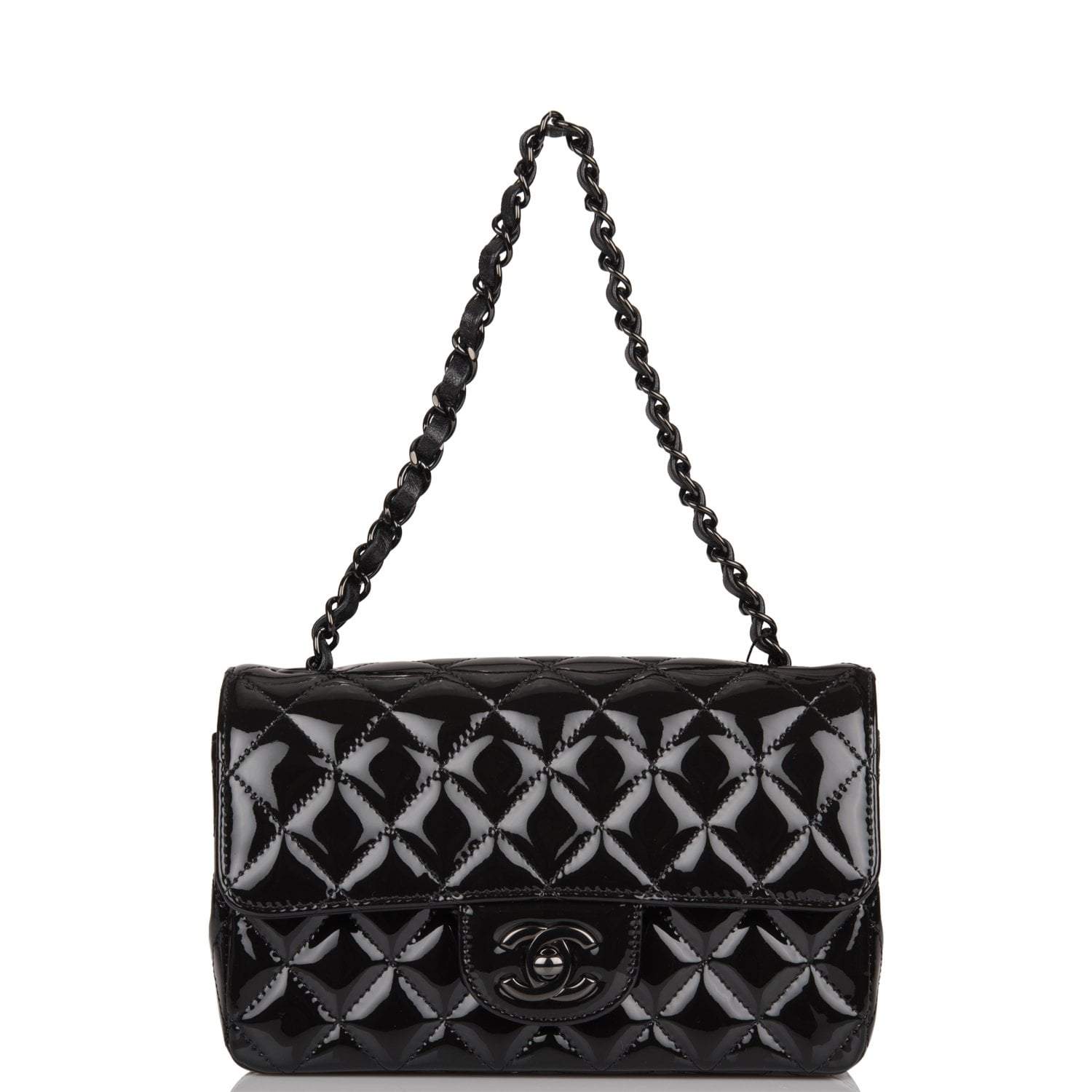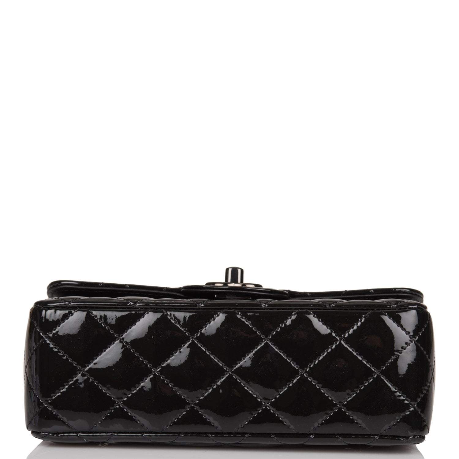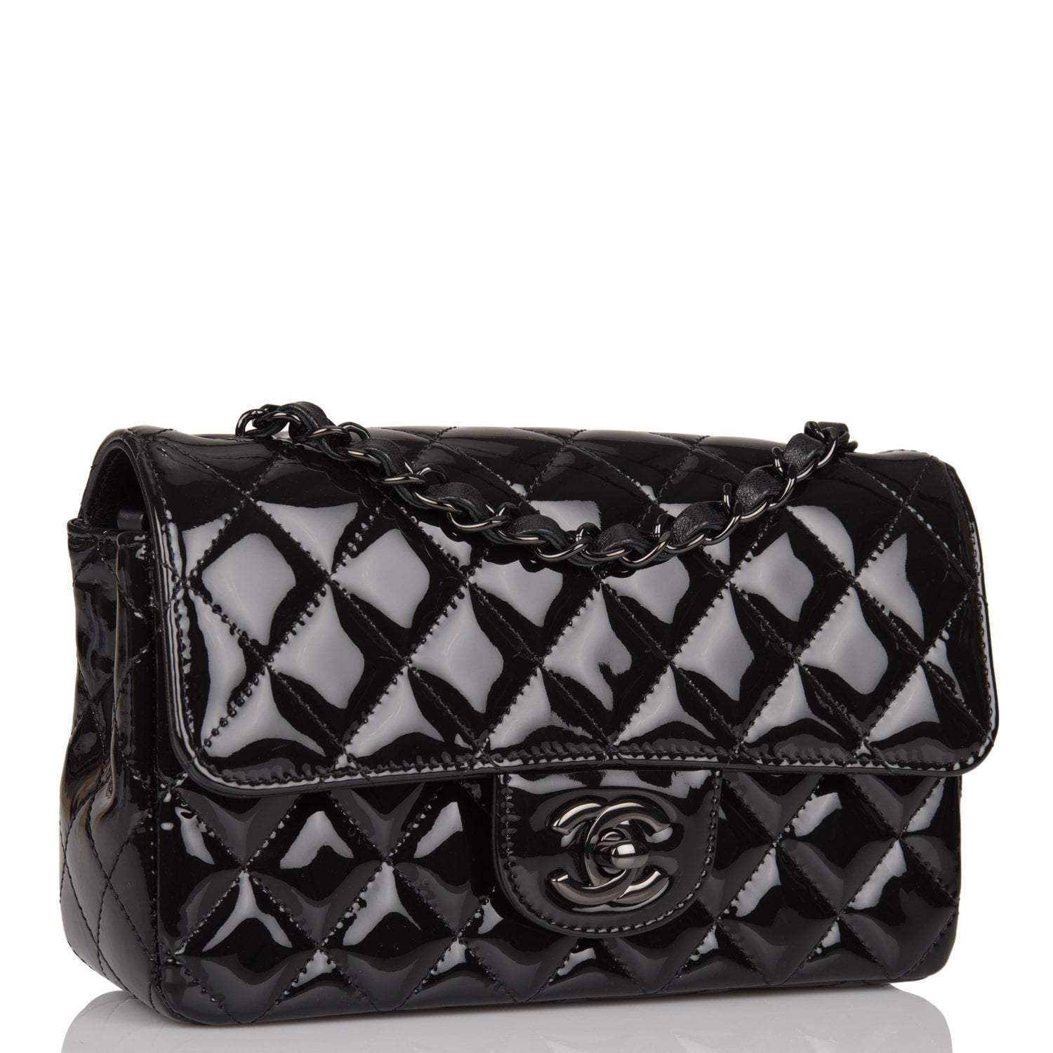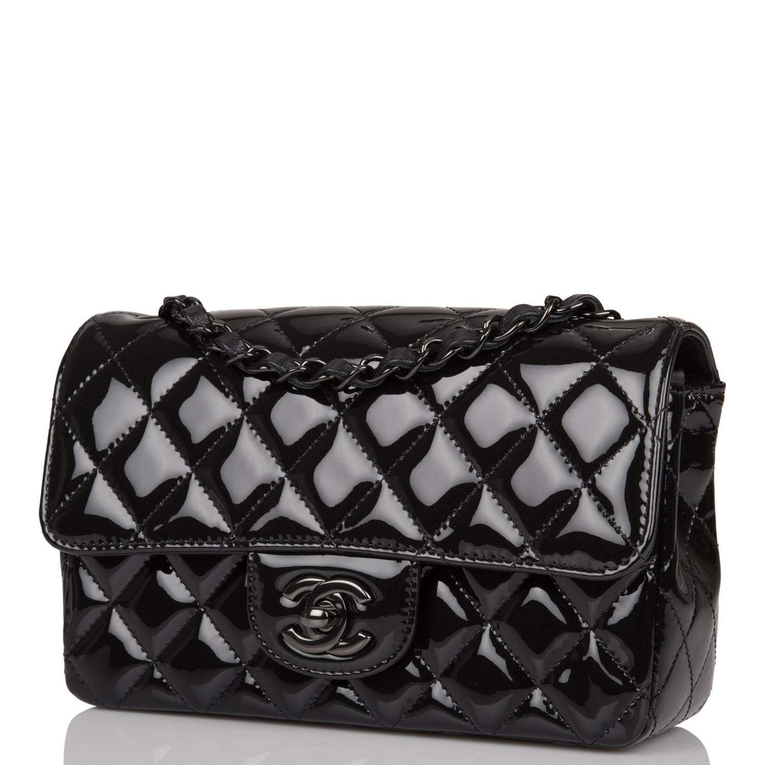 This Mini Rectangular flap bag is of black patent leather with black hardware and has a front flap with signature CC turnlock closure, rear half moon pocket, single interwoven black leather and black chain link shoulder/crossbody strap.