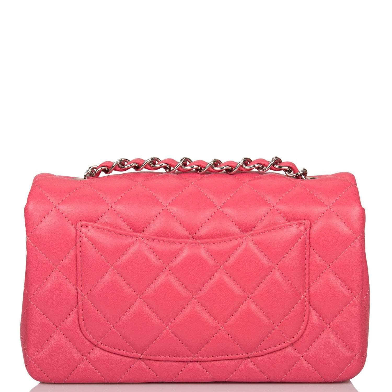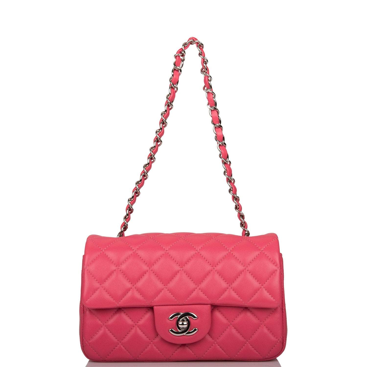This Mini Rectangular flap bag is of pink lambskin leather with silver tone hardware and has a front flap with signature CC turnlock closure, rear half moon pocket, single interwoven pink leather and silver tone chain link shoulder/crossbody strap.