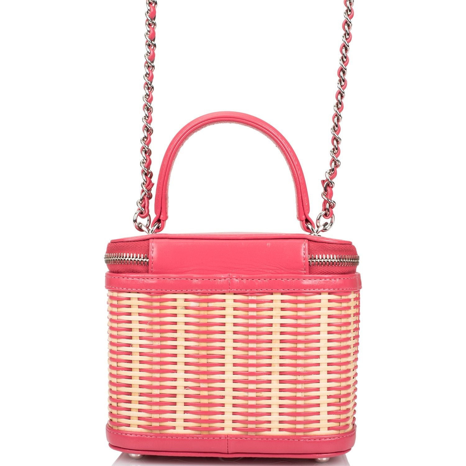 This Vanity Case is in pink leather and rattan with silver tone hardware and features a CC logo on the front, a top handle, and an interwoven silver tone chain link with pink leather shoulder strap.