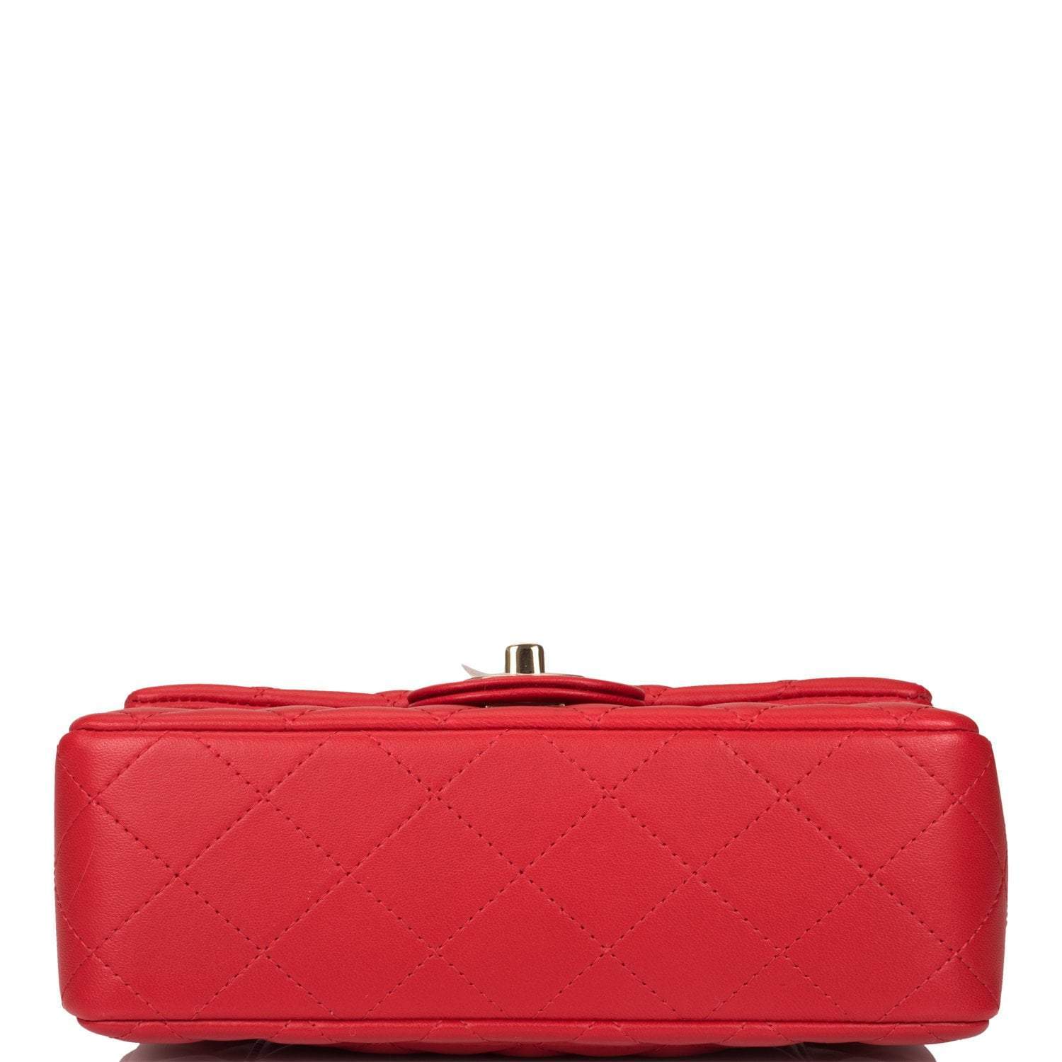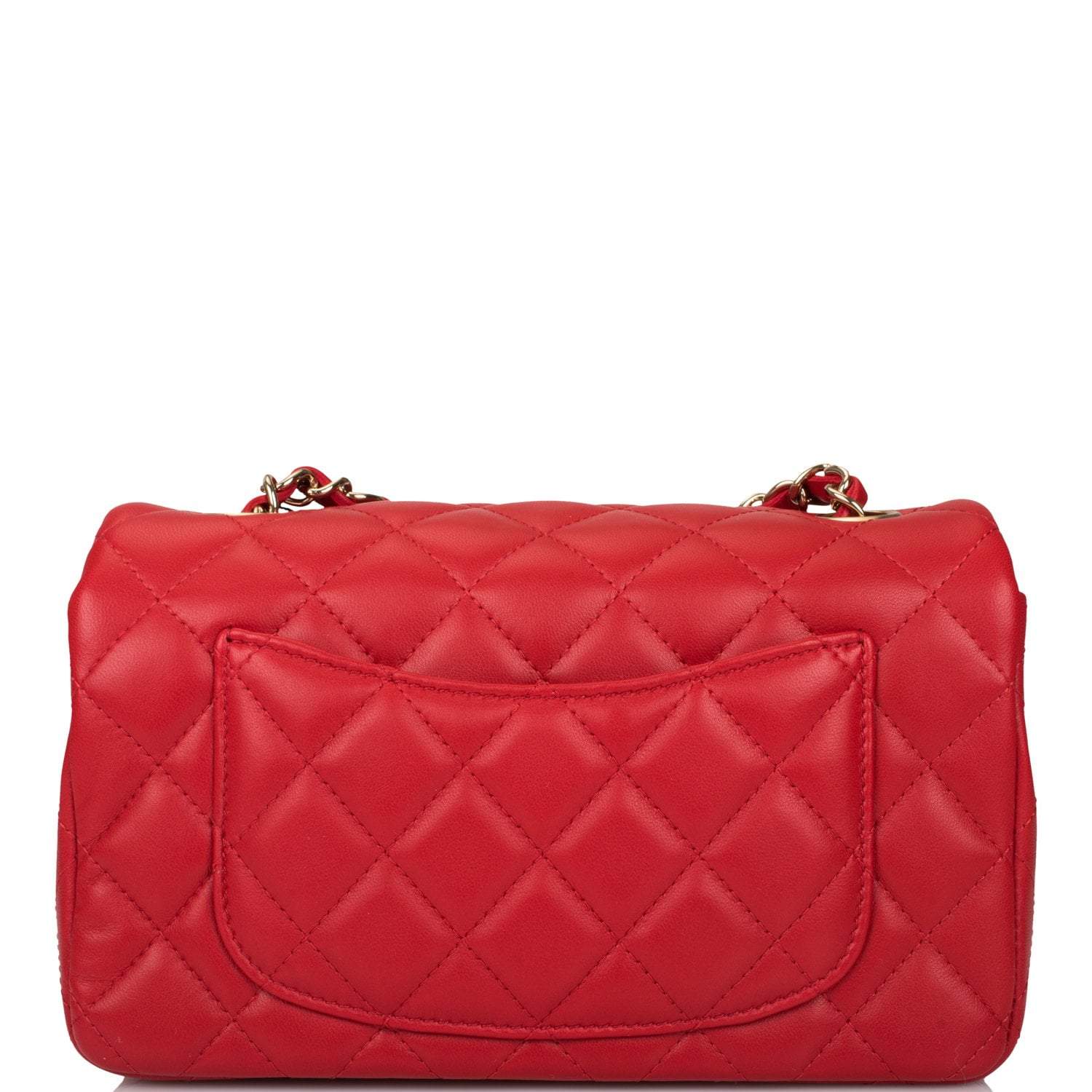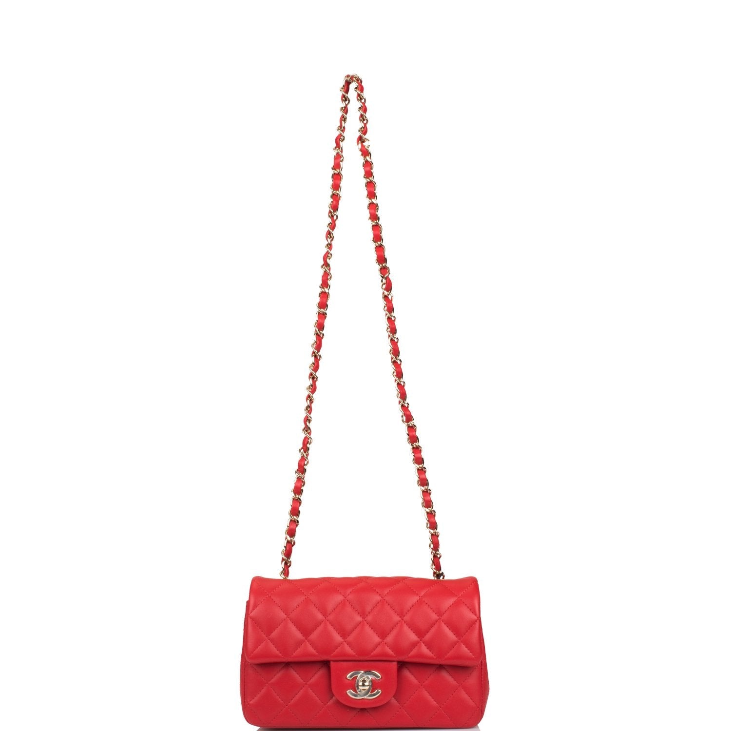 This Mini Rectangular flap bag is of red lambskin with light gold tone hardware and has a front flap with signature CC turnlock closure, rear half moon pocket, single interwoven red leather and light gold tone chain link shoulder/crossbody strap.