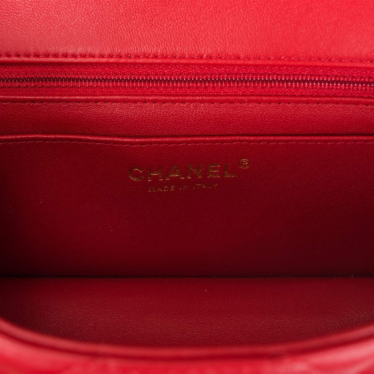 The interior is lined in red leather and features a zipper pocket with Chanel pull and an open pocket below.