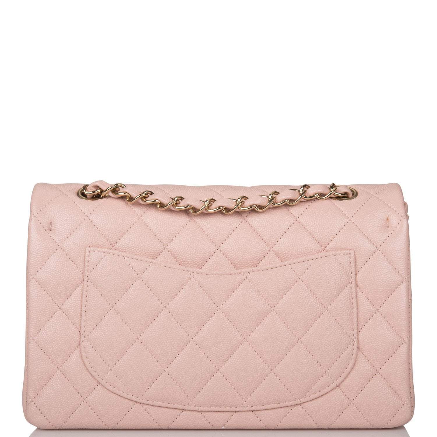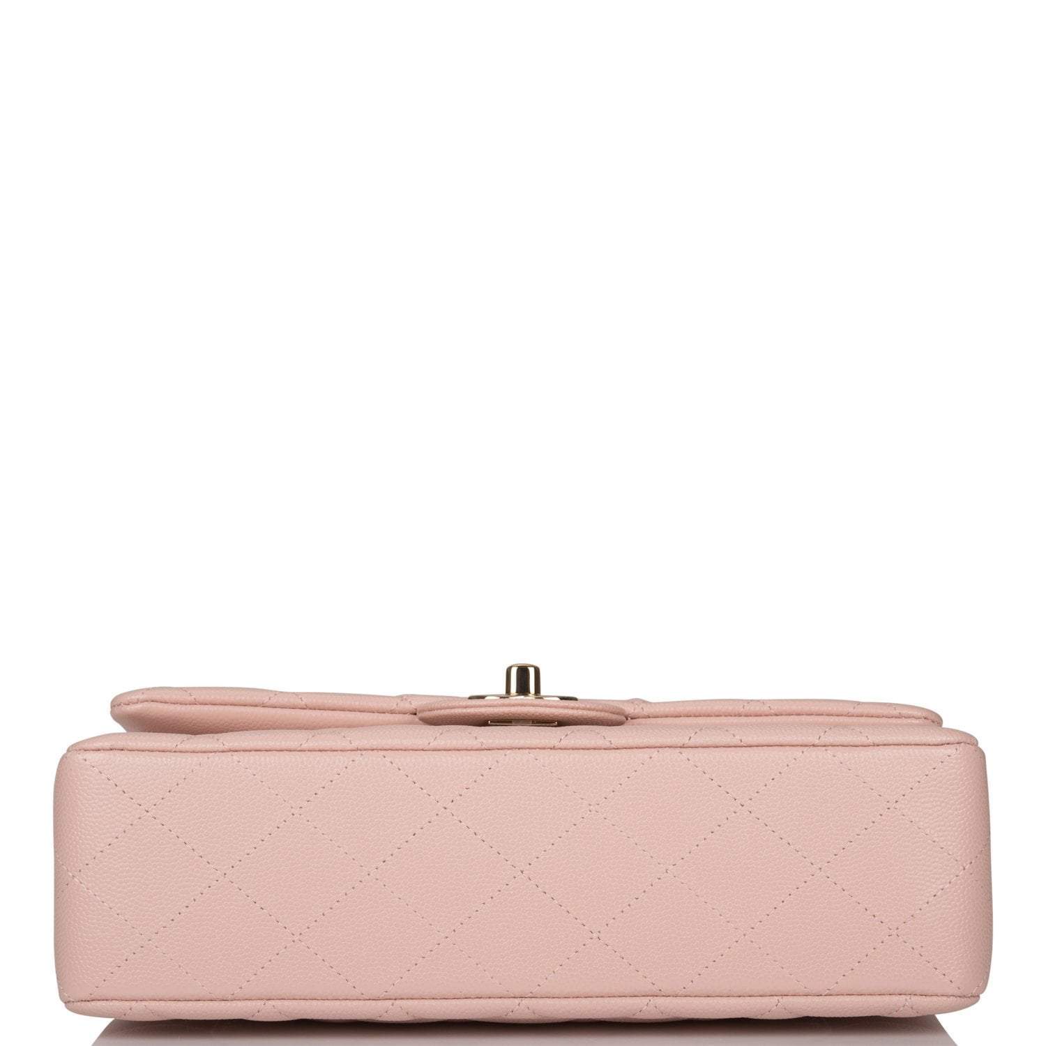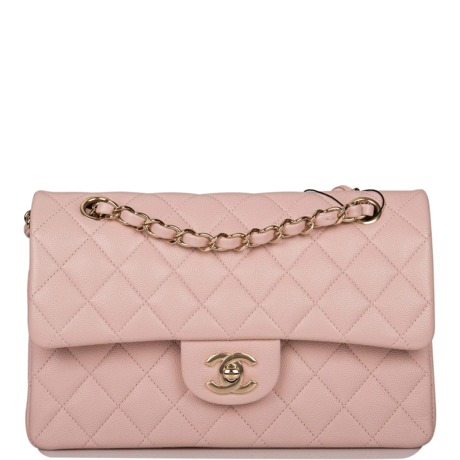 This Small Classic Double Flap bag is in rose clair (pale pink) caviar leather with light gold tone hardware and features a front flap with signature CC turnlock closure, half moon back pocket, and adjustable interwoven light gold tone chain link and rose clair leather shoulder strap.