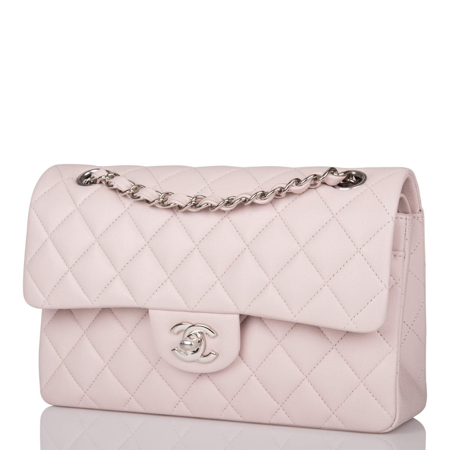 This Small Classic Double Flap bag is in light purple lambskin leather with silver tone hardware and features a front flap with signature CC turnlock closure, half moon back pocket, and adjustable interwoven silver tone chain link and light purple leather shoulder strap.