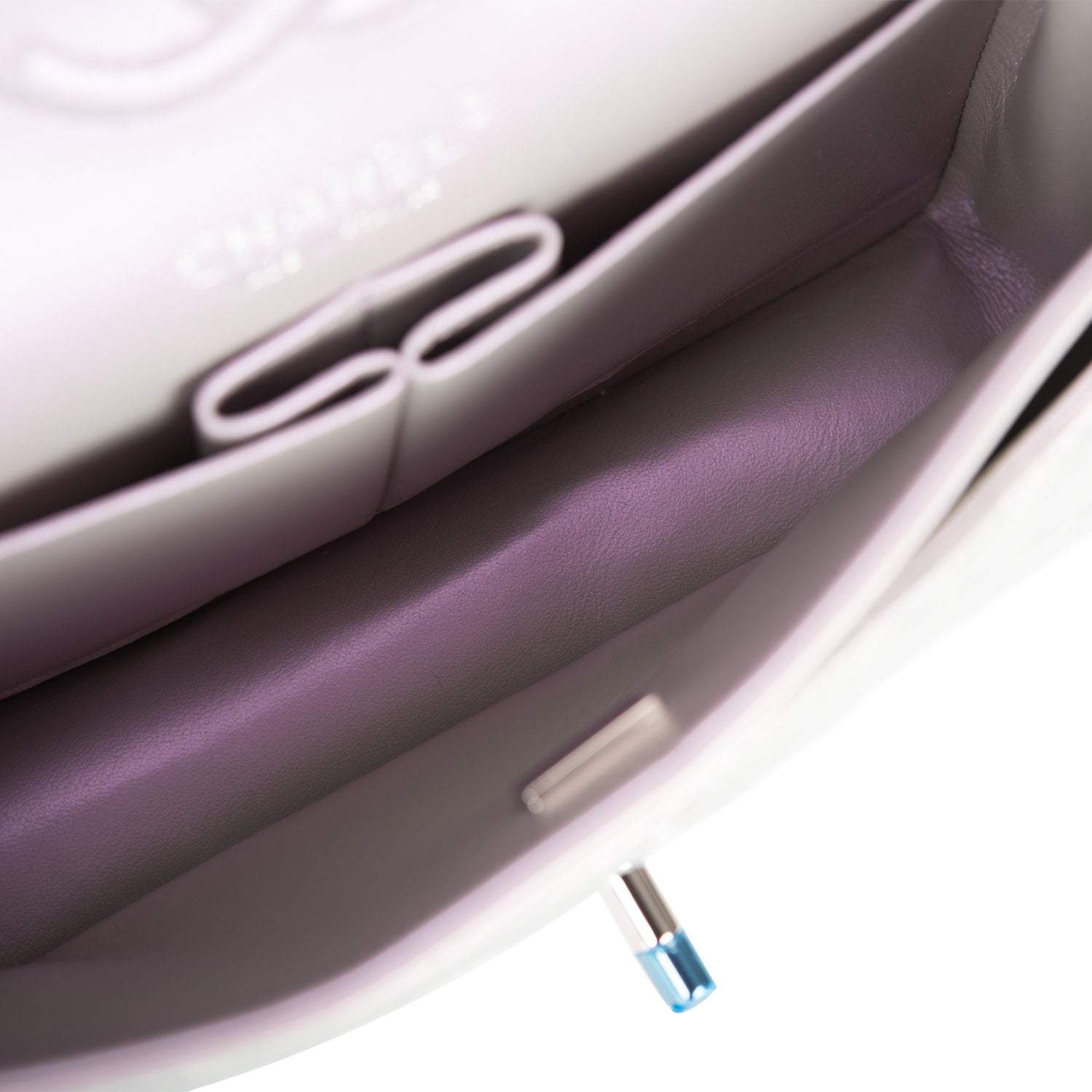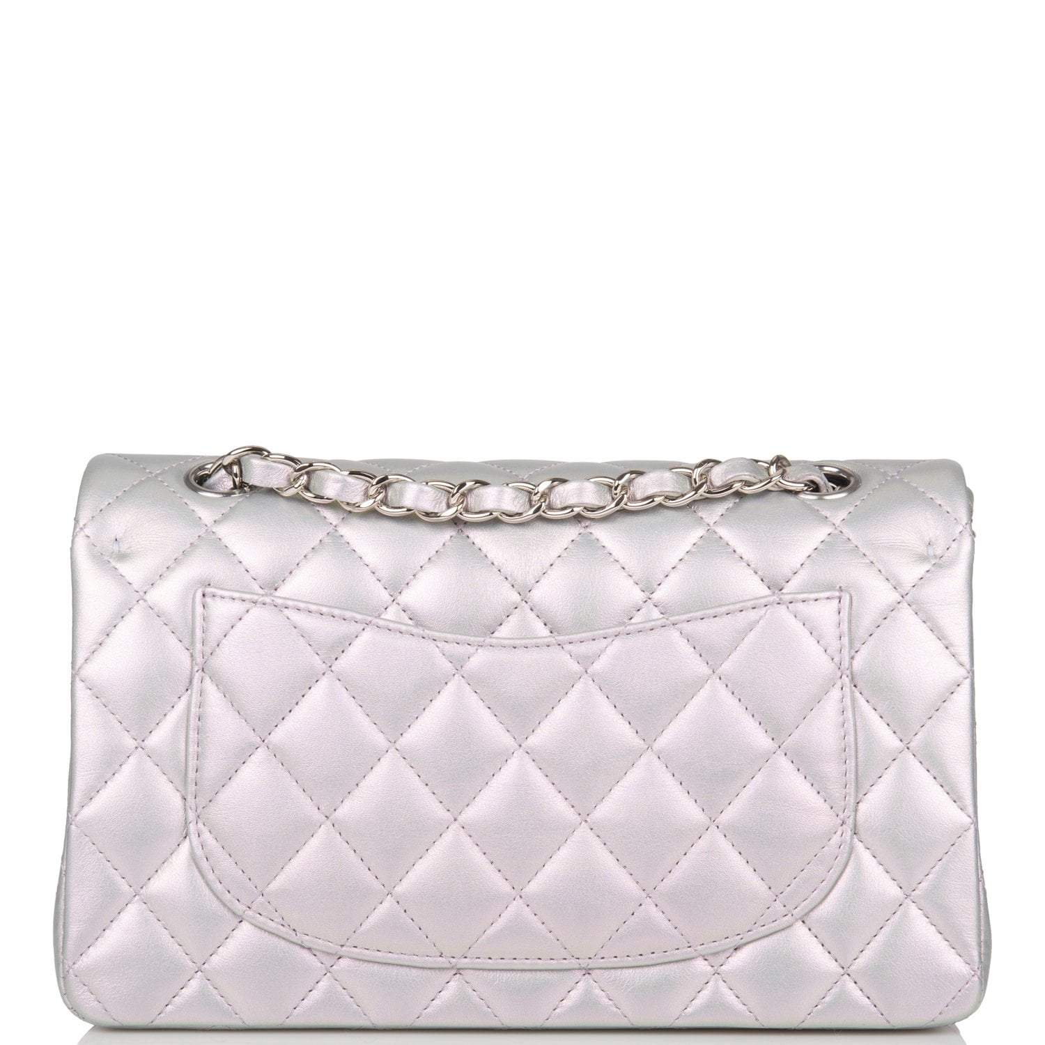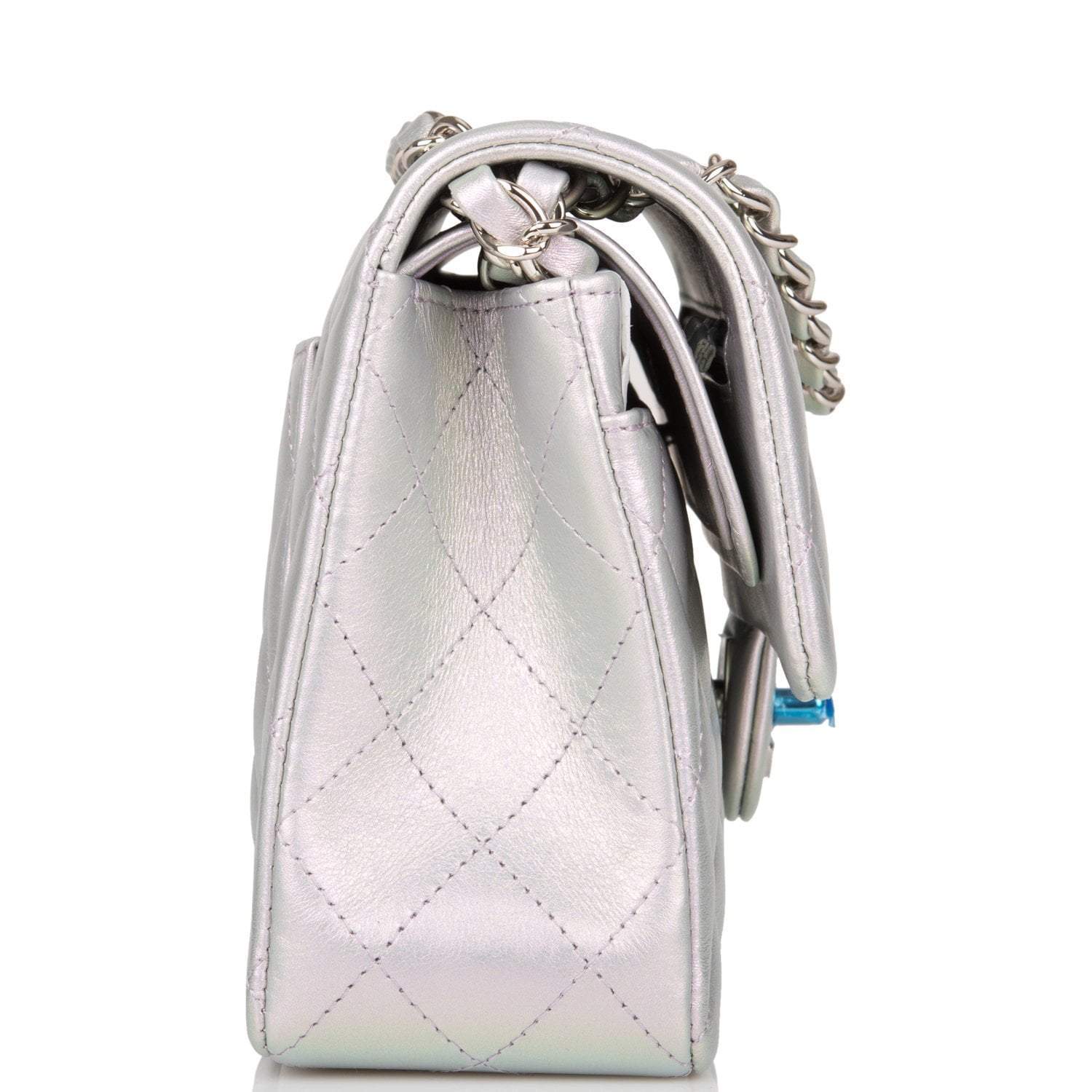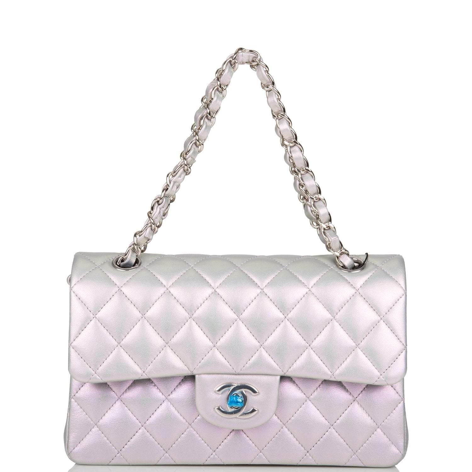 This Small Classic Double Flap bag is in silver iridescent lambskin leather with silver tone hardware and features a front flap with signature CC turnlock closure, half moon back pocket, and adjustable interwoven silver tone chain link and silver leather leather shoulder strap.