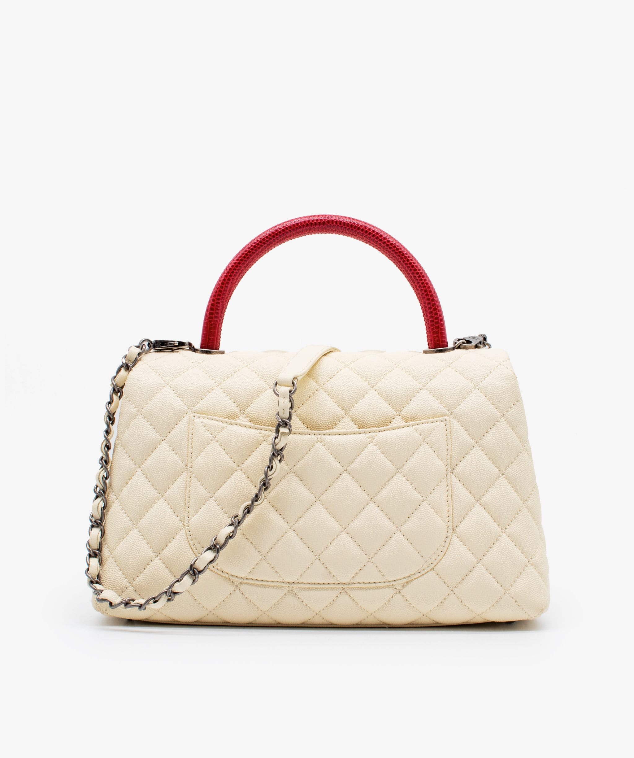 Shop this super exclusive Chanel small Coco handle flap bag. Crafted from caviar leather in ivory paired with a beautiful burgundy lizard handle with aged silver tone hardware. Ultra rare piece by Chanel. Style as a top handle or crossbody/shoulder bag. Removable shoulder strap.