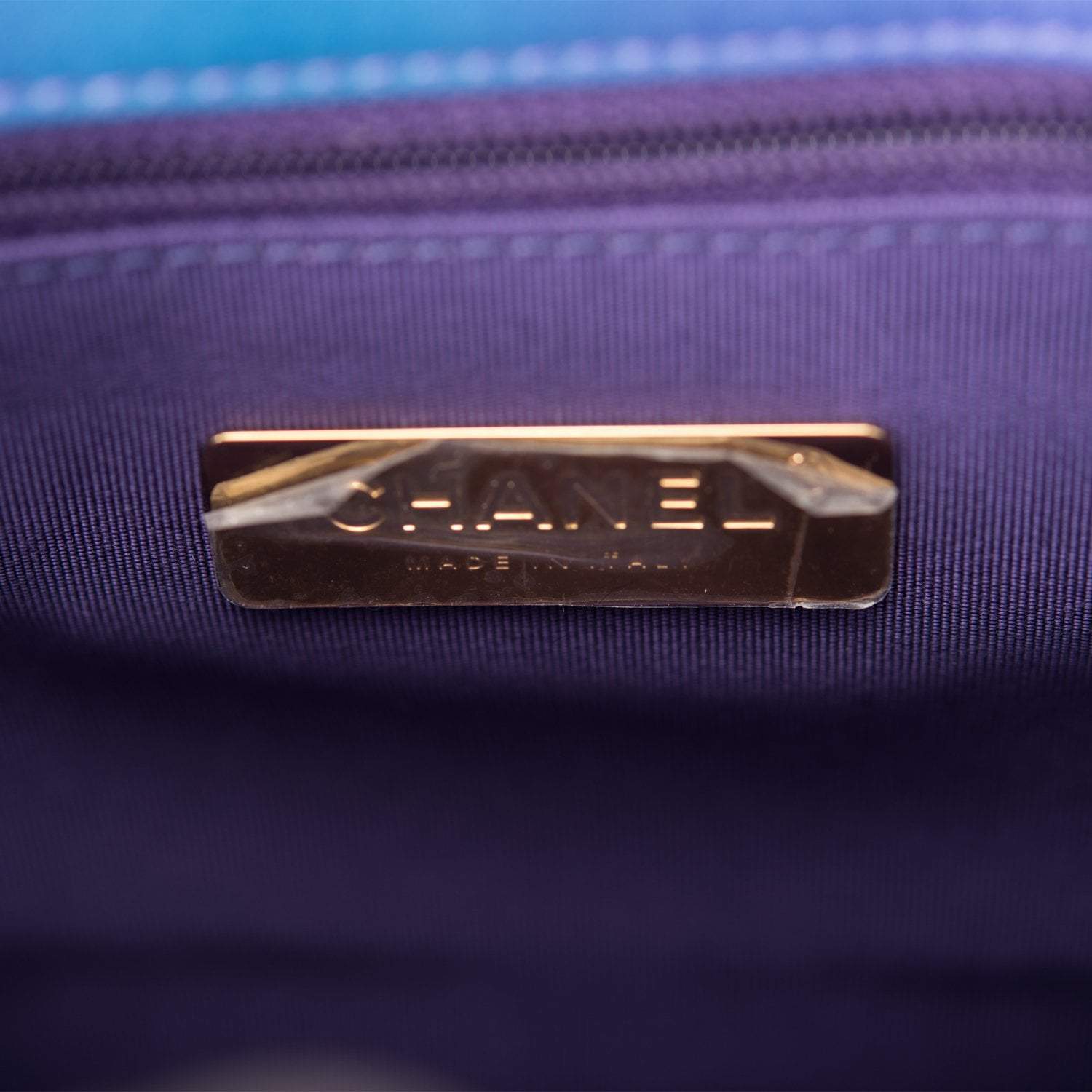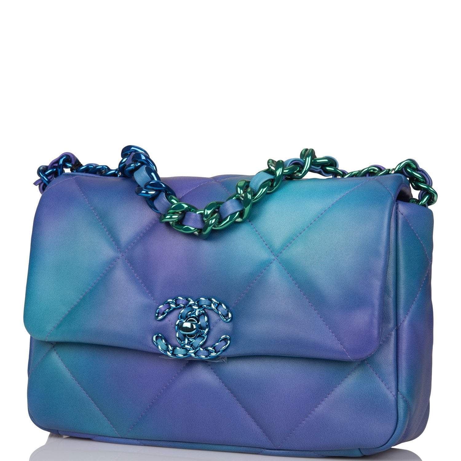 This Medium 19 Flap bag is of tie dye calfskin with rainbow hardware and has the signature diamond quilting, signature CC interlocking closure, exterior back pocket, chain top handle, and long rainbow metal and tie dye leather chain.
