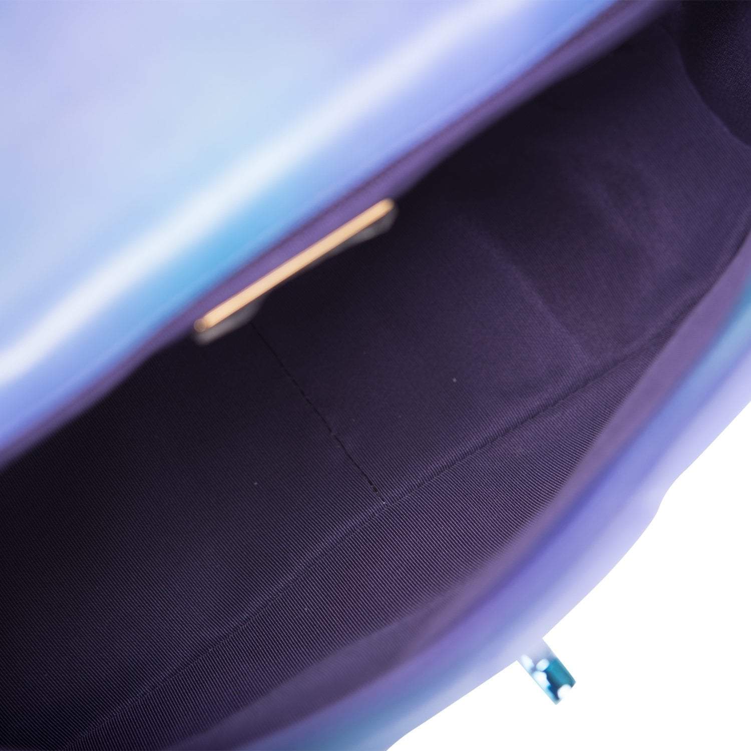 The interior is lined in purple fabric with one zip pocket on the rear wall.