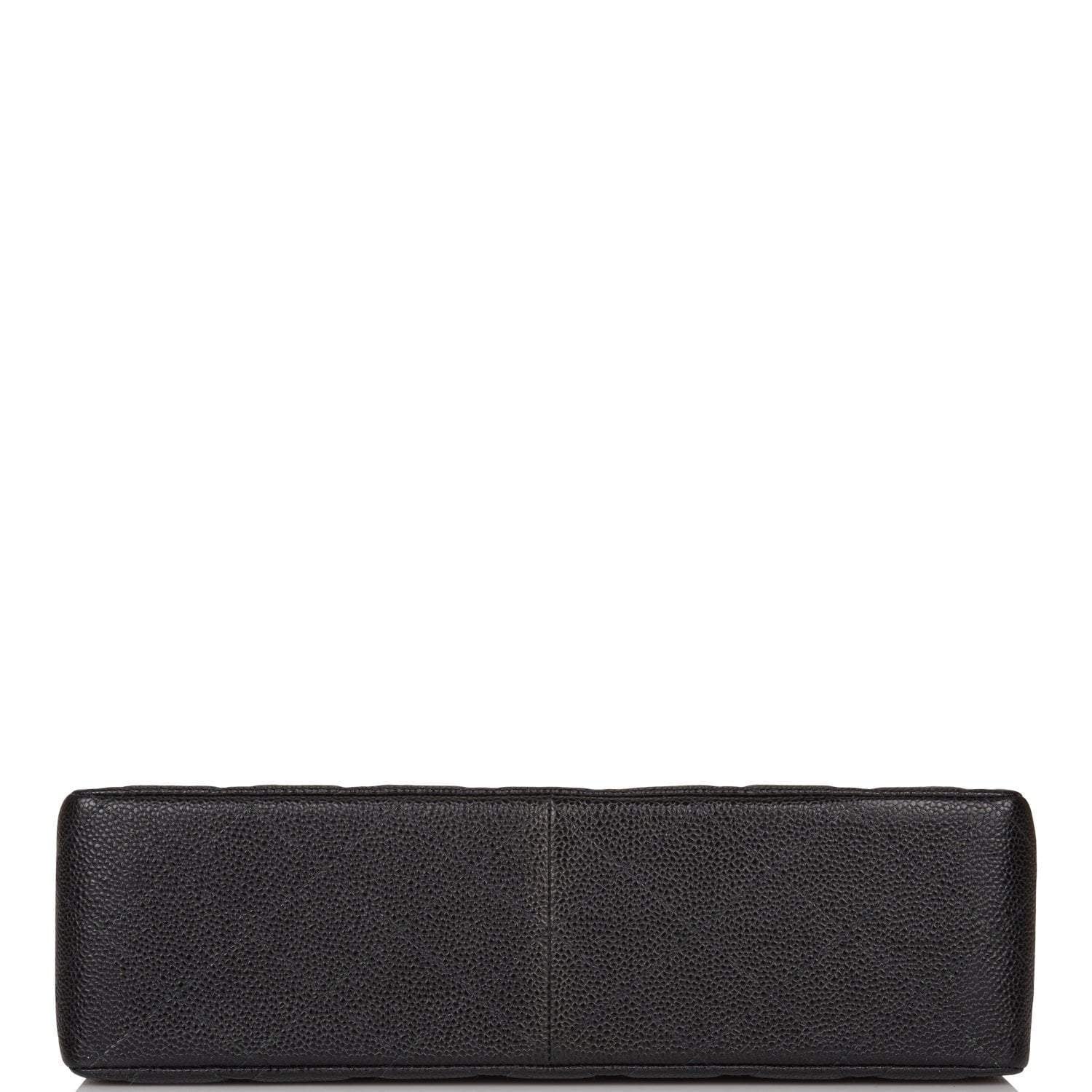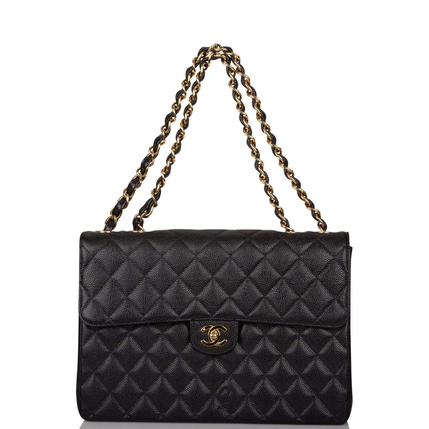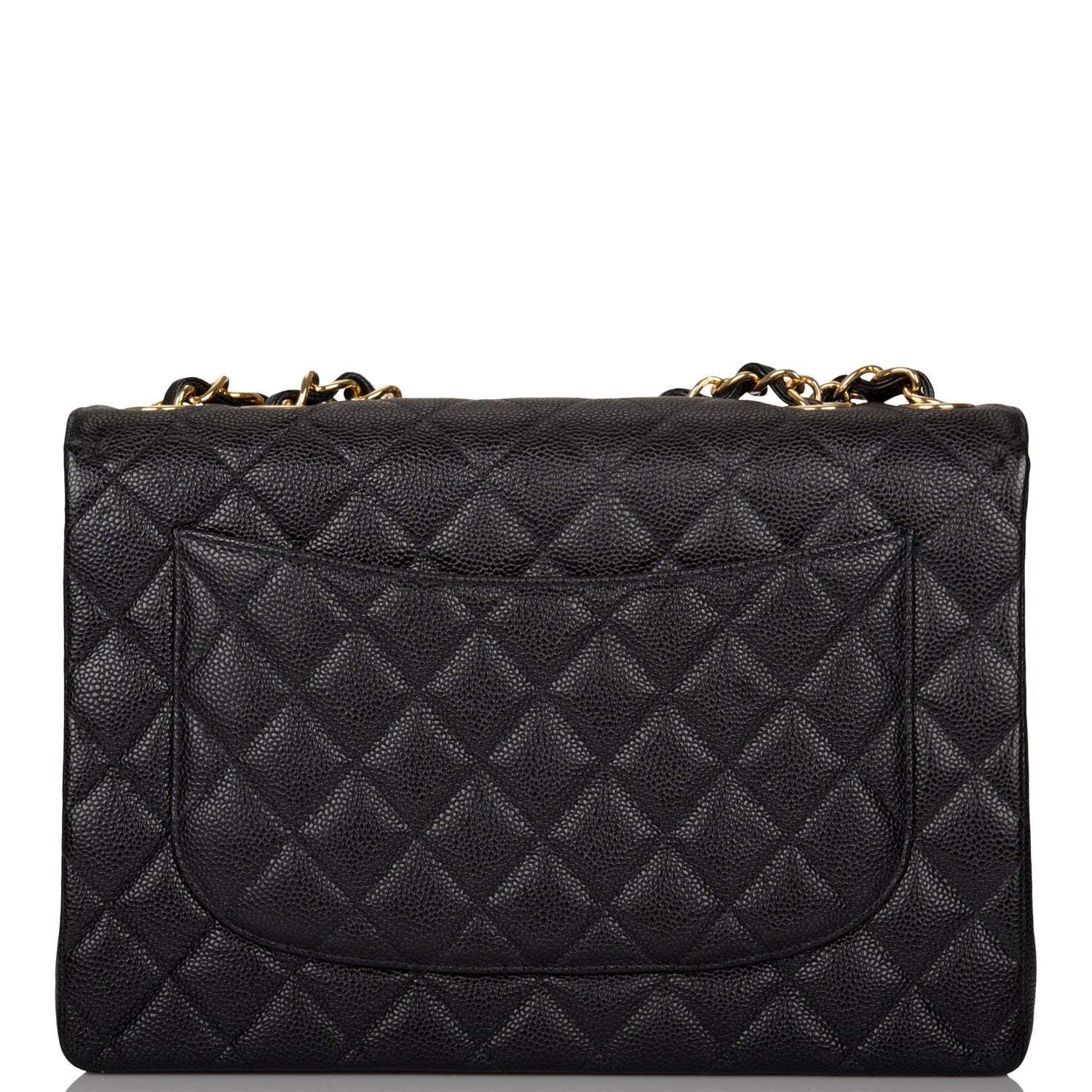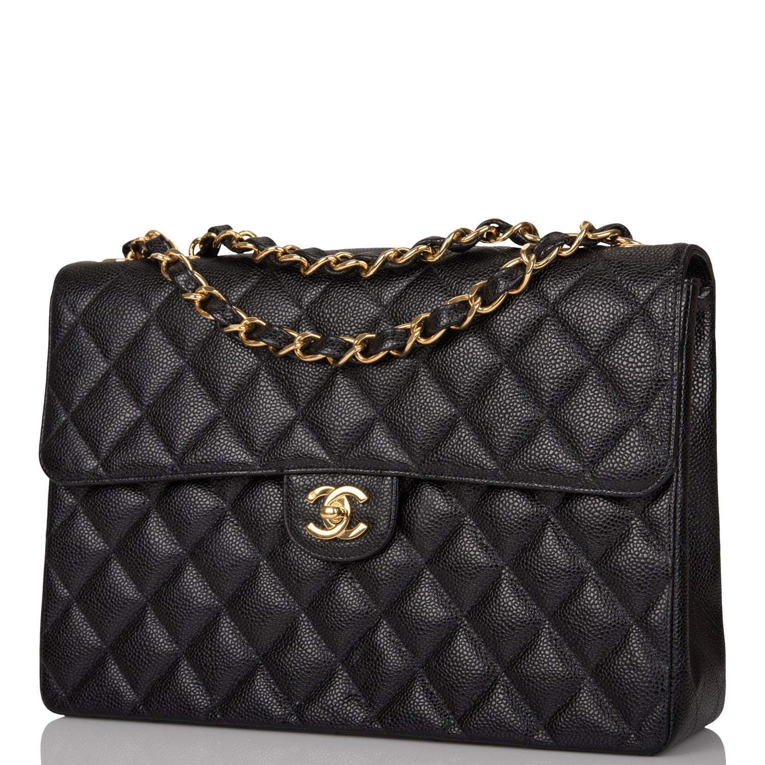 This Vintage Jumbo single flap bag is of black caviar leather with gold hardware and features front flap with signature CC turn lock closure, half moon back pocket, and adjustable interwoven gold chain link and black leather shoulder strap.