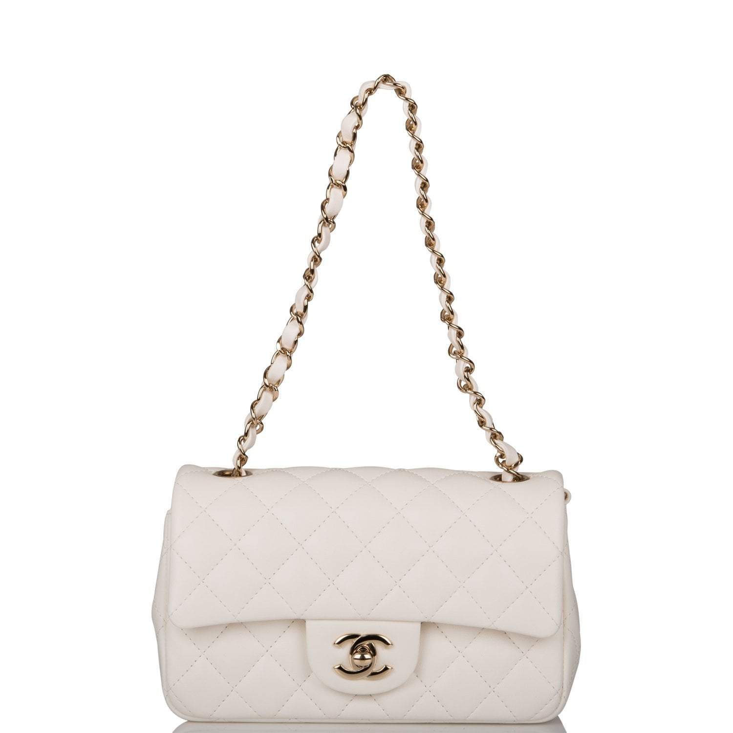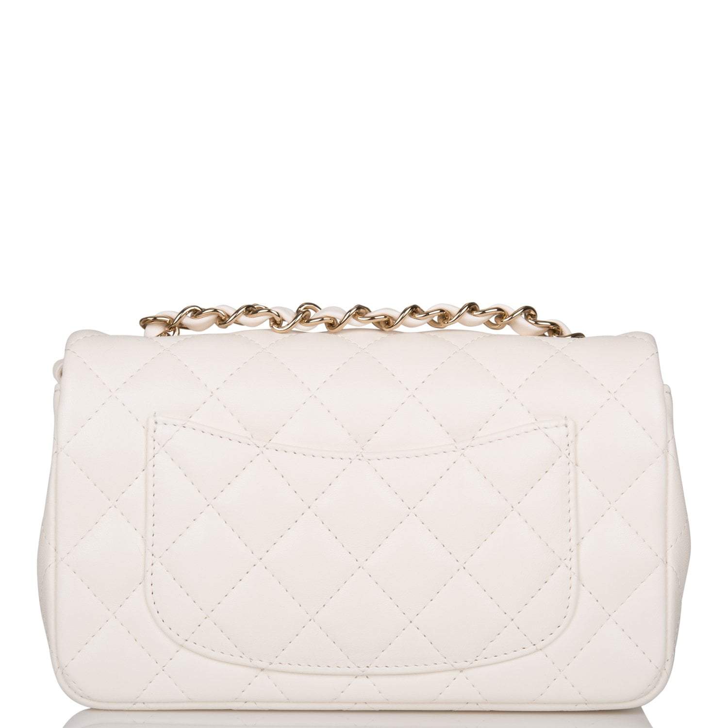 This Mini Rectangular flap bag is of white lambskin leather with light gold tone hardware and has a front flap with signature CC turnlock closure, rear half moon pocket, single interwoven white leather and light gold tone chain link shoulder/crossbody strap.