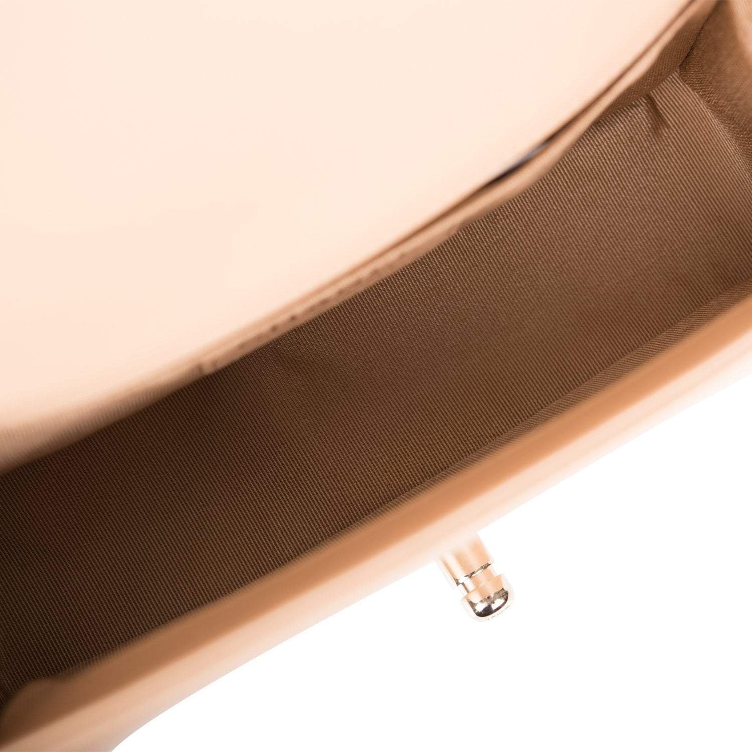 The interior is lined in camel fabric with an open pocket on rear wall.