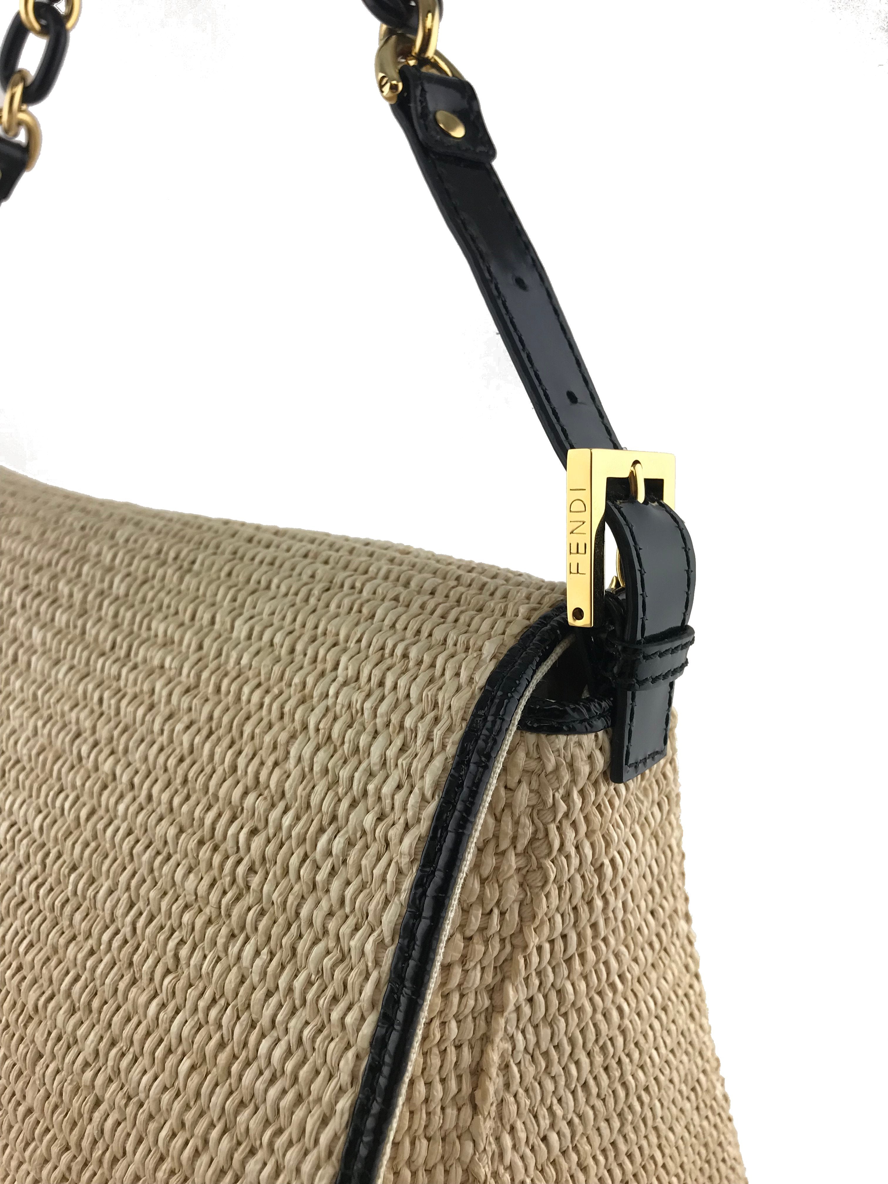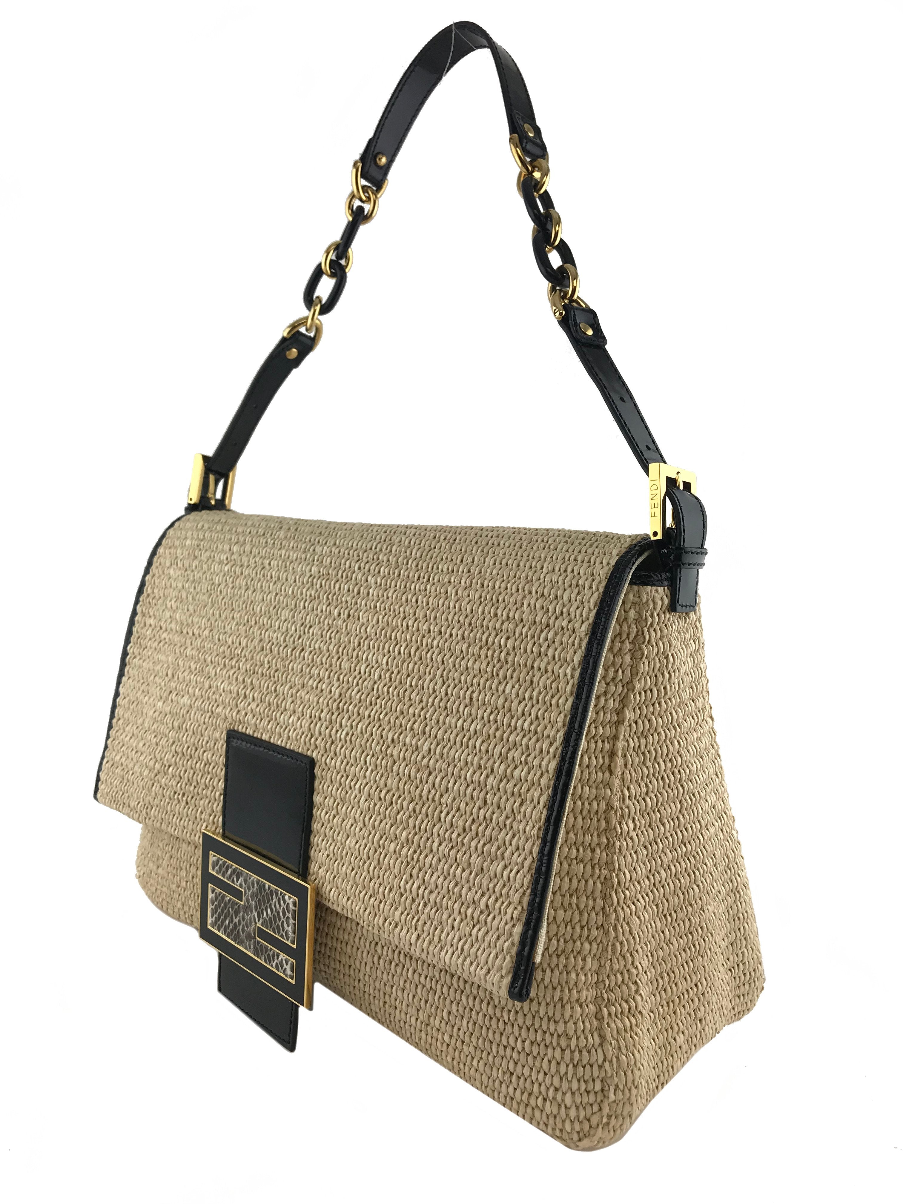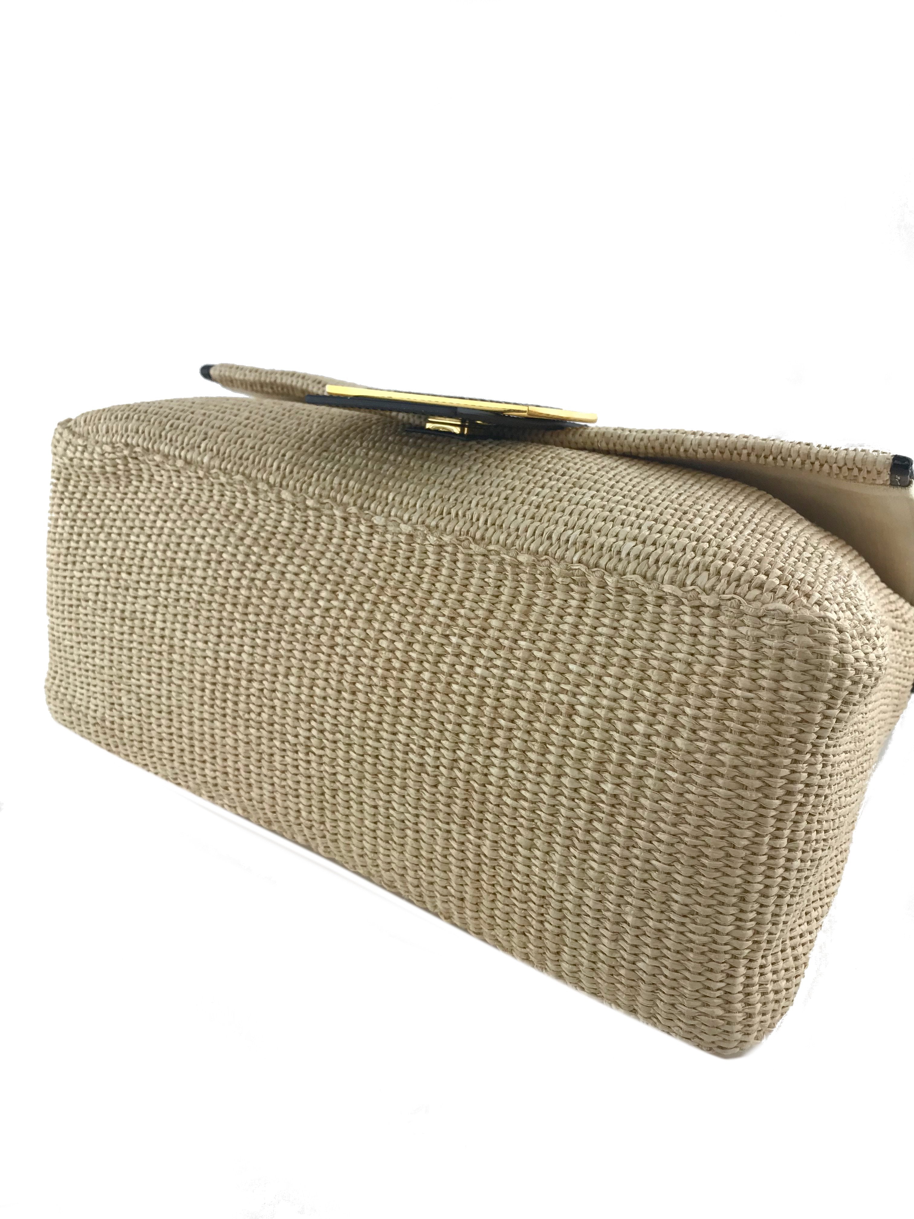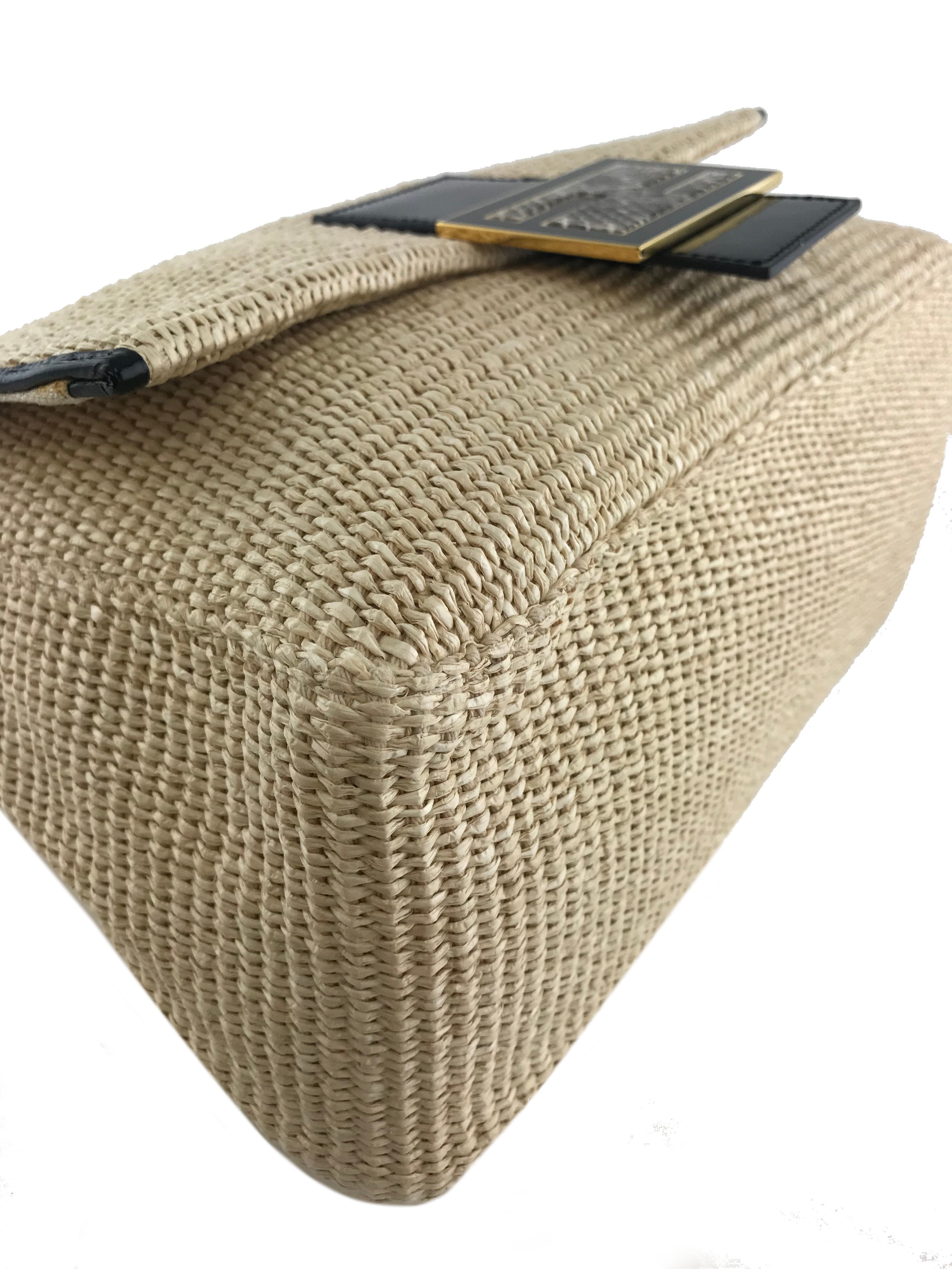 This authentic Fendi Big Mama Straw Flap Bag is crafted from natural straw with a black patent leather trim. It features an adjustable shoulder strap and a snakeskin embossed accent on the front flap.