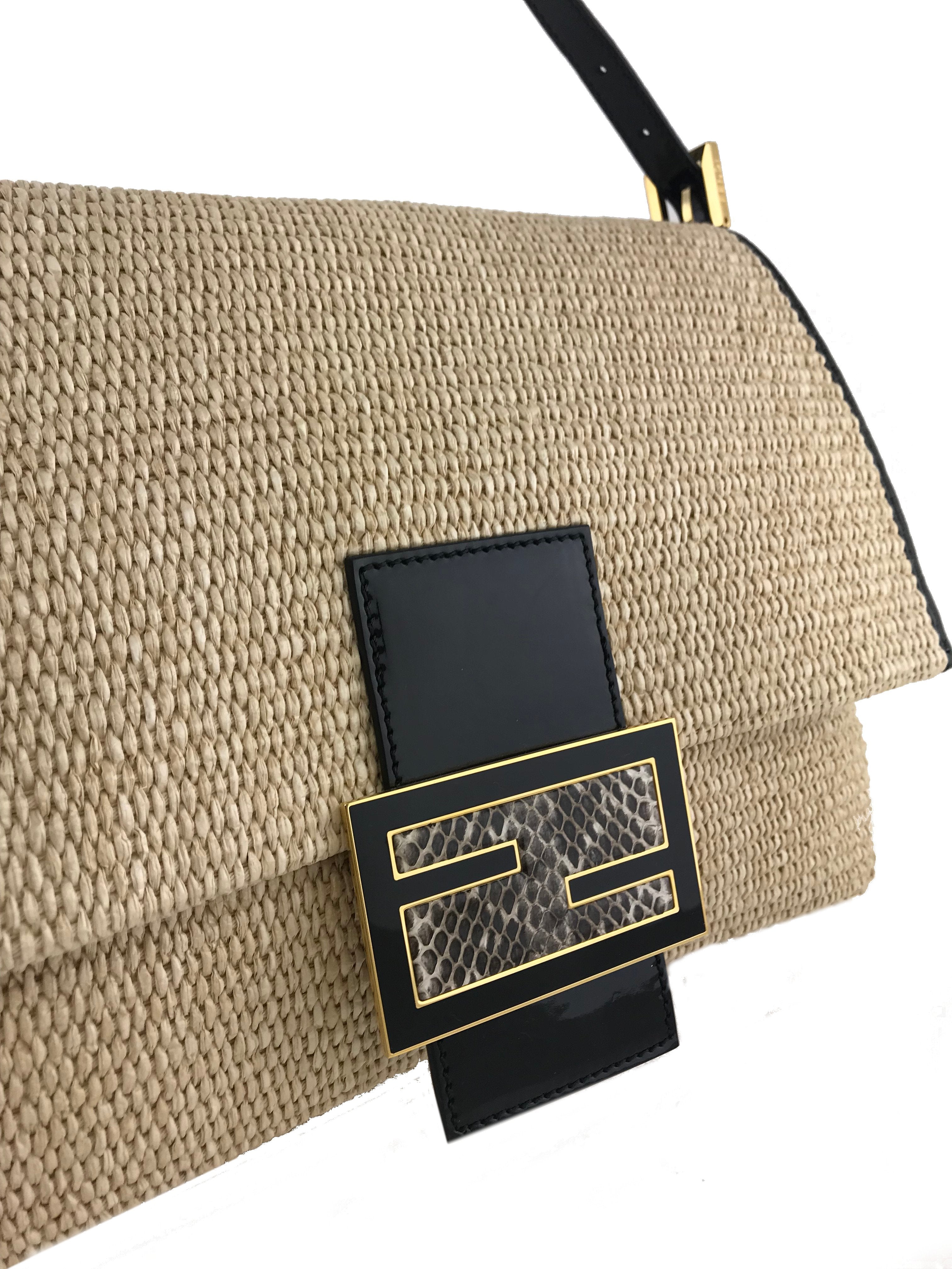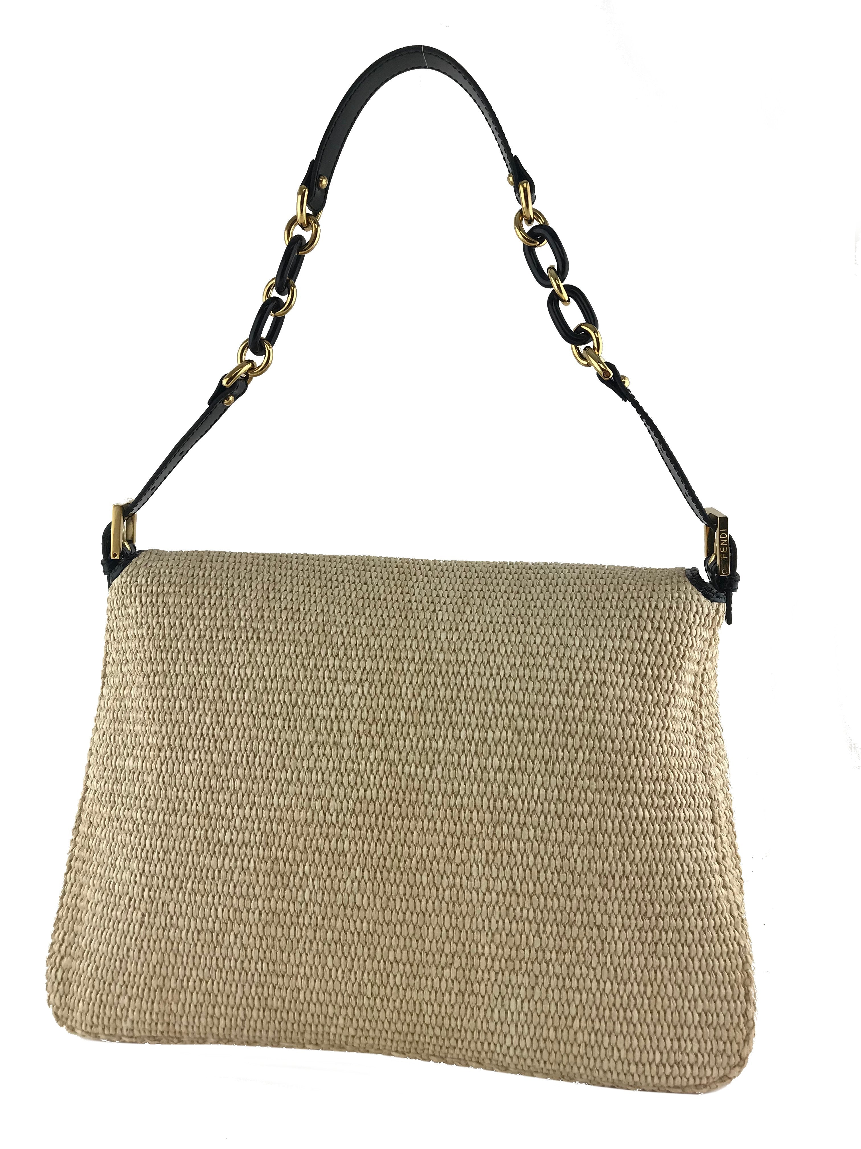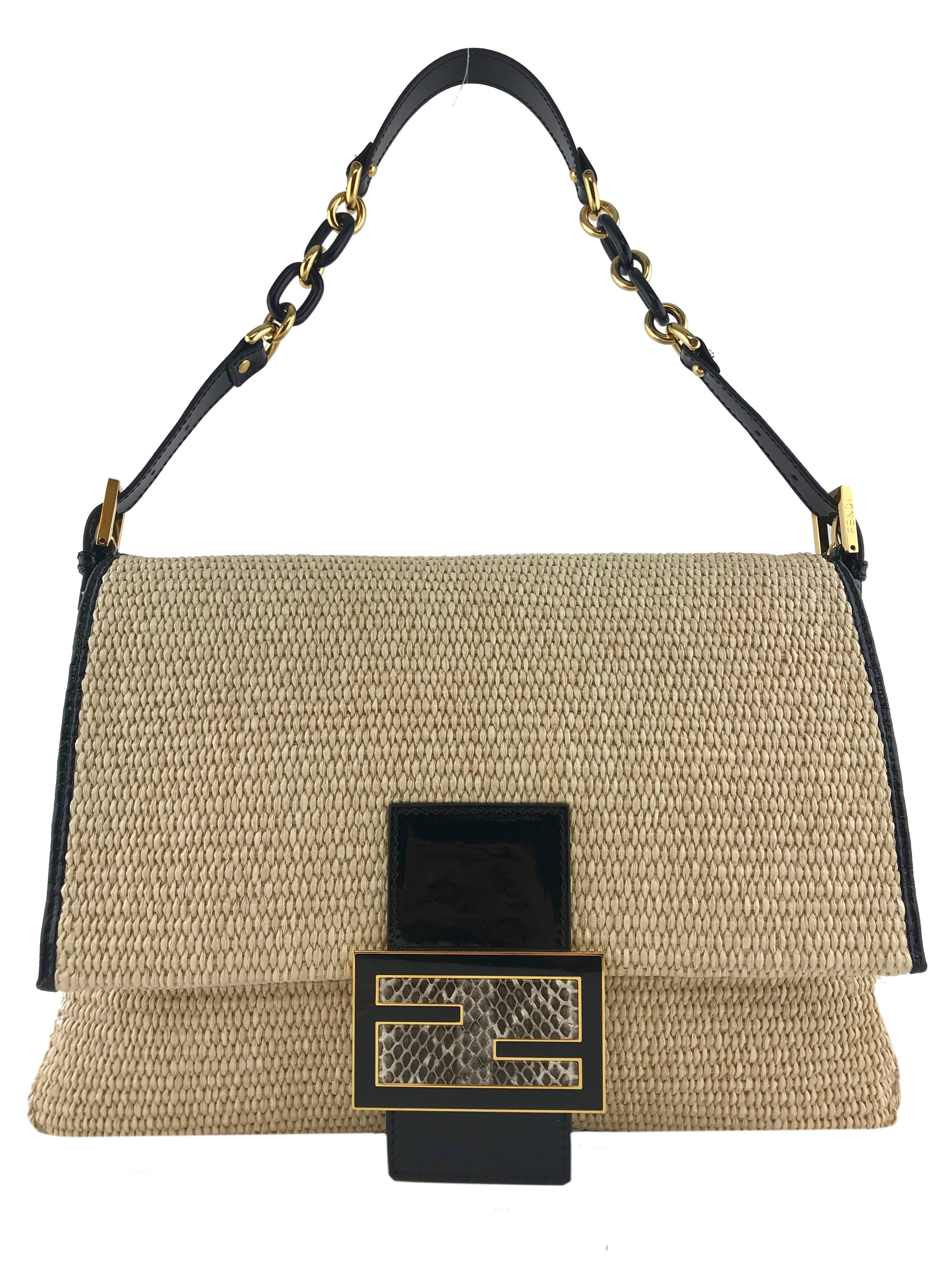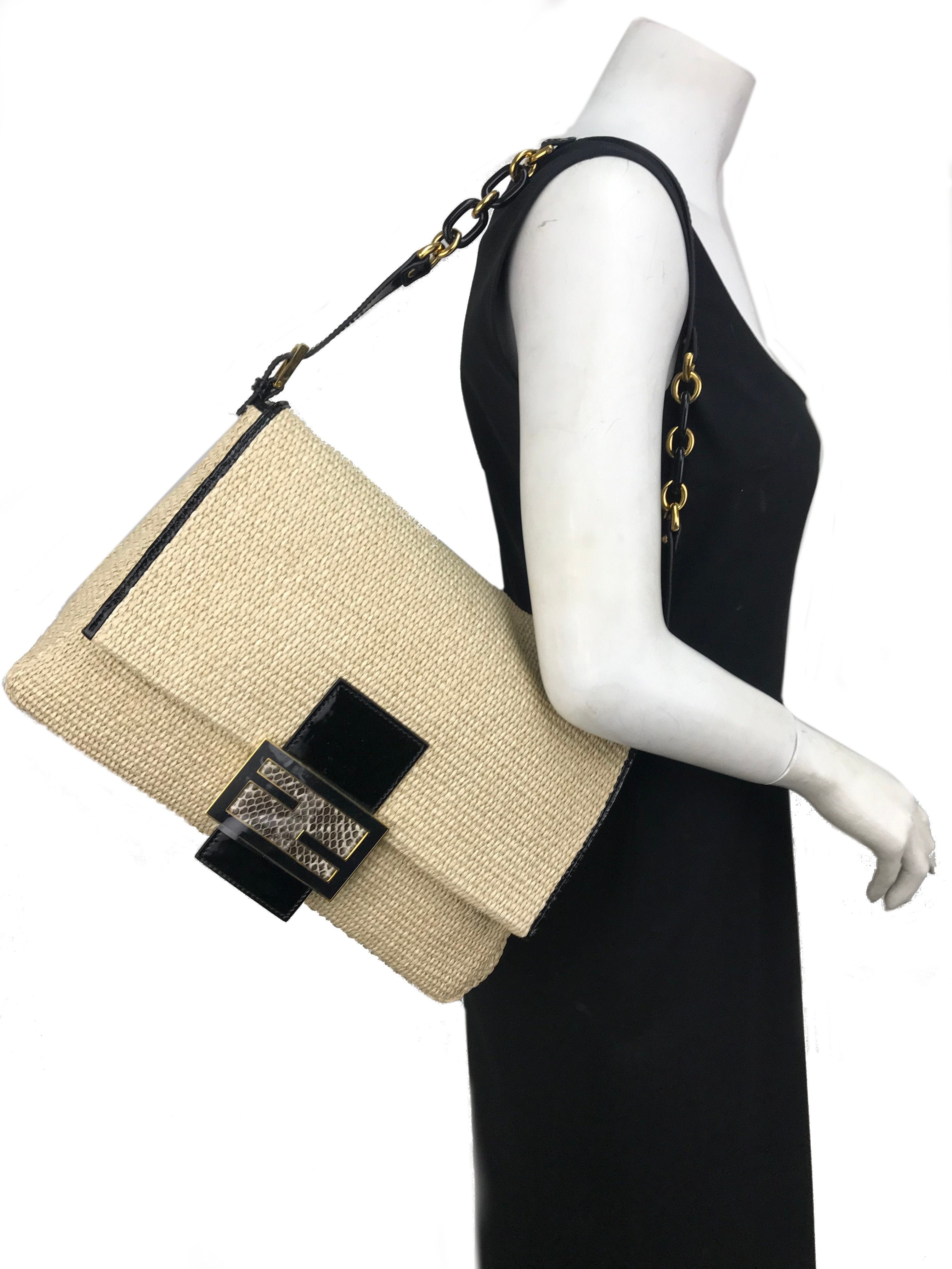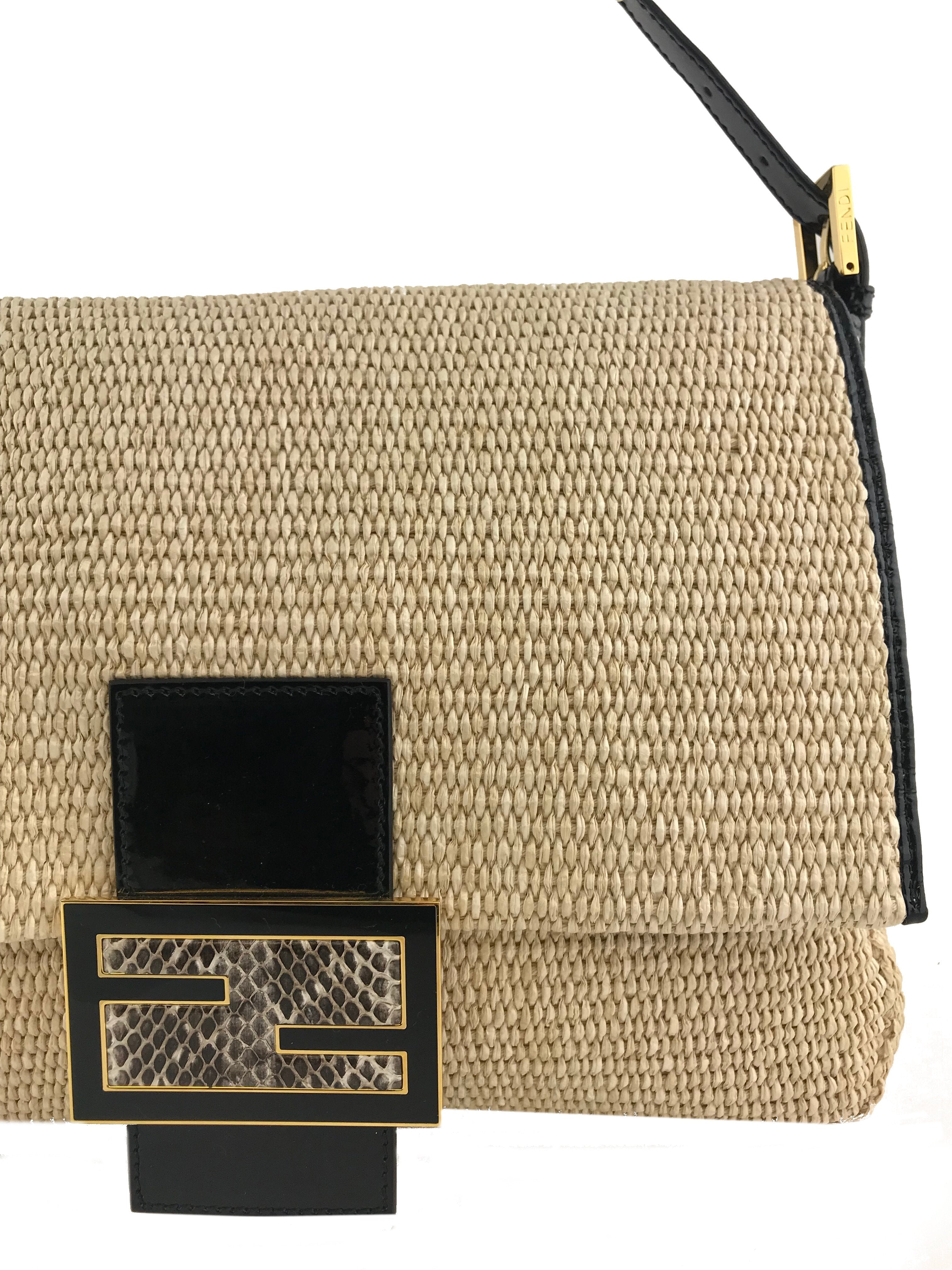 This authentic Fendi Big Mama Straw Flap Bag is crafted from natural straw with a black patent leather trim. It features an adjustable shoulder strap and a snakeskin embossed accent on the front flap.