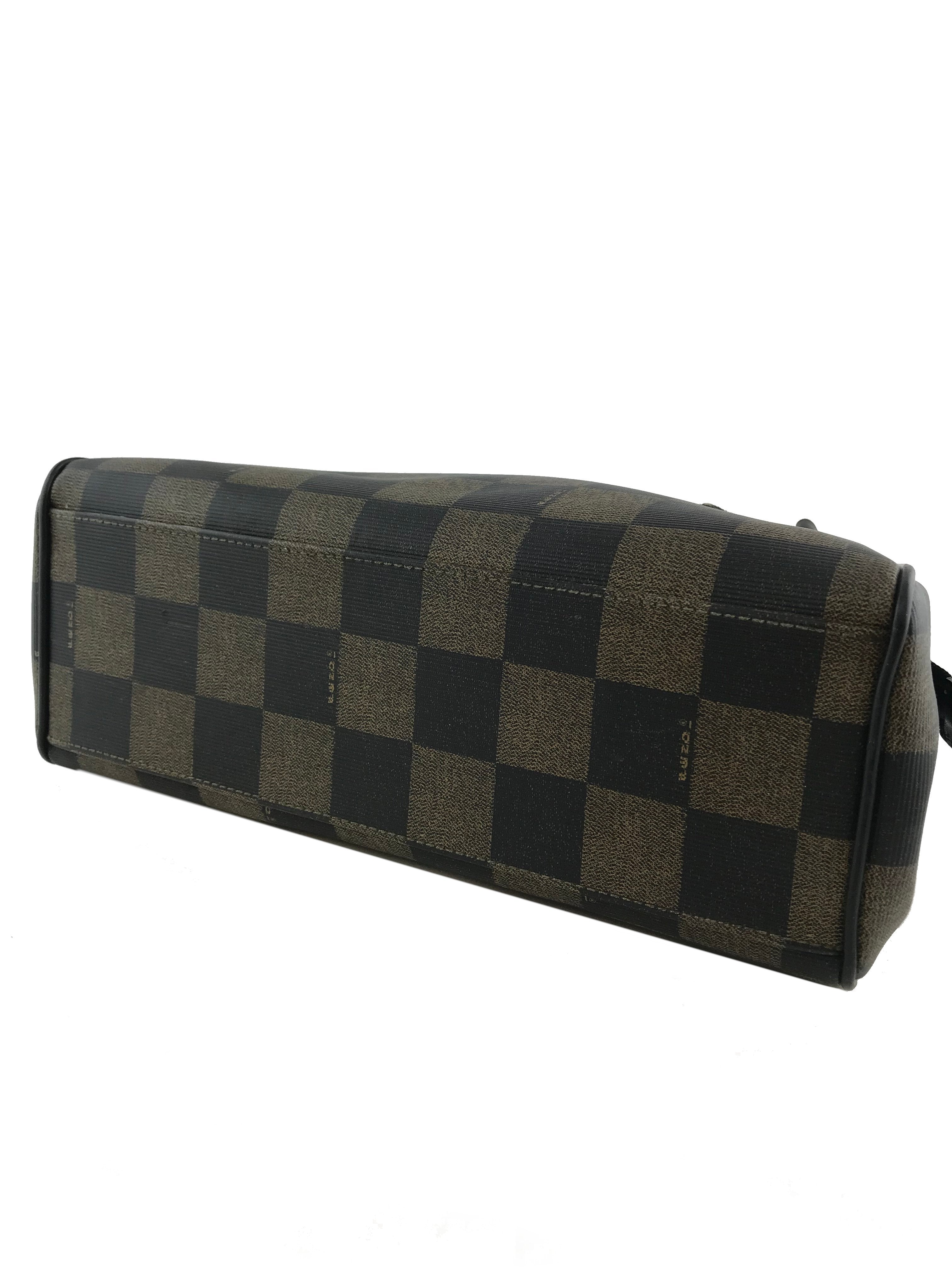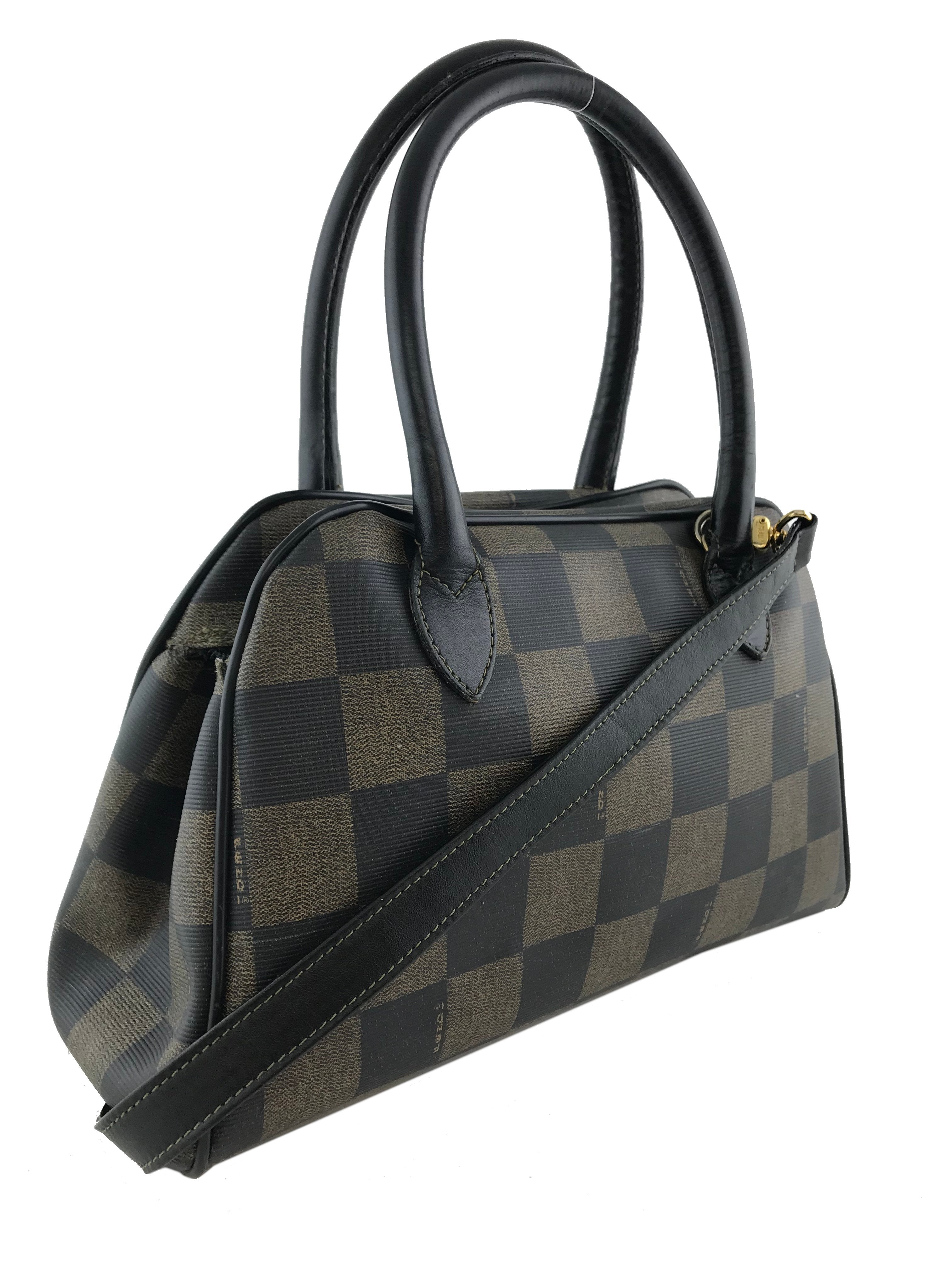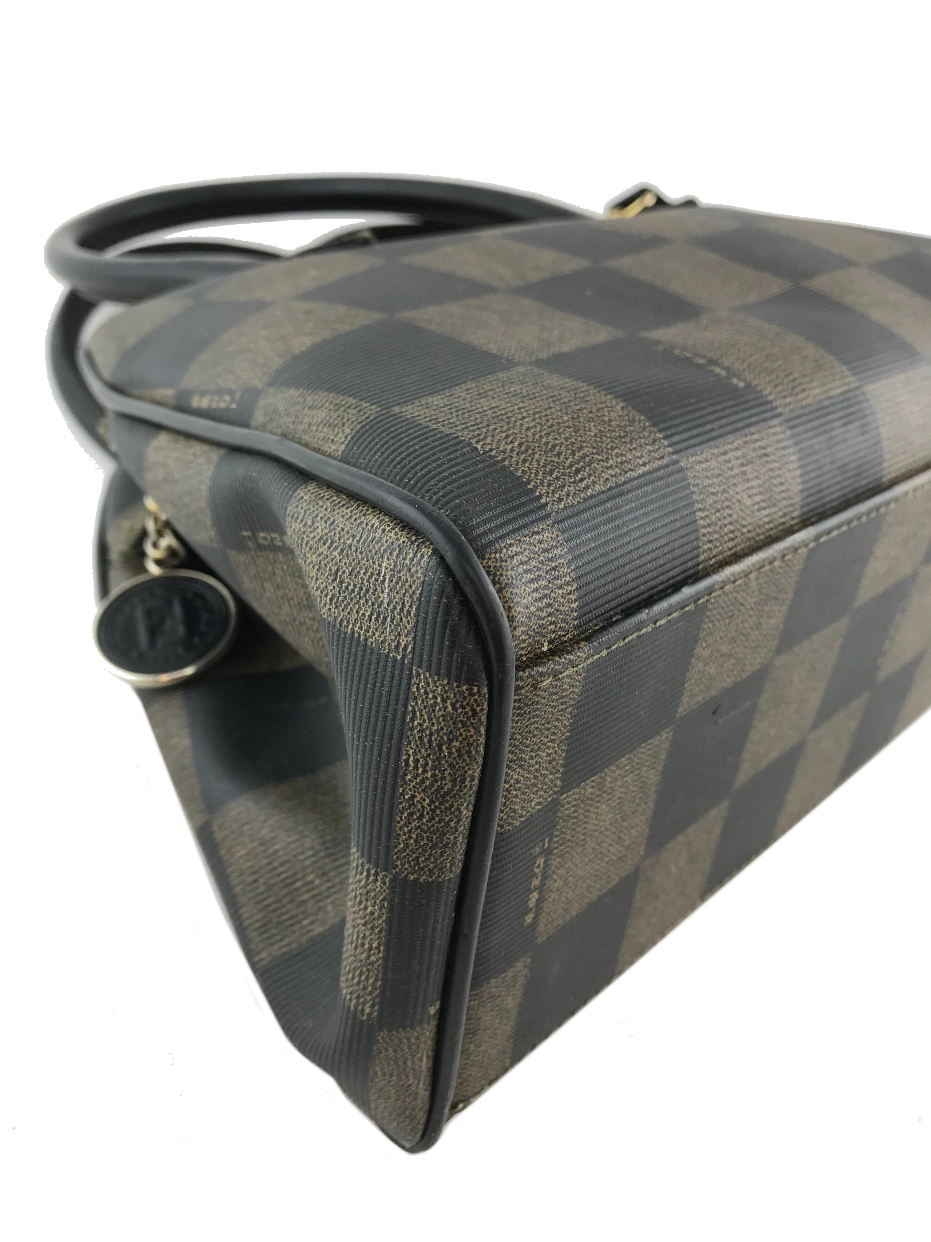 This authentic Fendi Checkered Coated Canvas Satchel with Strap is both chic and stylish. Beautifully crafted from signature brown and black checkered coated canvas and black leather. Featuring rolled leather top handles, including a removable shoulder strap and a signature ‘FF’ medallion zipper closure.