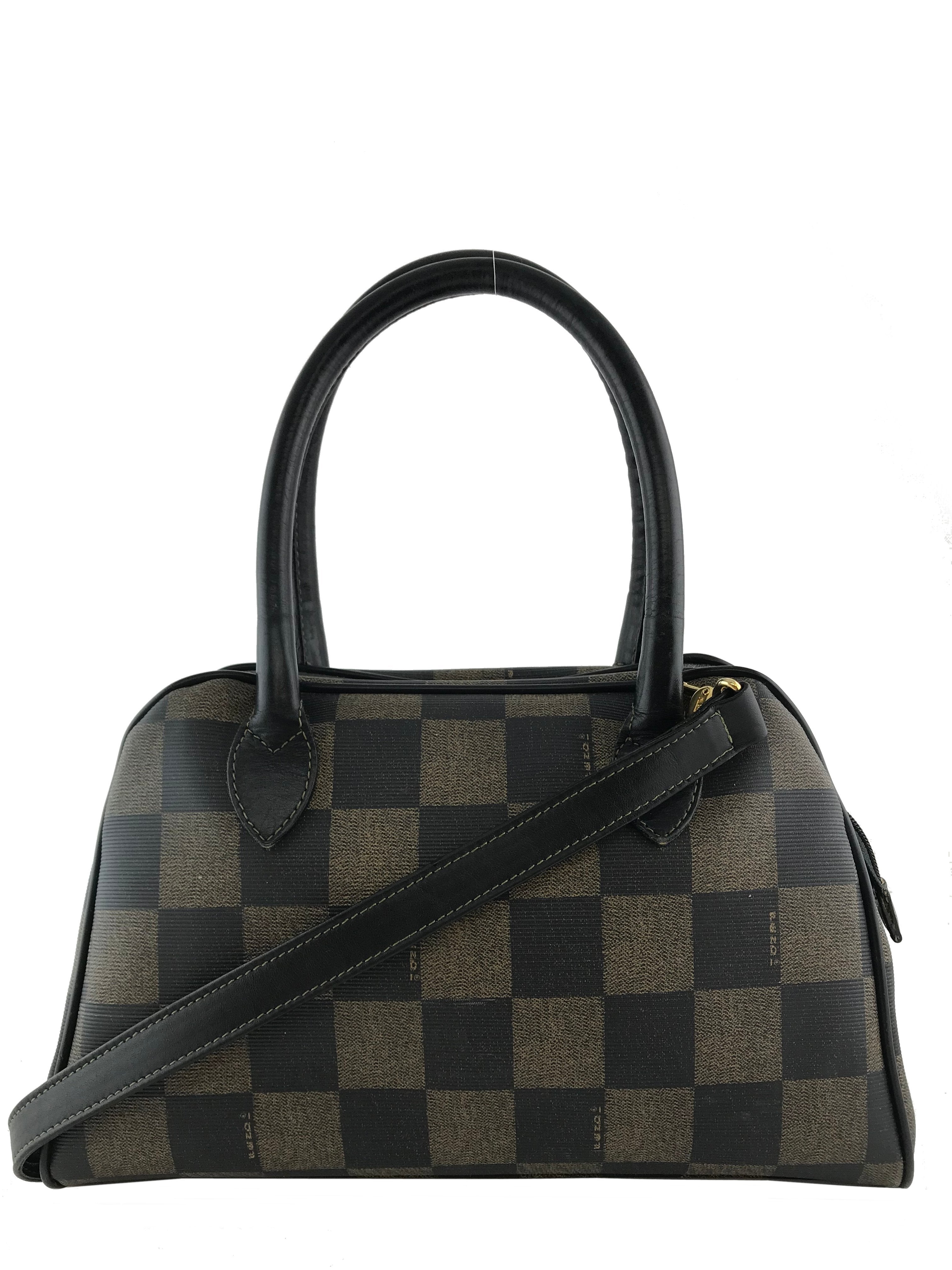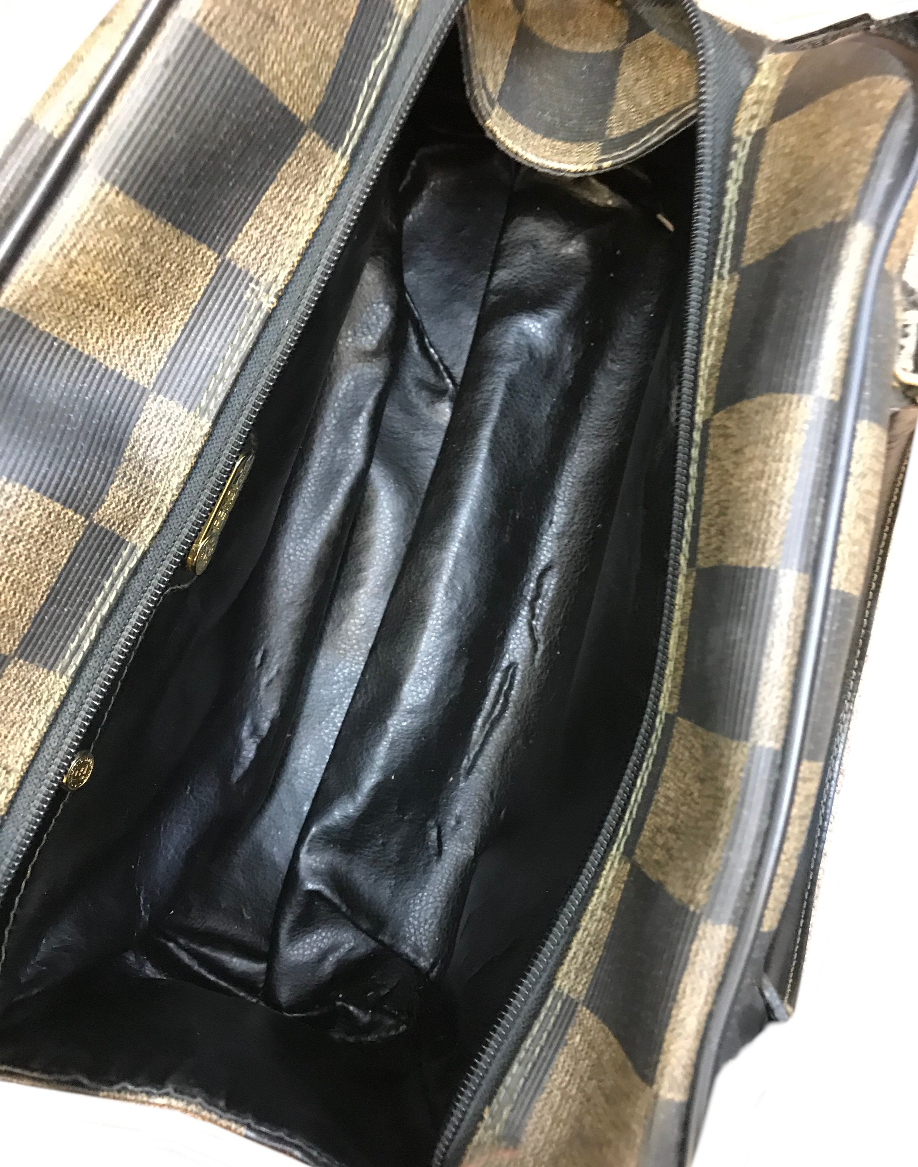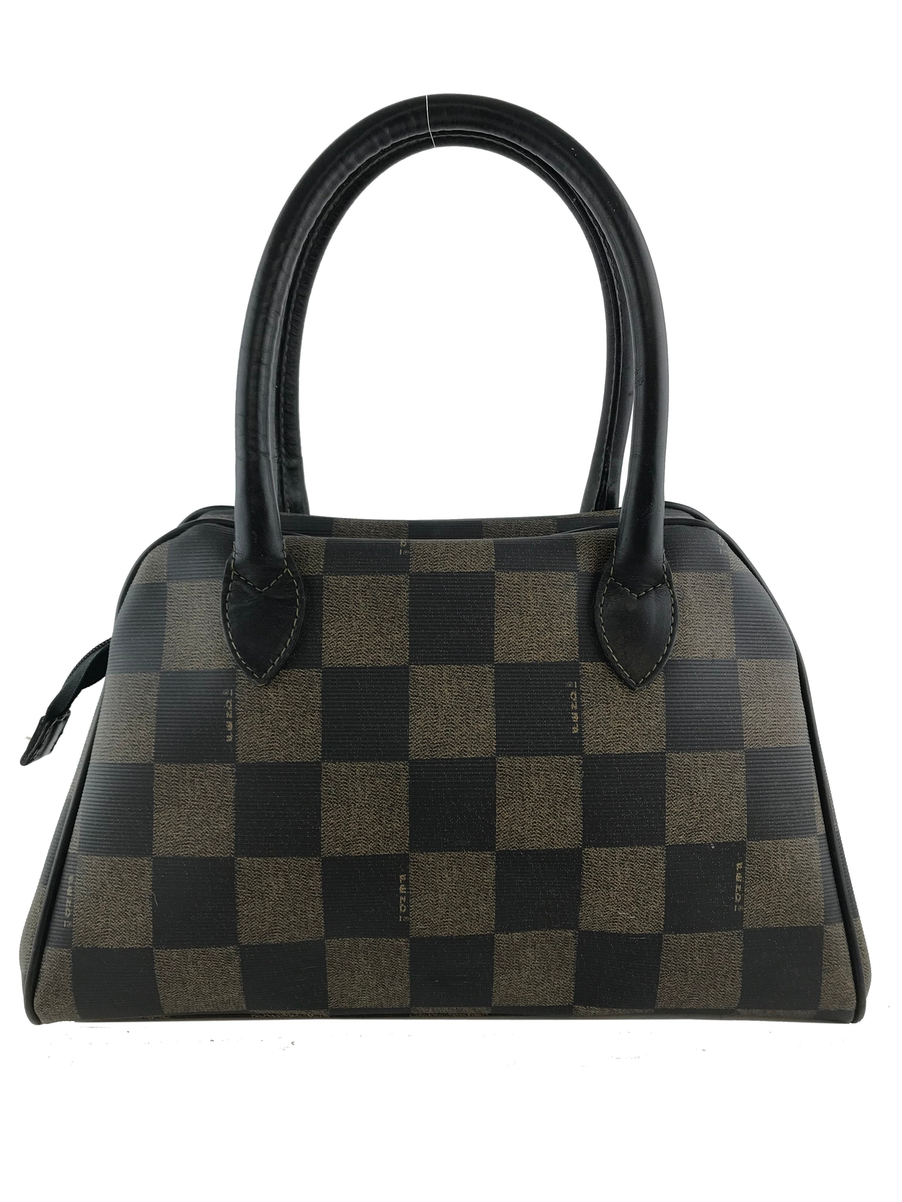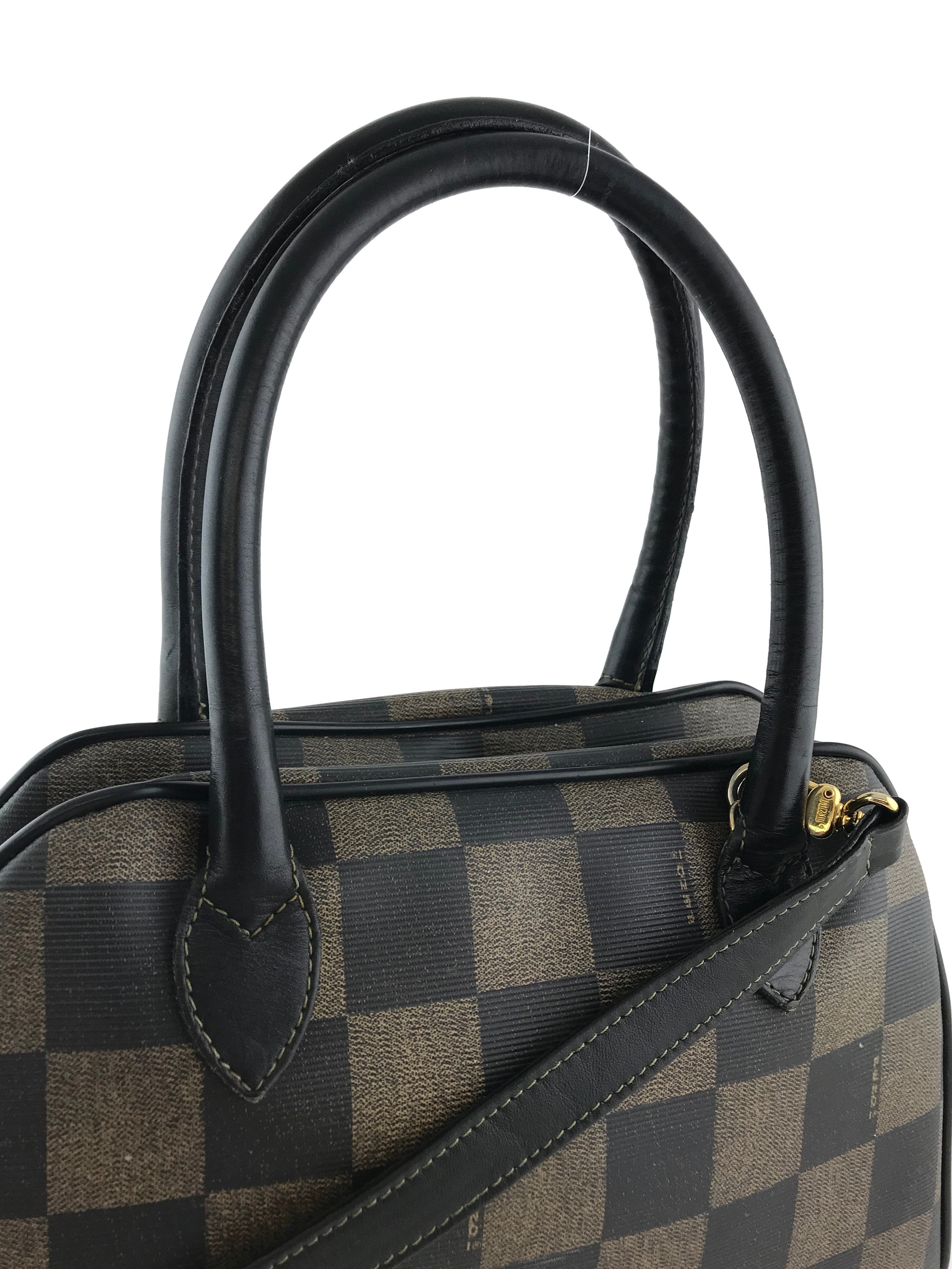 This authentic Fendi Checkered Coated Canvas Satchel with Strap is both chic and stylish. Beautifully crafted from signature brown and black checkered coated canvas and black leather. Featuring rolled leather top handles, including a removable shoulder strap and a signature ‘FF’ medallion zipper closure.