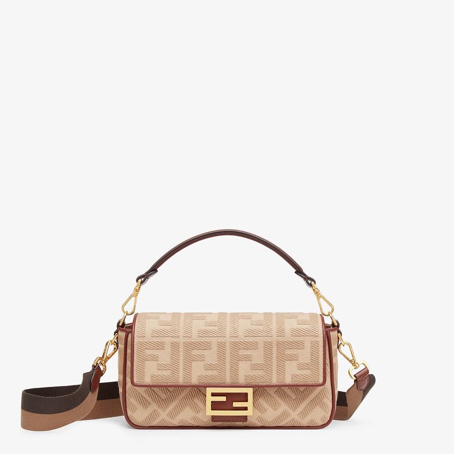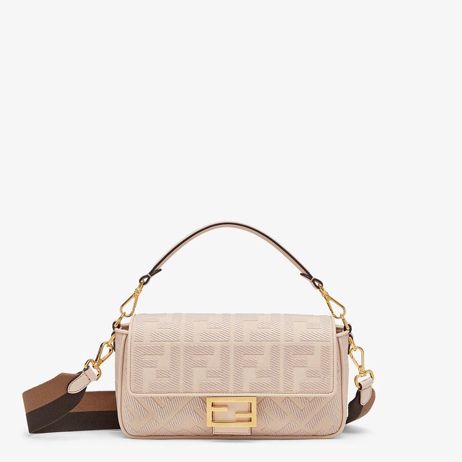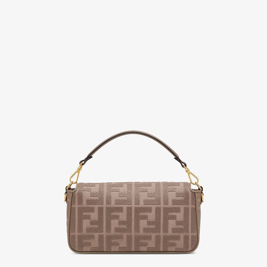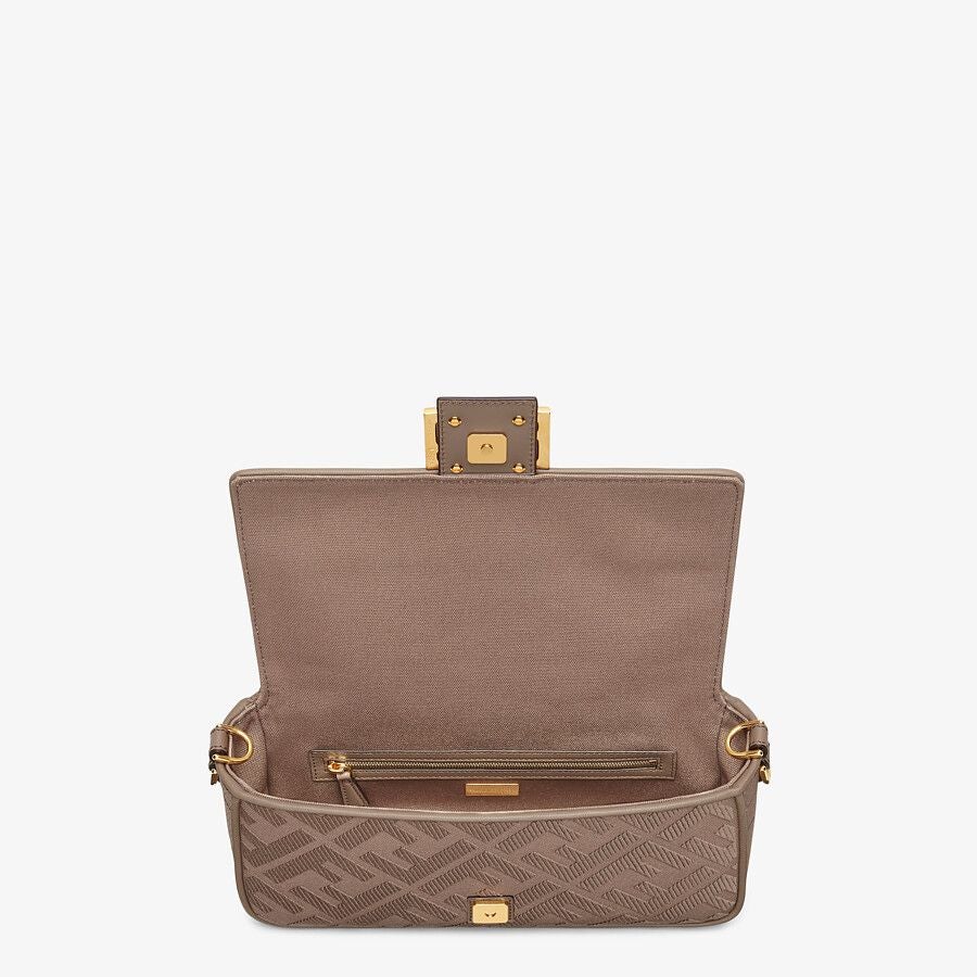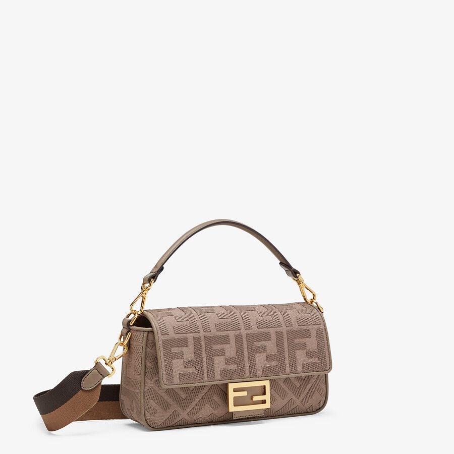 Iconic medium Baguette bag made of gray canvas with an embossed FF motif created with tone on tone embroidery, trimmed in leather and adorned with an FF clasp.