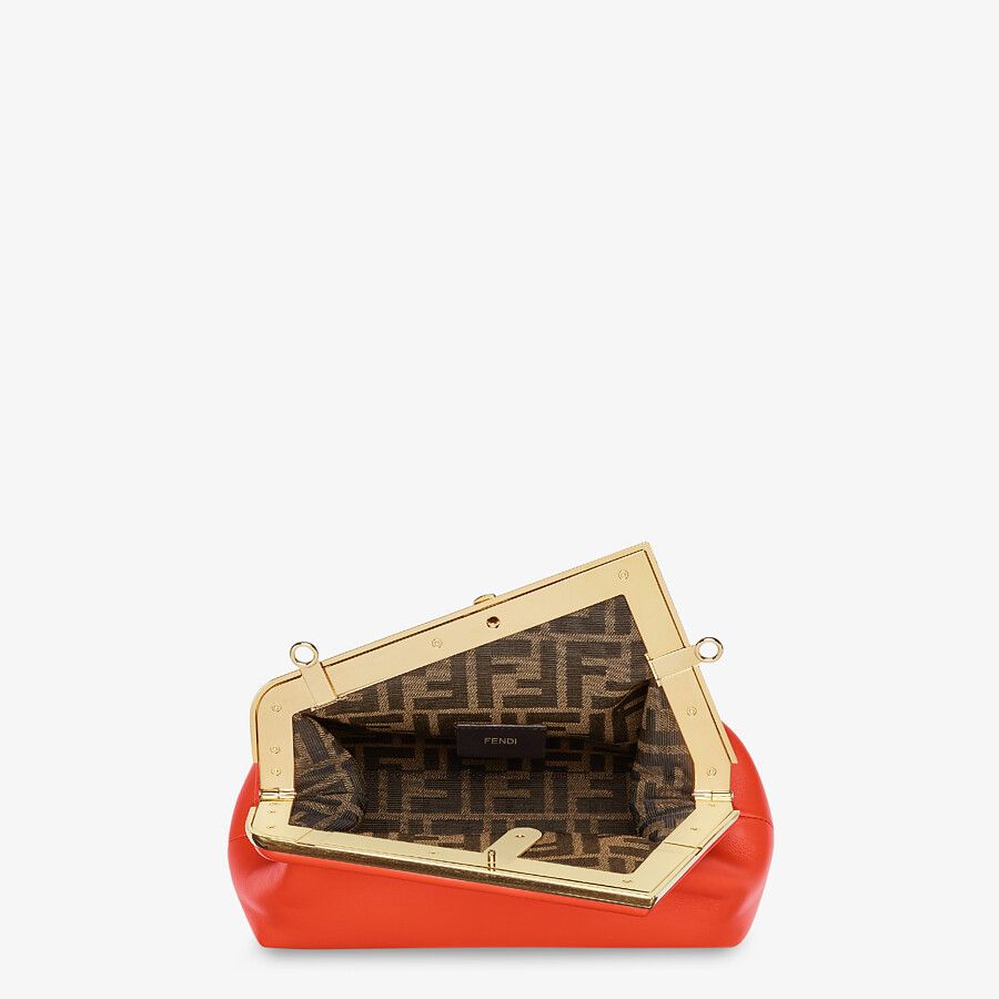 Small Fendi First bag made of soft, red nappa leather with oversized metal F clasp bound in tone on tone nappa leather.