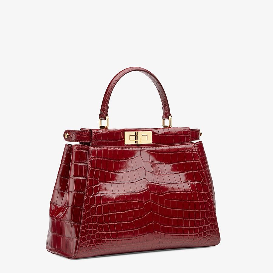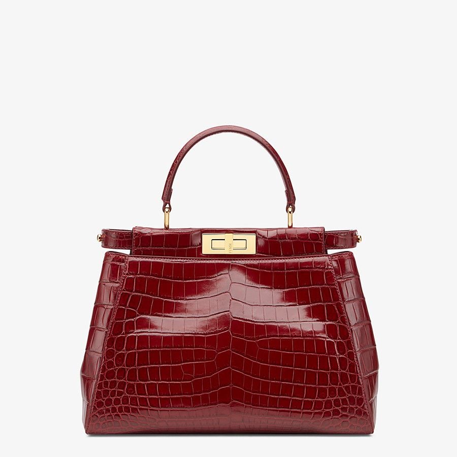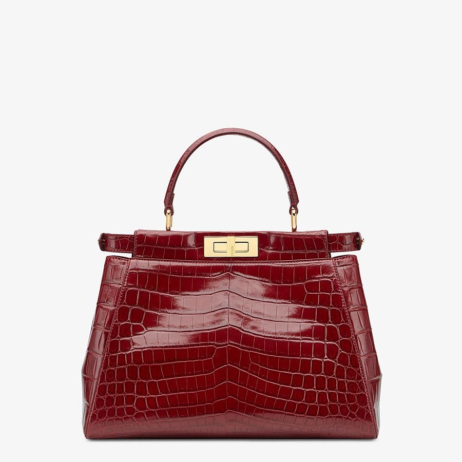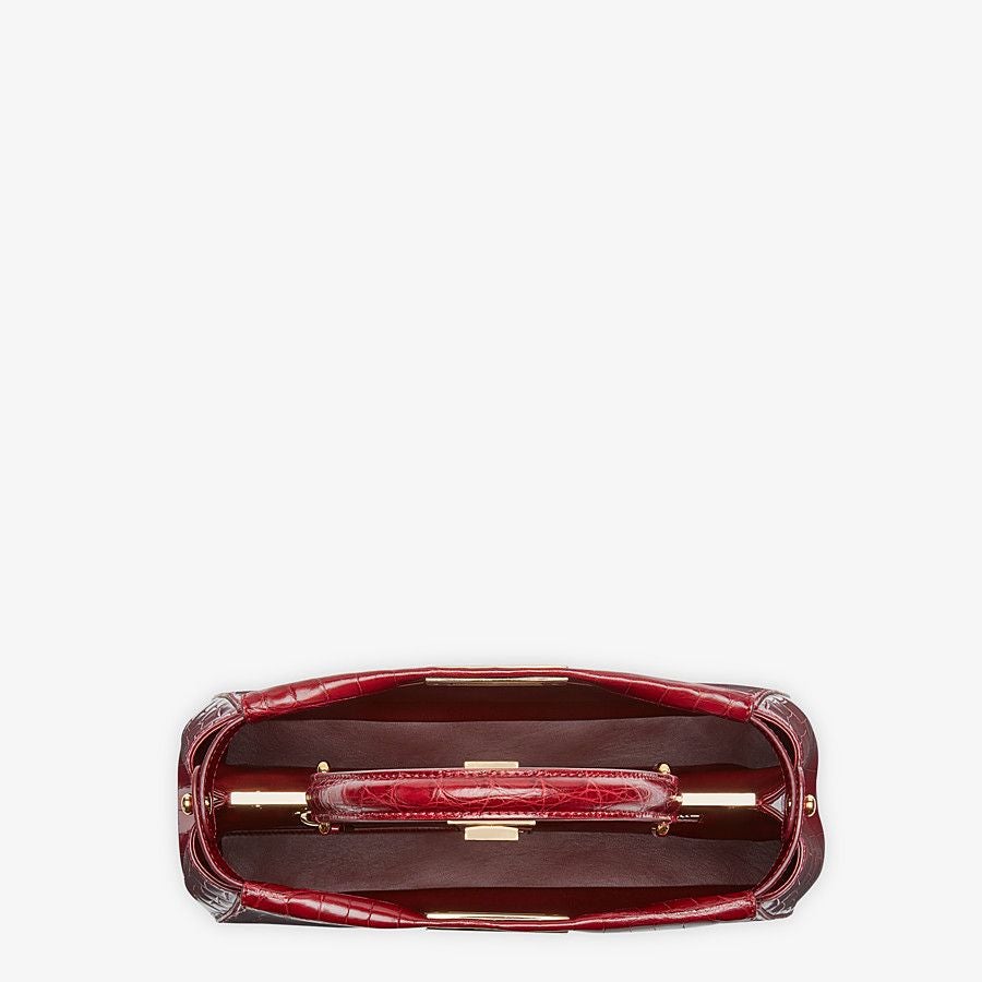 Medium-sized handbag with two compartments divided by a stiff partition. Twist lock on both sides. Inner lining featuring a zippered pocket. Single handle and adjustable, detachable shoulder strap, made of dark red crocodile leather. Gold-finish metalware.