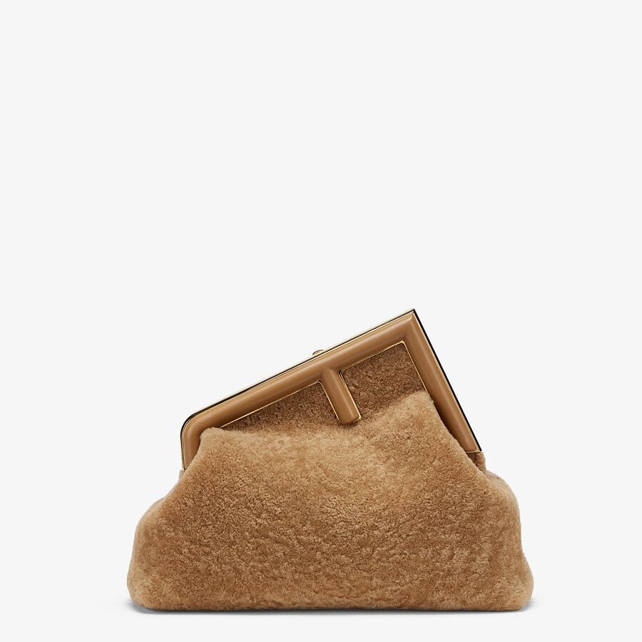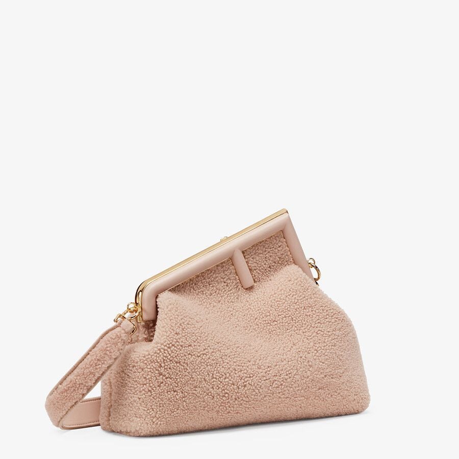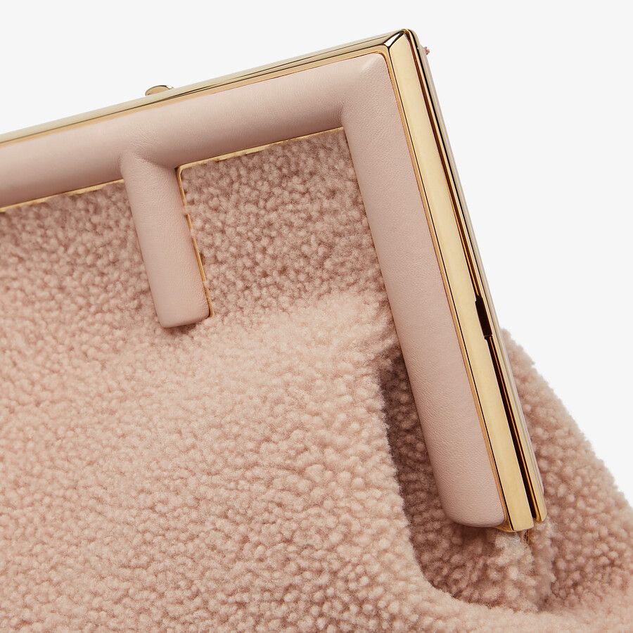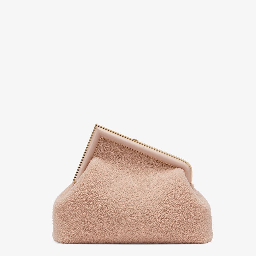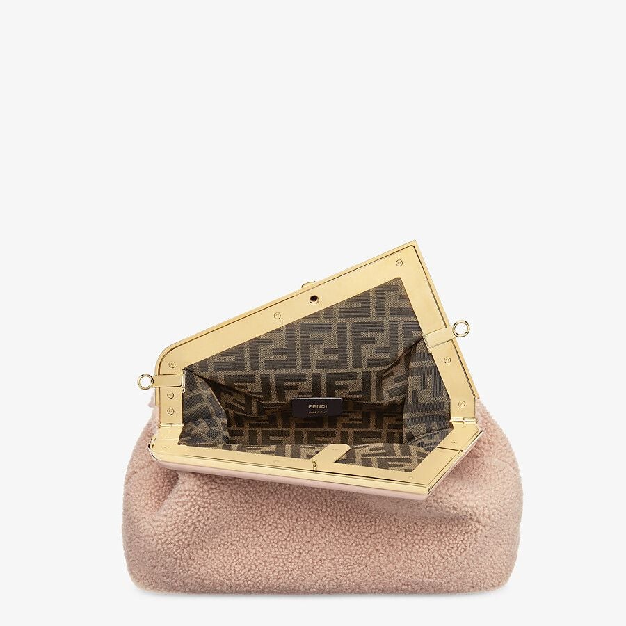 Medium Fendi First bag made of soft, pale pink merino sheepskin with oversized metal F clasp bound in tone on tone nappa leather.