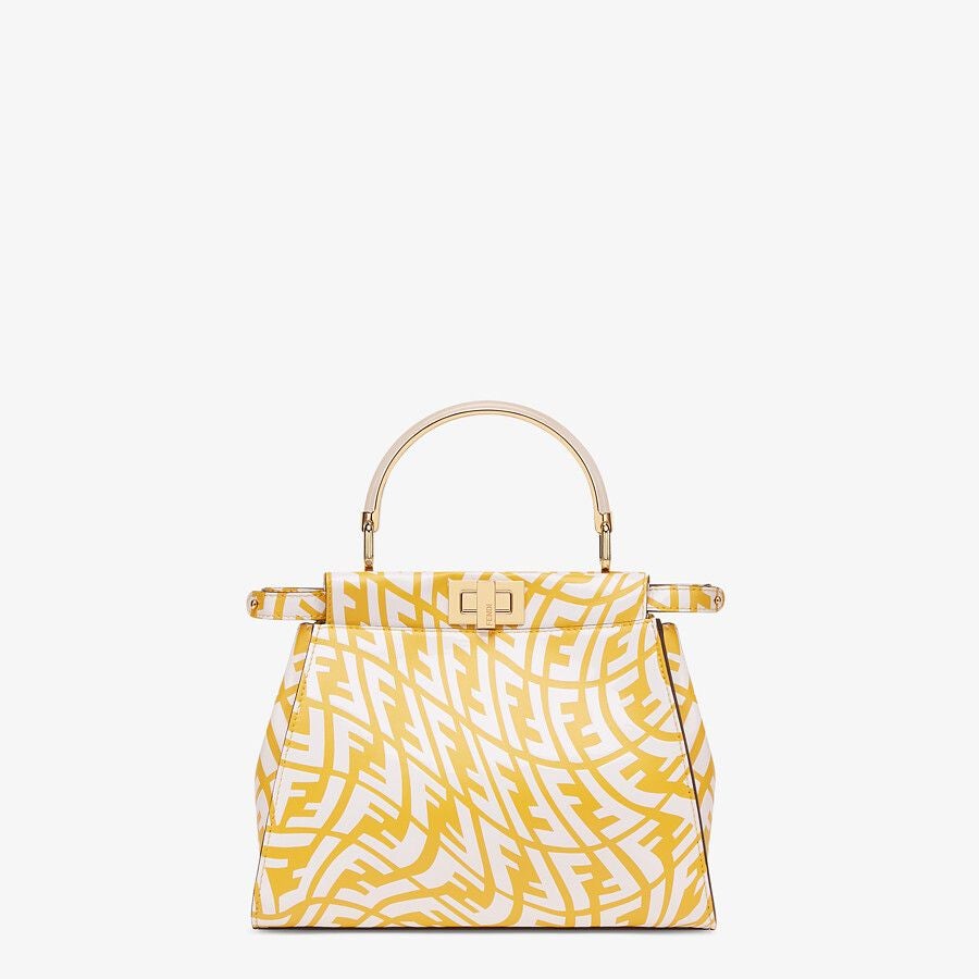 Can be carried by hand or worn either on the shoulder or cross-body thanks to the yellow plexiglass and metal handle and detachable shoulder strap with FF Vertigo print.