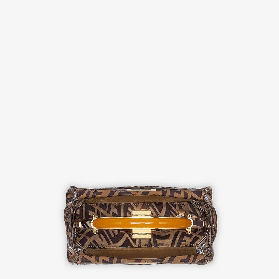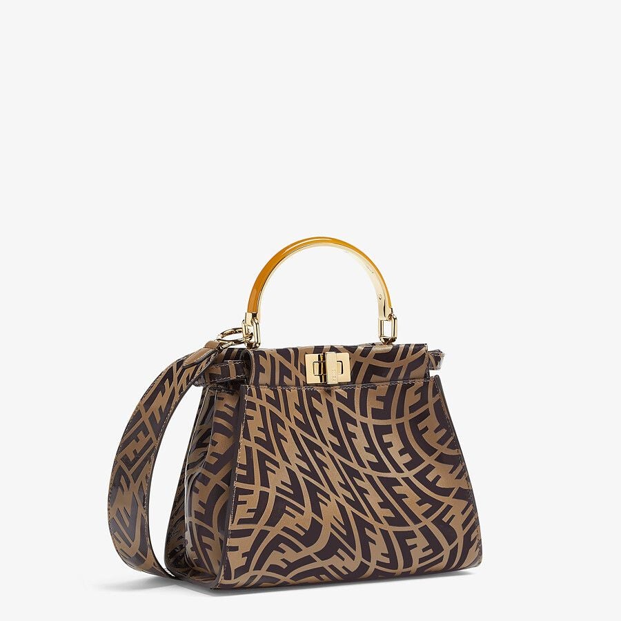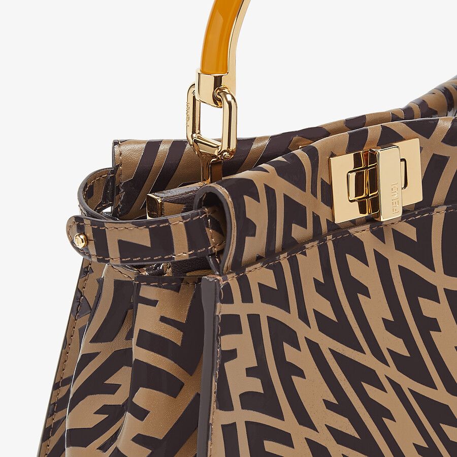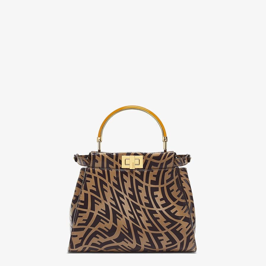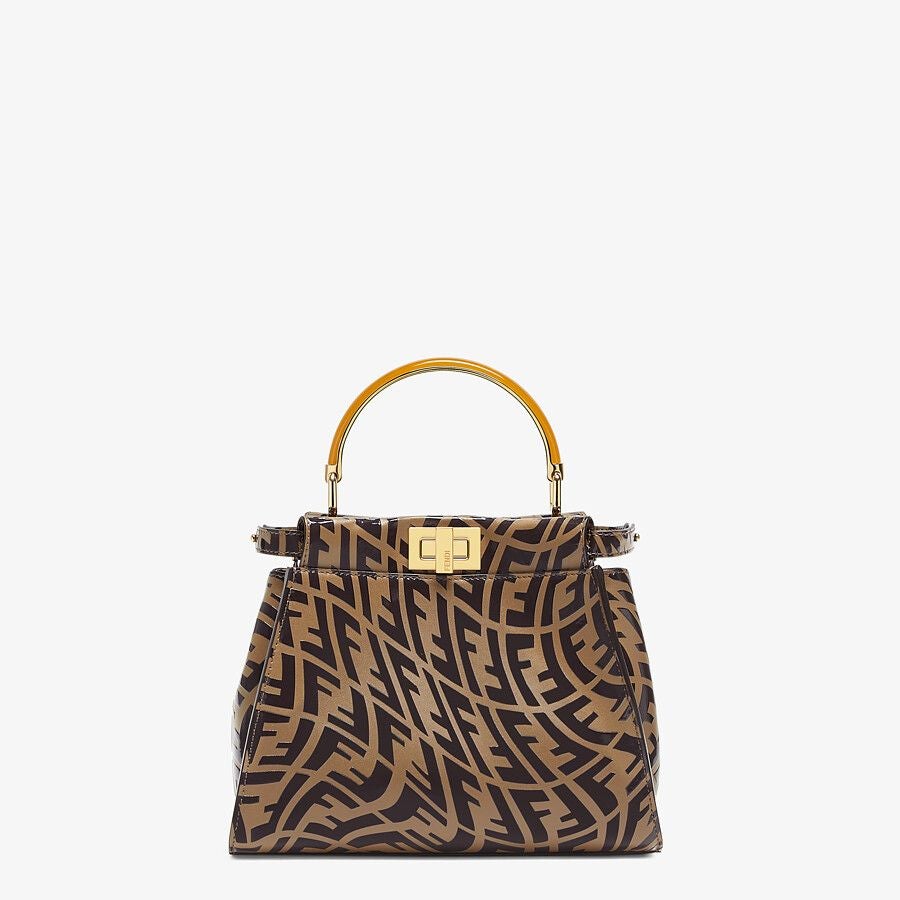 Small, iconic Peekaboo bag in tobacco leather with printed FF Vertigo motif. Decorated with the iconic twist lock on both sides.