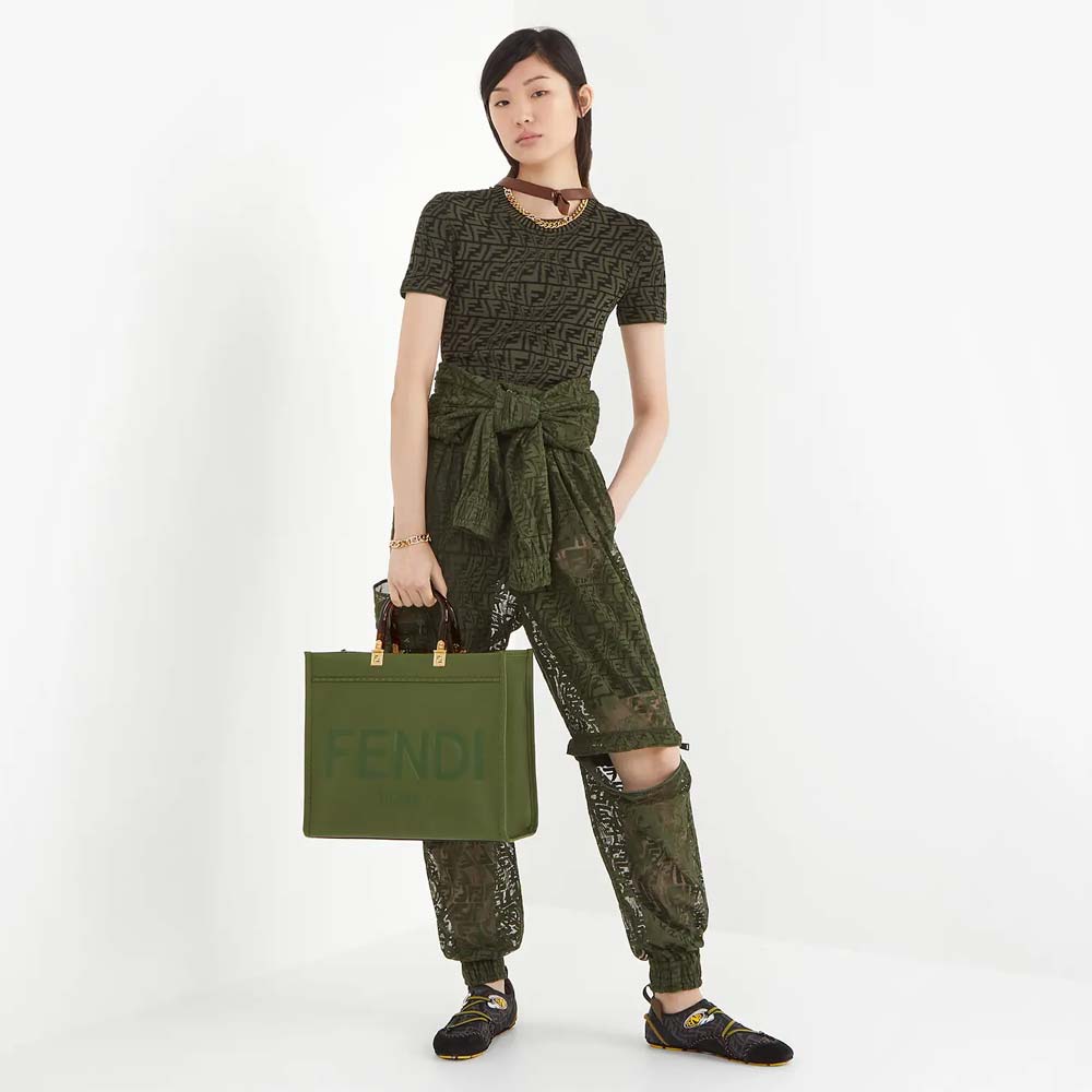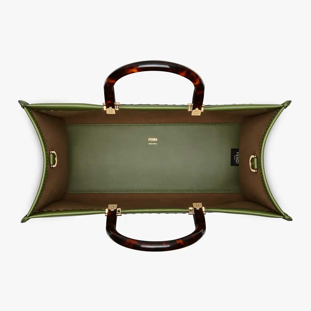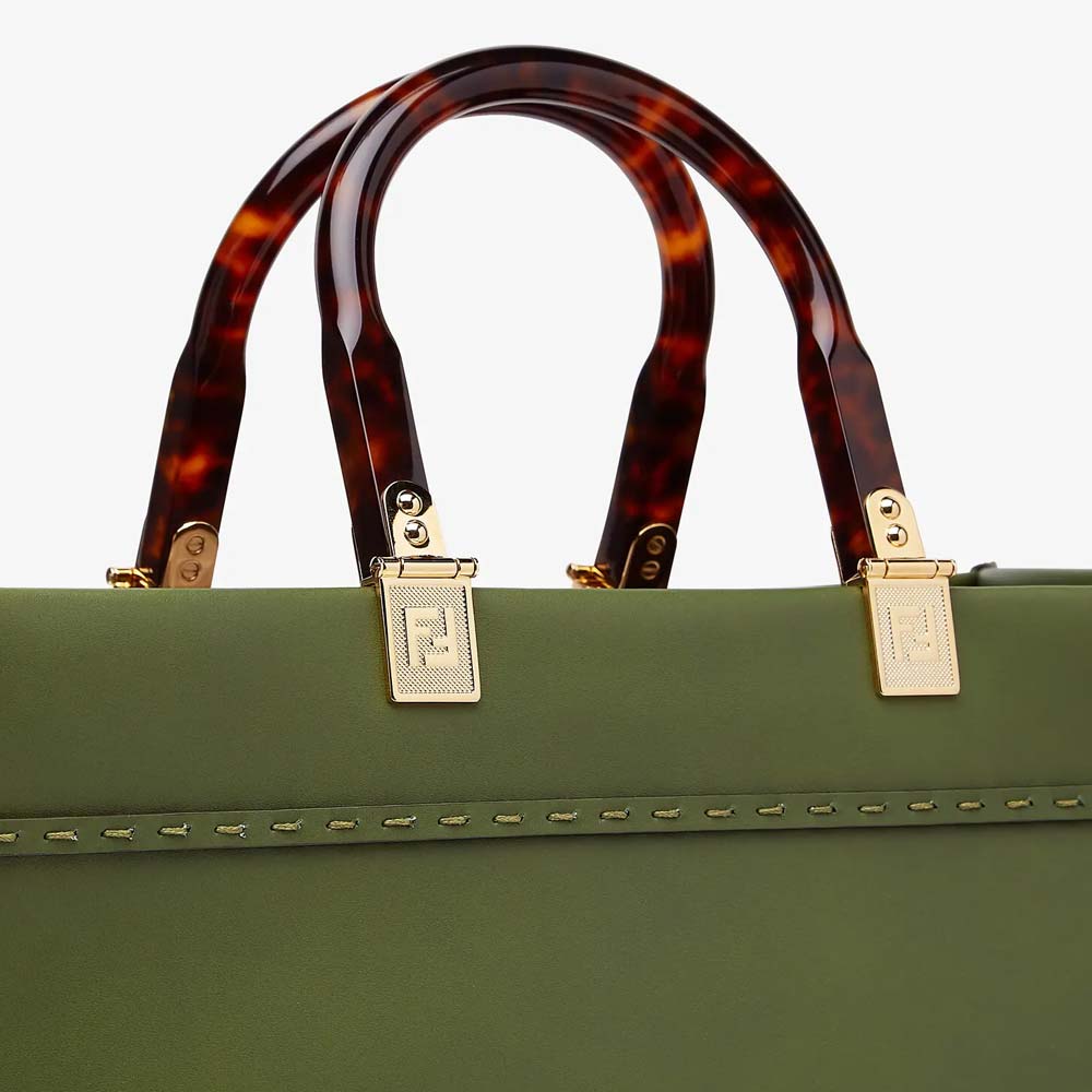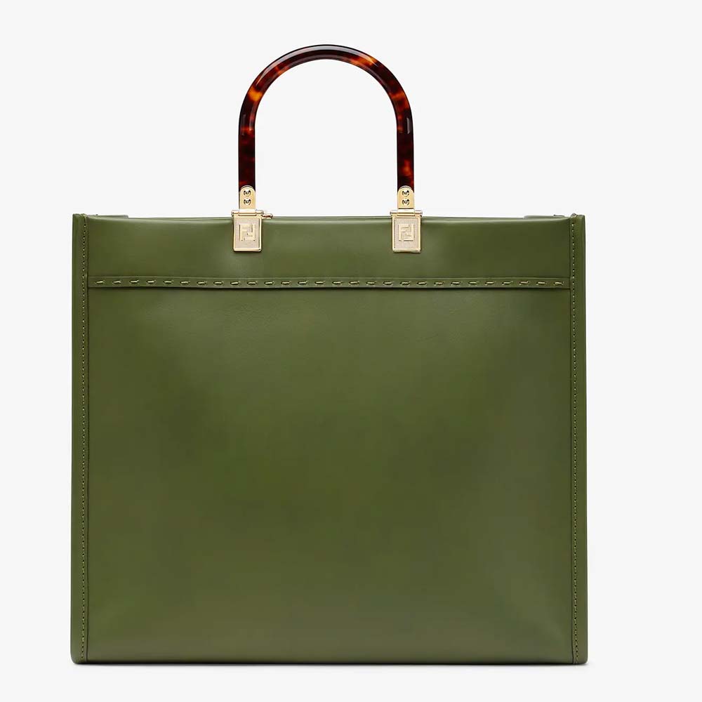 Medium Sunshine Shopper bag made from green leather with hot-stamped “FENDI ROMA” and stiff tortoiseshell effect plexiglass handles.