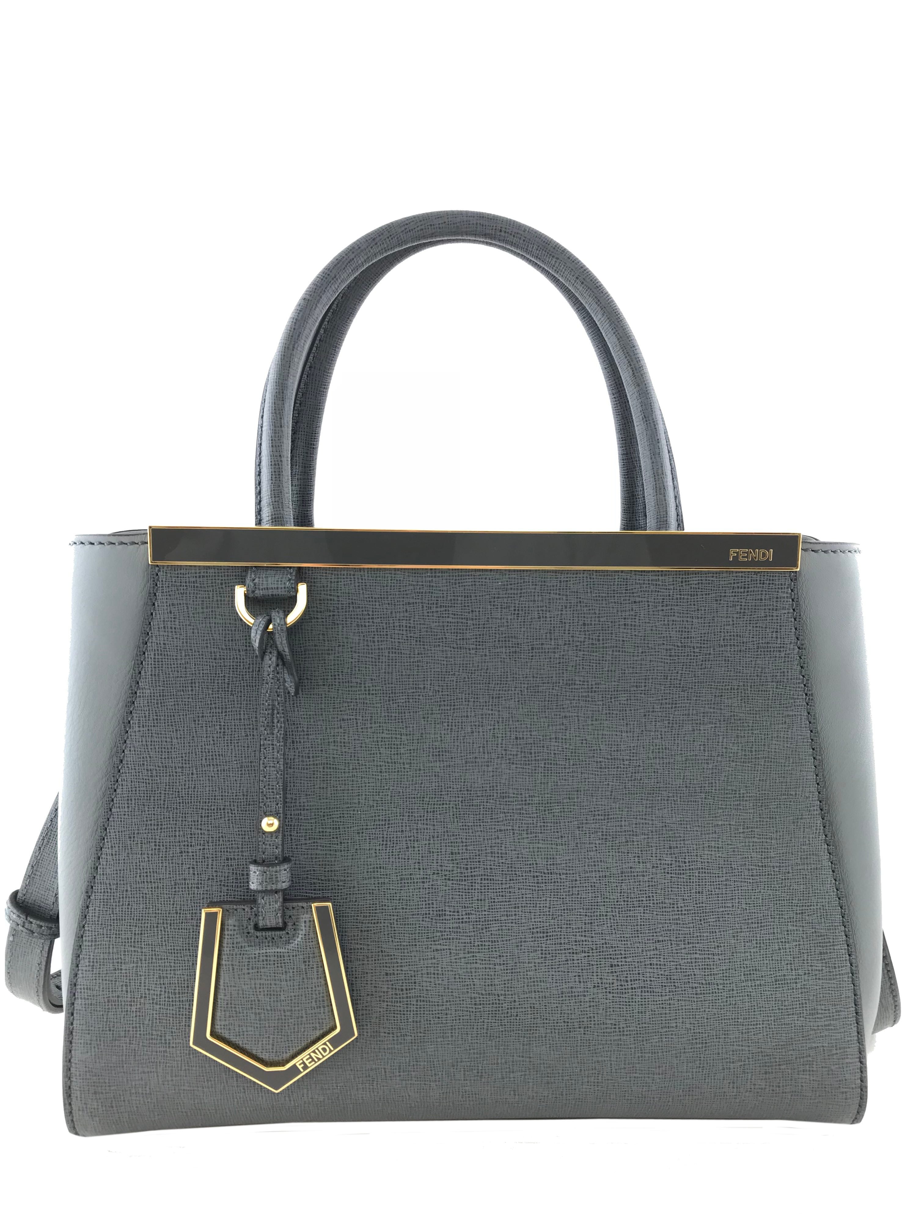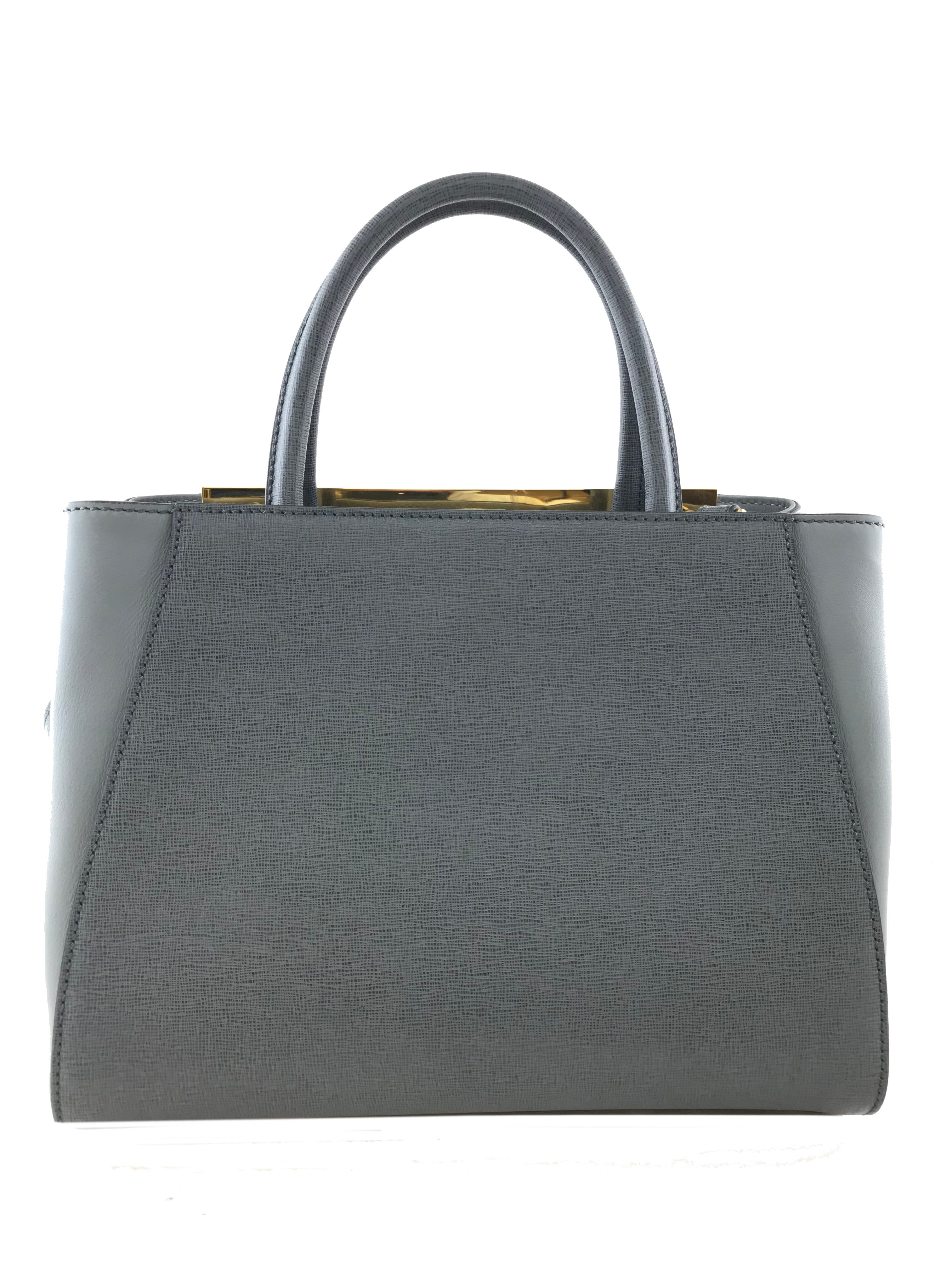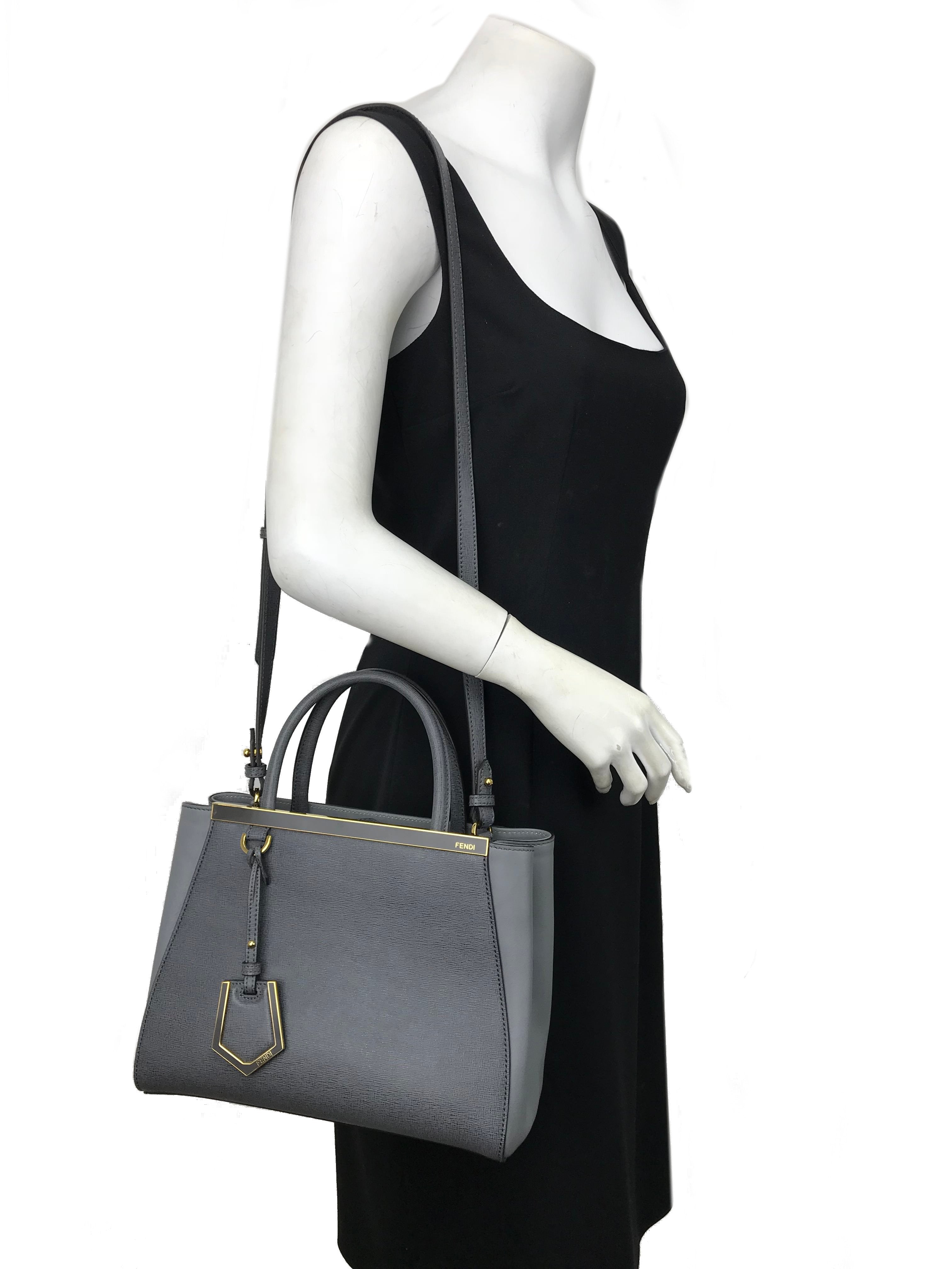 We guarantee the authenticity of this Fendi Vitello Elite Petite 2Jours Tote Bag crafted from two different distinct textured calfskin leathers in gray. Featuring rolled leather top handles, including an optional, adustable shoulder strap,  a logo-engraved brass top frame and a decorative hanging clochette. The interior is divided by a center zip compartment, roomy enough for your essentials.