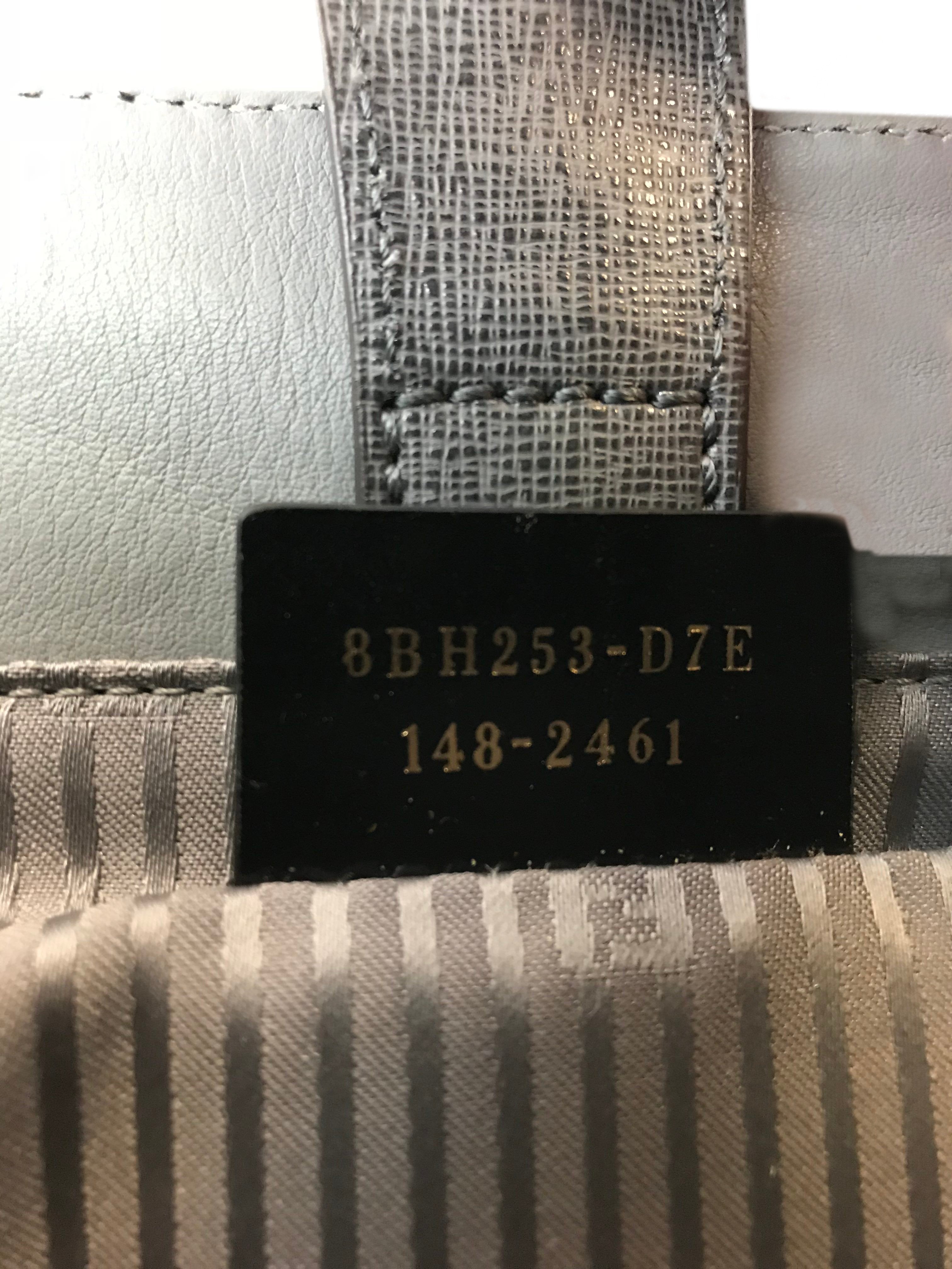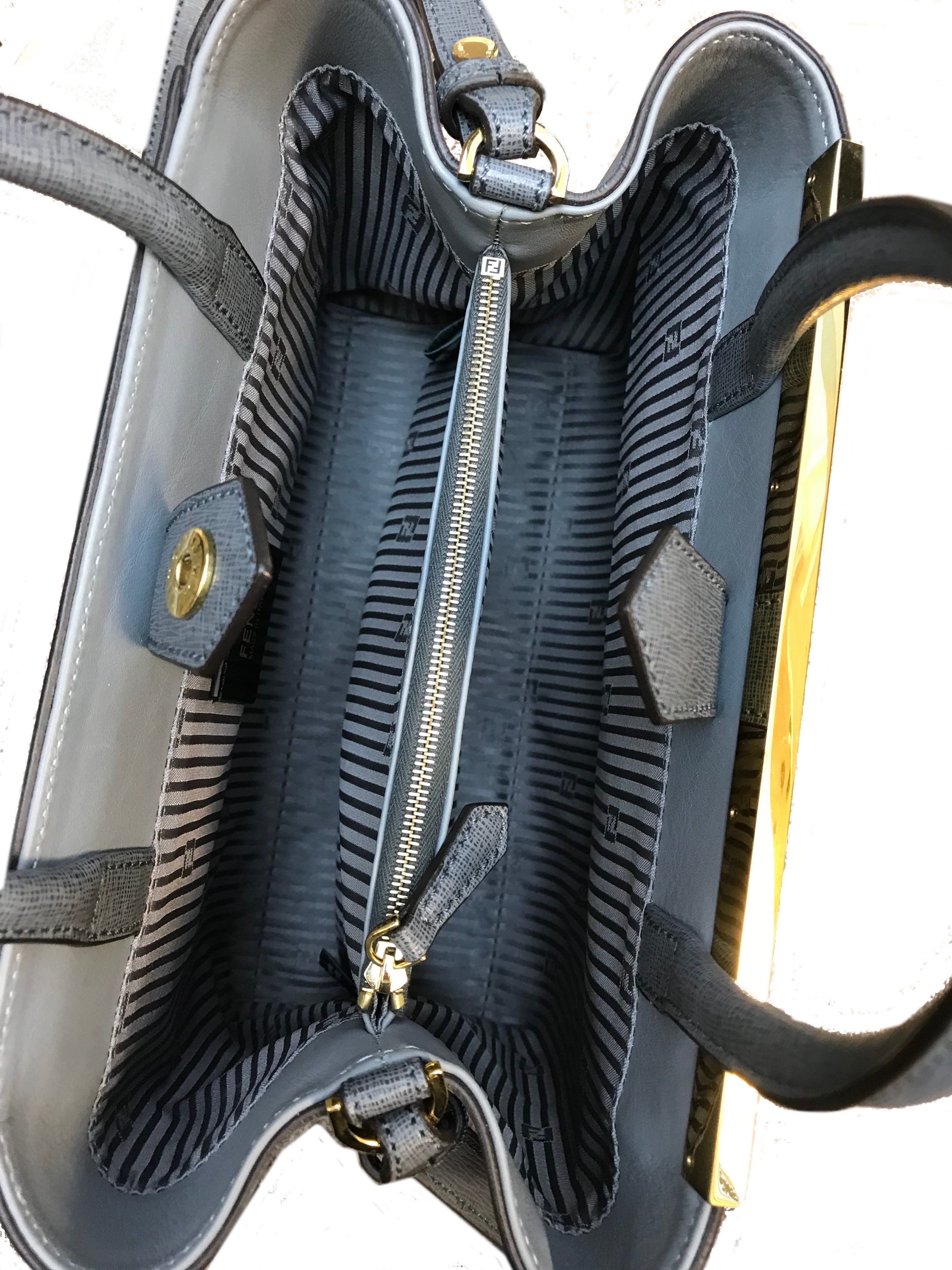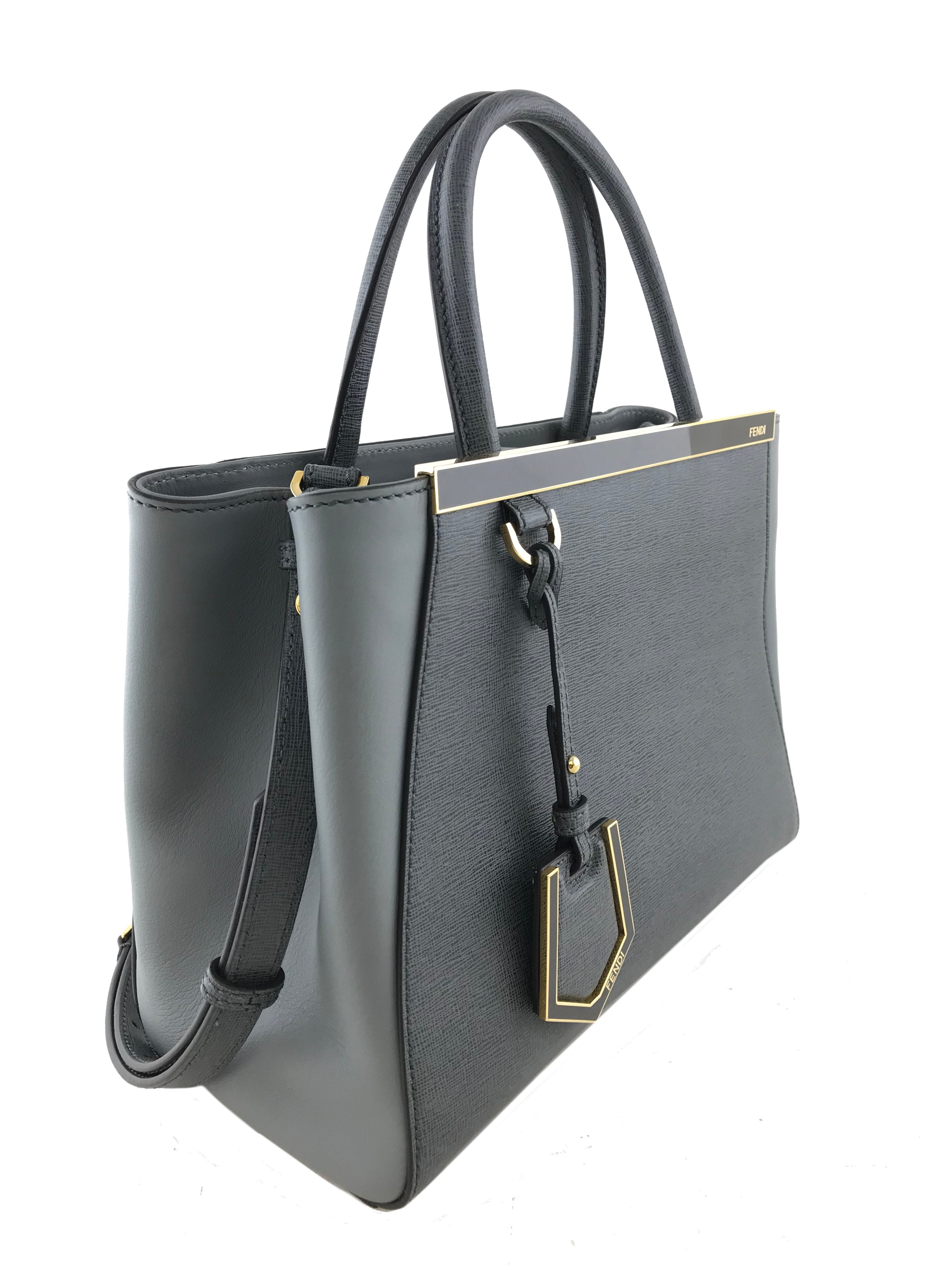 We guarantee the authenticity of this Fendi Vitello Elite Petite 2Jours Tote Bag crafted from two different distinct textured calfskin leathers in gray. Featuring rolled leather top handles, including an optional, adustable shoulder strap,  a logo-engraved brass top frame and a decorative hanging clochette. The interior is divided by a center zip compartment, roomy enough for your essentials.