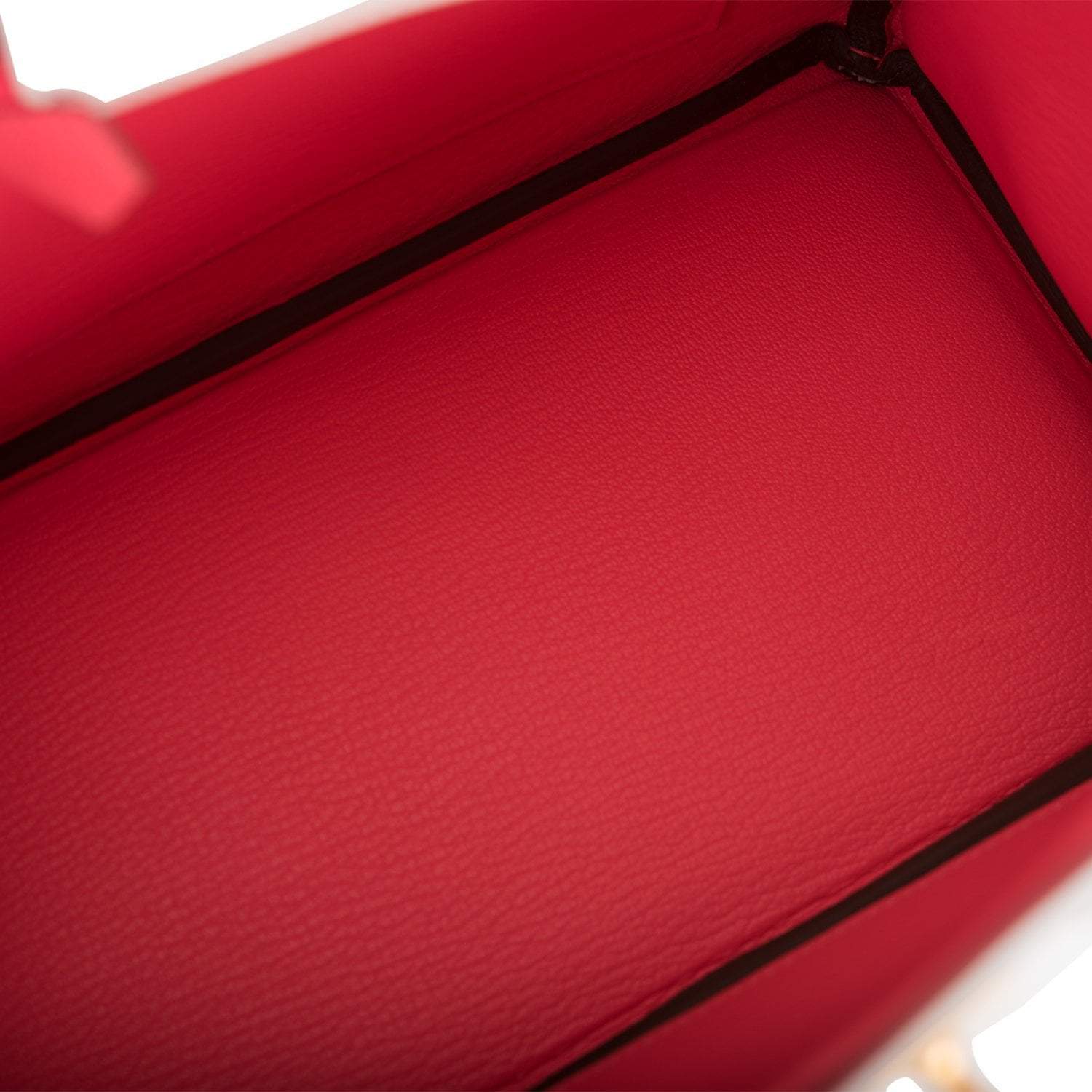 The interior is lined with Rose Azalee chevre and has one zip pocket with an Hermes engraved zipper pull and an open pocket on the opposite side.