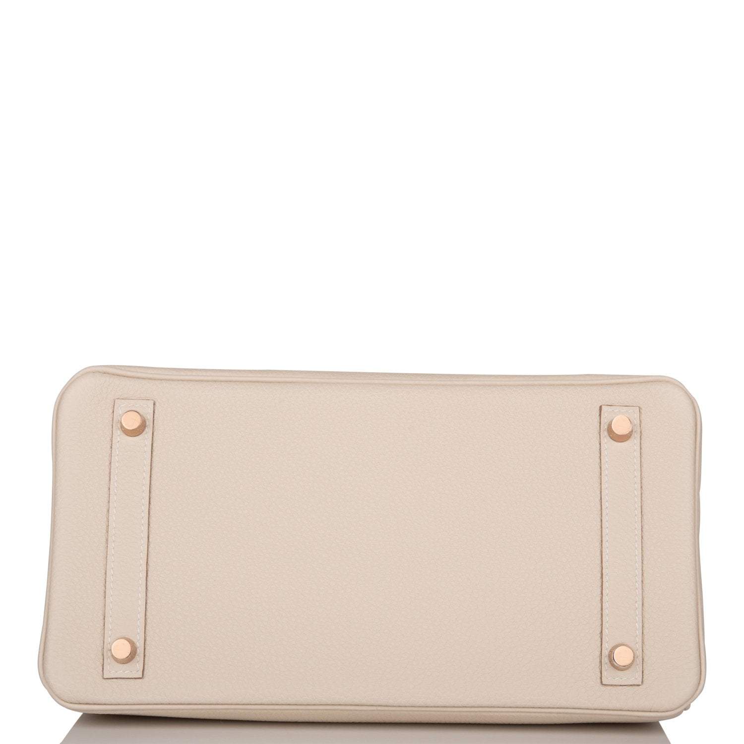 This Birkin is in Craie togo leather with rose gold hardware and has tonal stitching, front flap, two straps with center toggle closure, clochette with lock and two keys, and double rolled handles.
