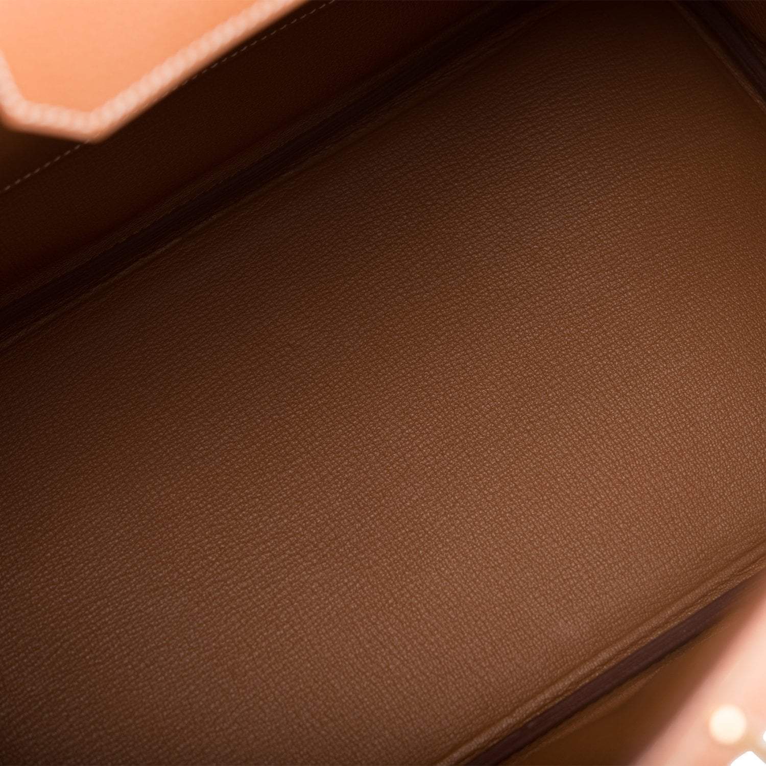 The interior is lined with gold chevre and has one zip pocket with an Hermes engraved zipper pull and an open pocket on the opposite side.