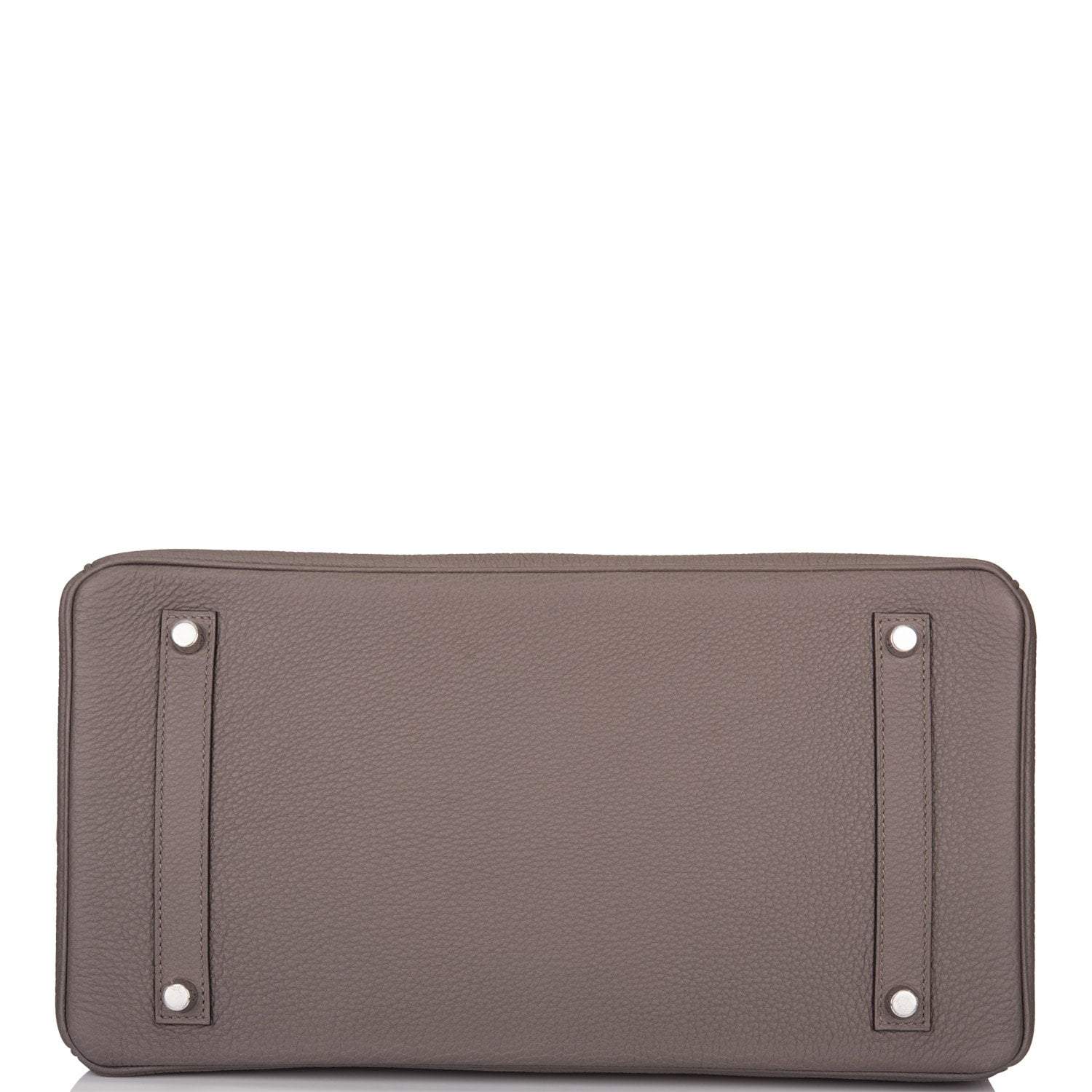 This Birkin is in Etain togo leather with palladium hardware and has tonal stitching, front flap, two straps with center toggle closure, clochette with lock and two keys, and double rolled handles.