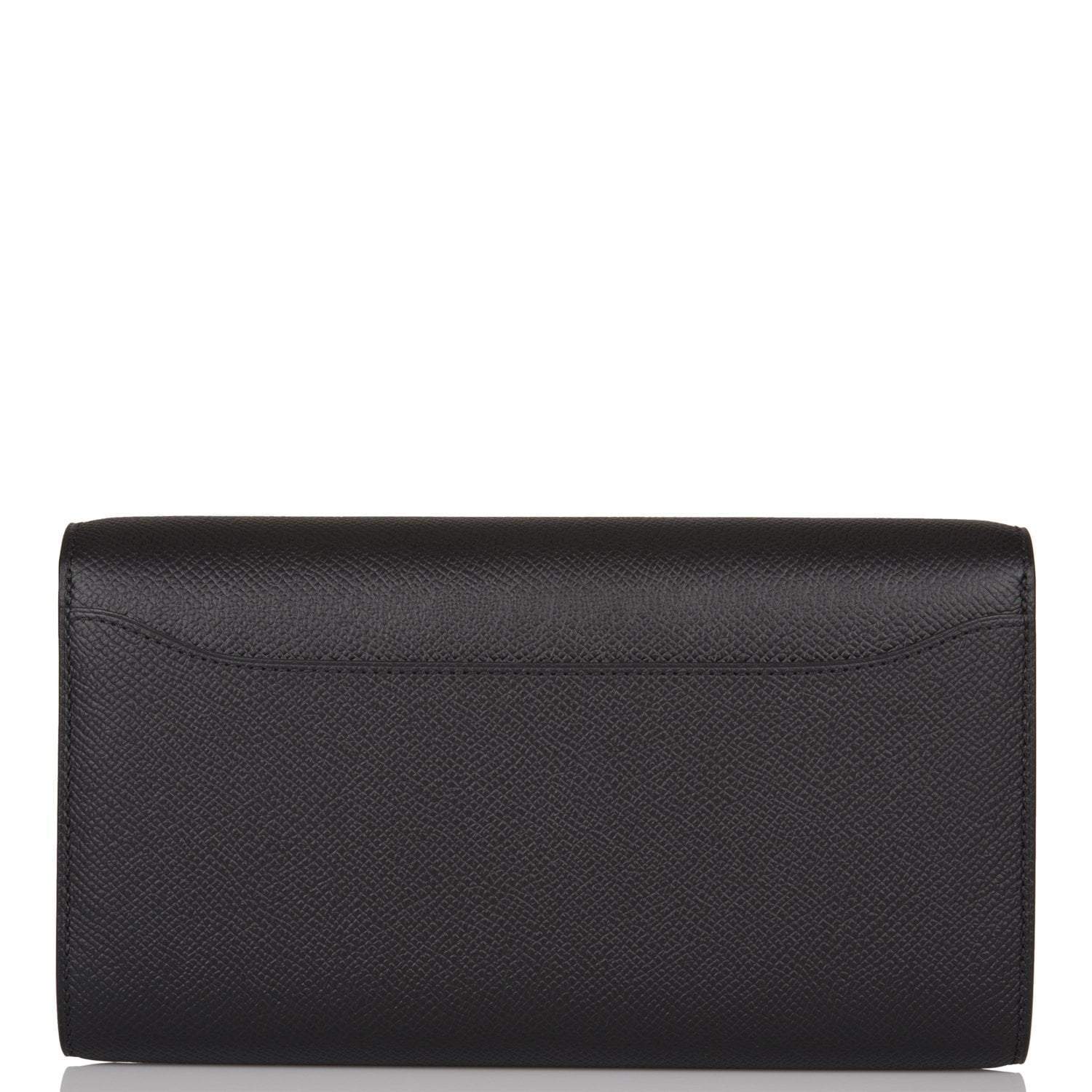 This Constance Wallet To Go is in Black epsom leather with rose gold hardware and has tonal stitching, metal “H” snap lock closure, open front compartment and removable crossbody strap.