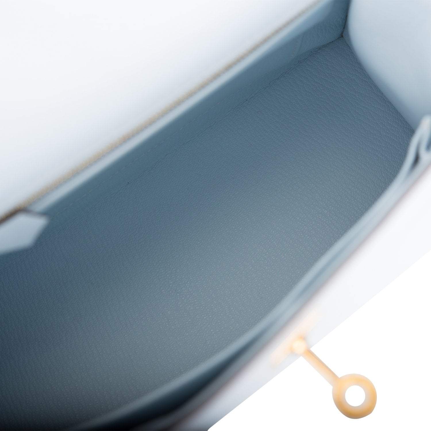 The interior is lined with Bleu Brume chevre leather and has one zip pocket with an Hermes engraved pull and one open pocket on the opposite side.
