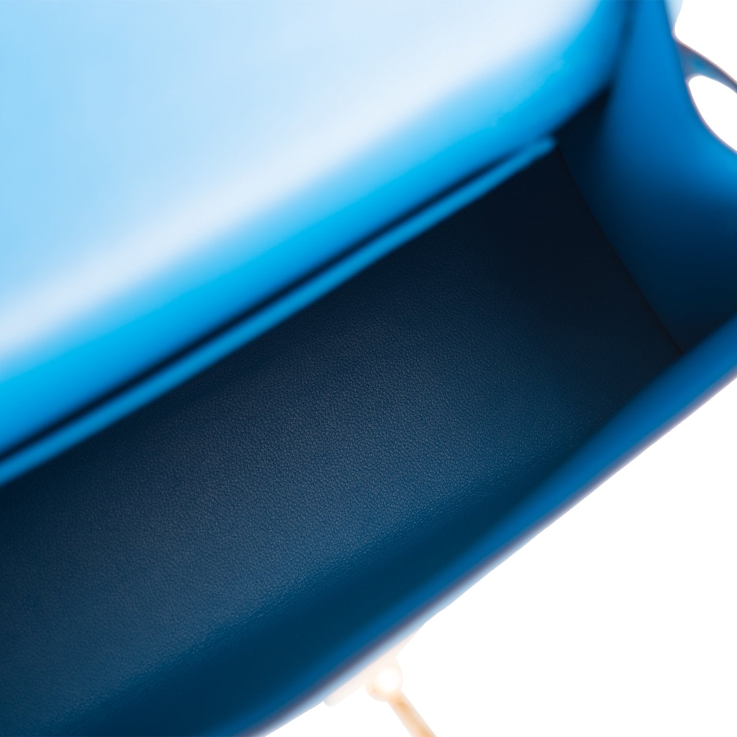 The interior is lined with Bleu Frida lambskin leather and has one open pocket on the back wall.