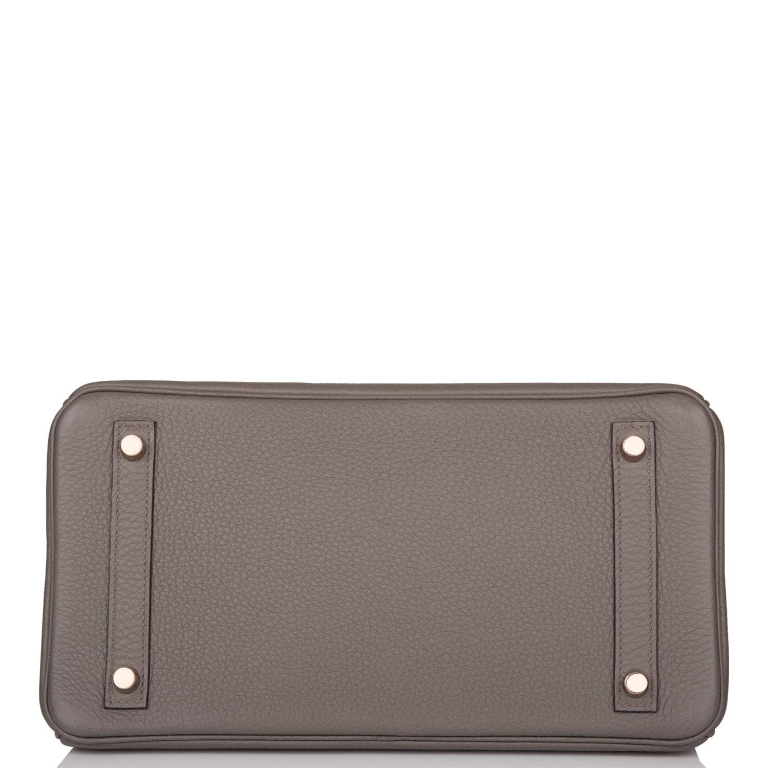 This Birkin is in Etain togo leather with rose gold hardware and has tonal stitching, front flap, two straps with center toggle closure, clochette with lock and two keys, and double rolled handles.