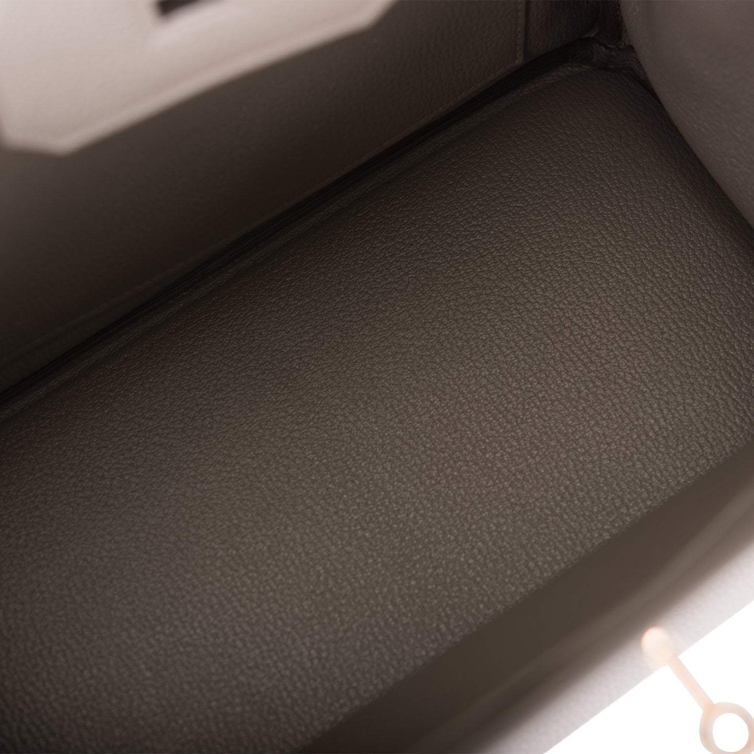 The interior is lined with Etain chevre and has one zip pocket with an Hermes engraved zipper pull and an open pocket on the opposite side.