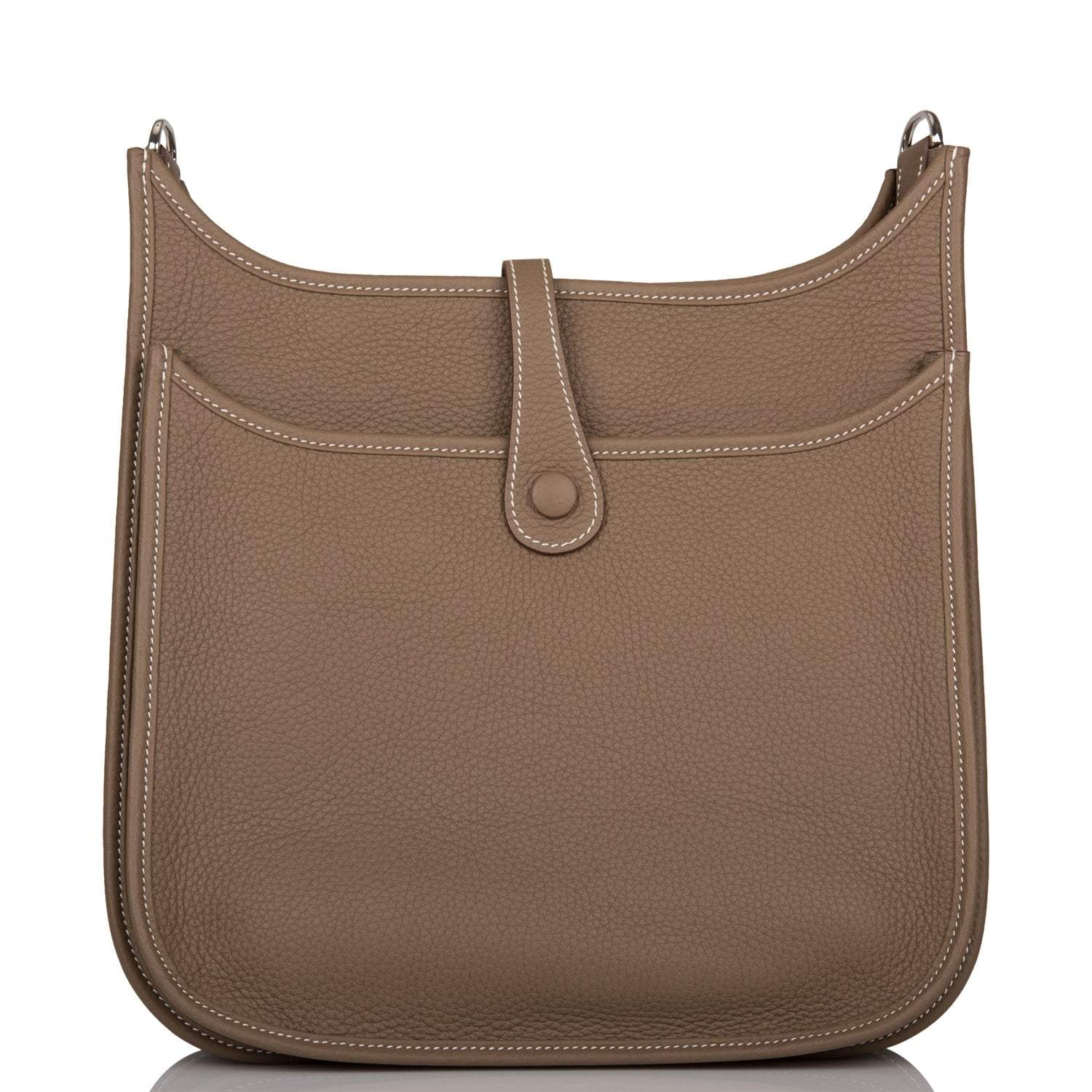 This Evelyne is in Etoupe clemence leather with palladium hardware and has contrast stitching, pull tab top closure and Etoupe removable canvas and leather shoulder/crossbody strap.