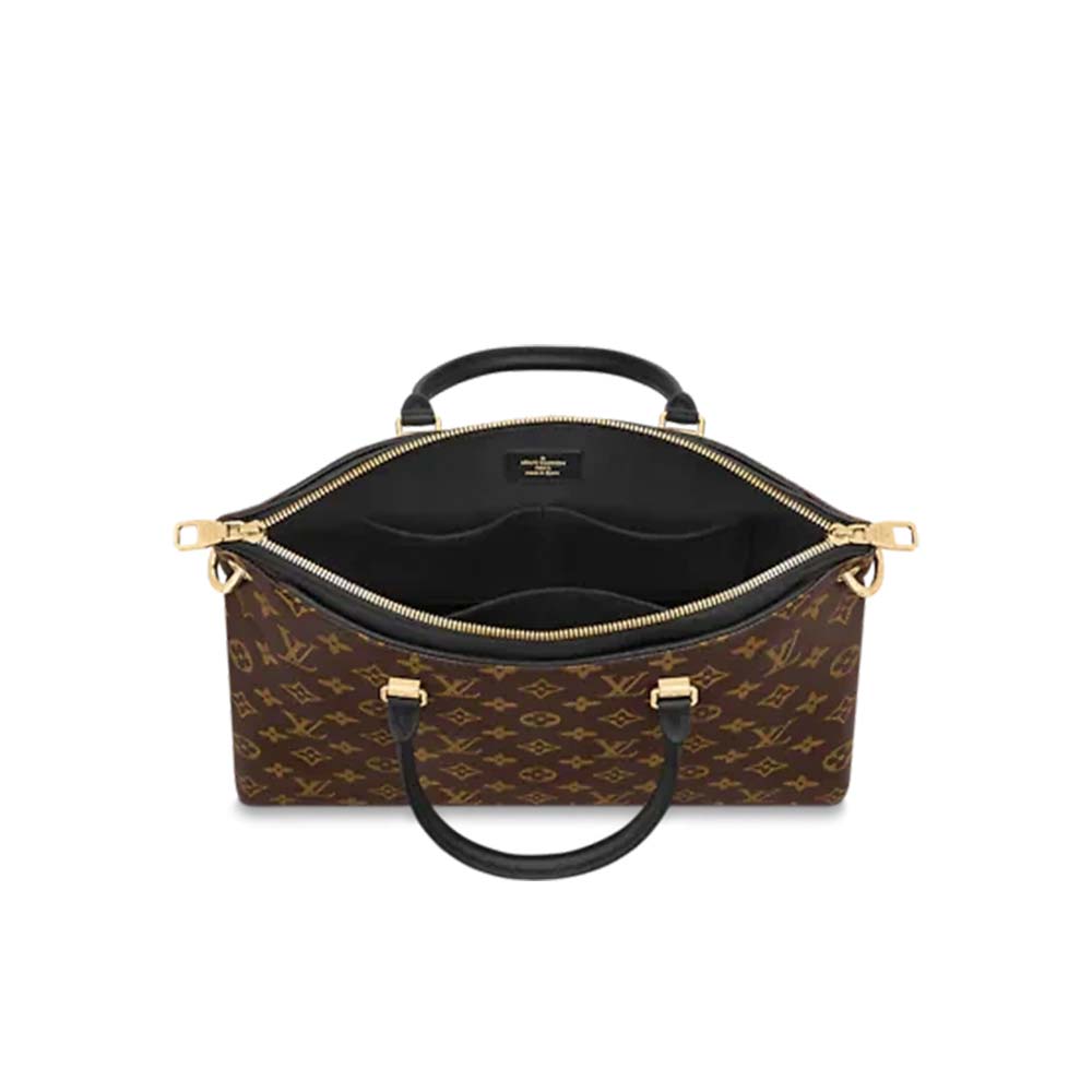 An elegant bag with timeless appeal, the Pallas MM pairs iconic Monogram canvas with supple coloured leather. The handles and gussets are fashioned from smooth calfskin for a luxe allure and the V shape in grained leather at the front is a strong yet subtle signature. This roomy model comes with a detachable, adjustable strap for over-the-shoulder wear.