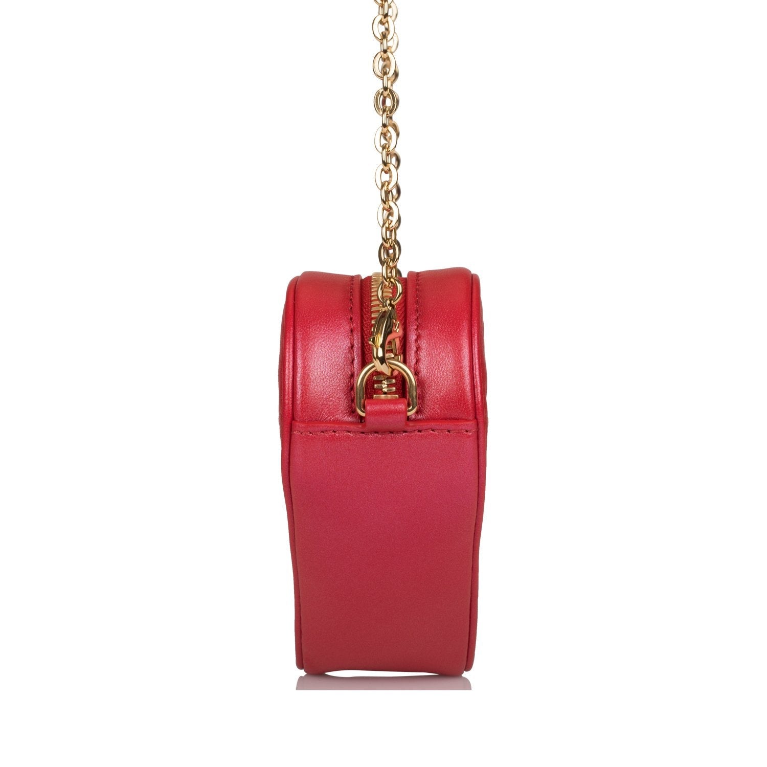 This limited edition Heart on Chain bag is in red embossed lambskin with golden tone hardware and features a removable gold chain which can be used for crossbody or shoulder wear and zip top closure.